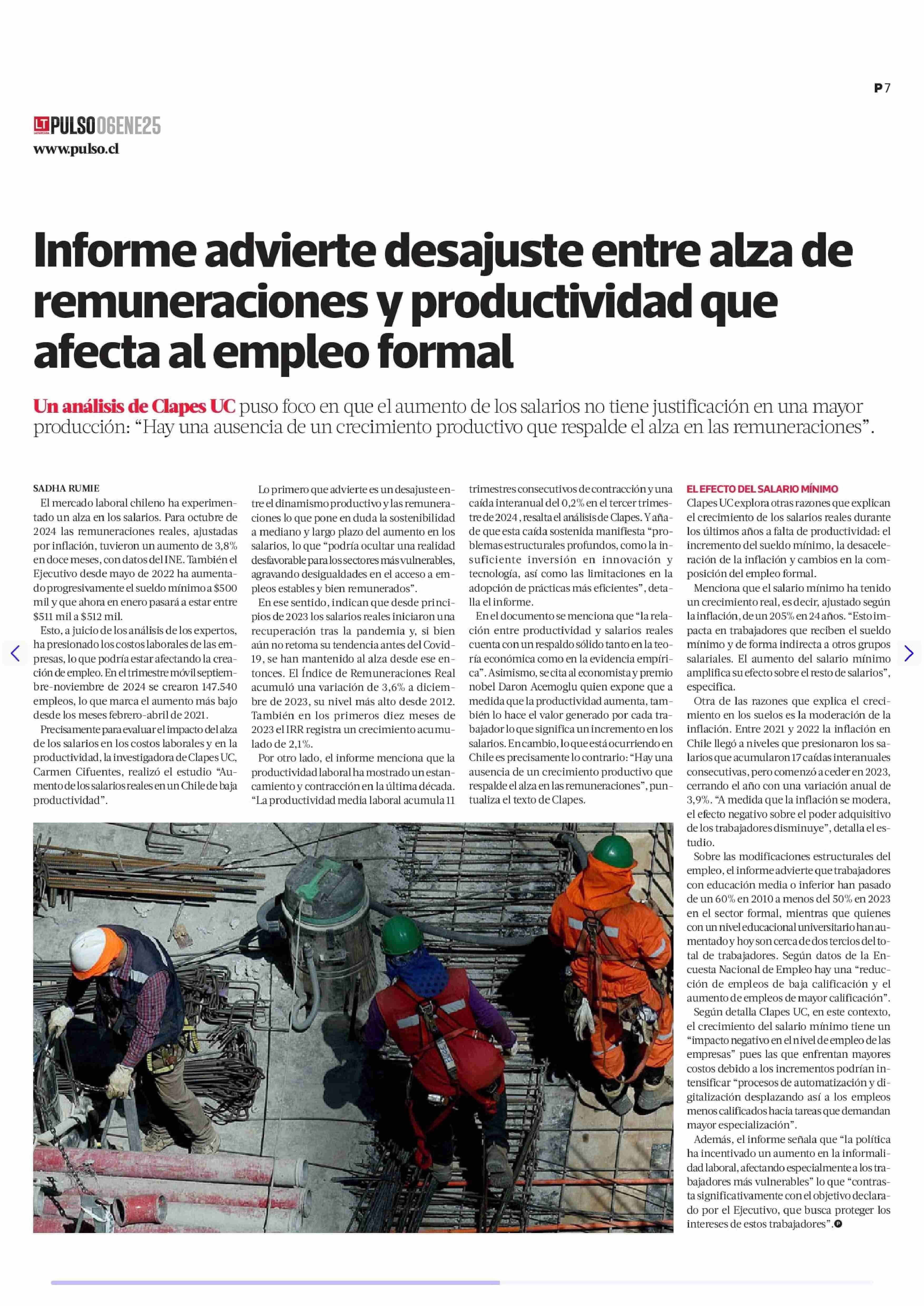 Informe advierte desajuste entre alza de remuneraciones y productividad que afecta al empleo formal 06-01-2025 La Tercera |