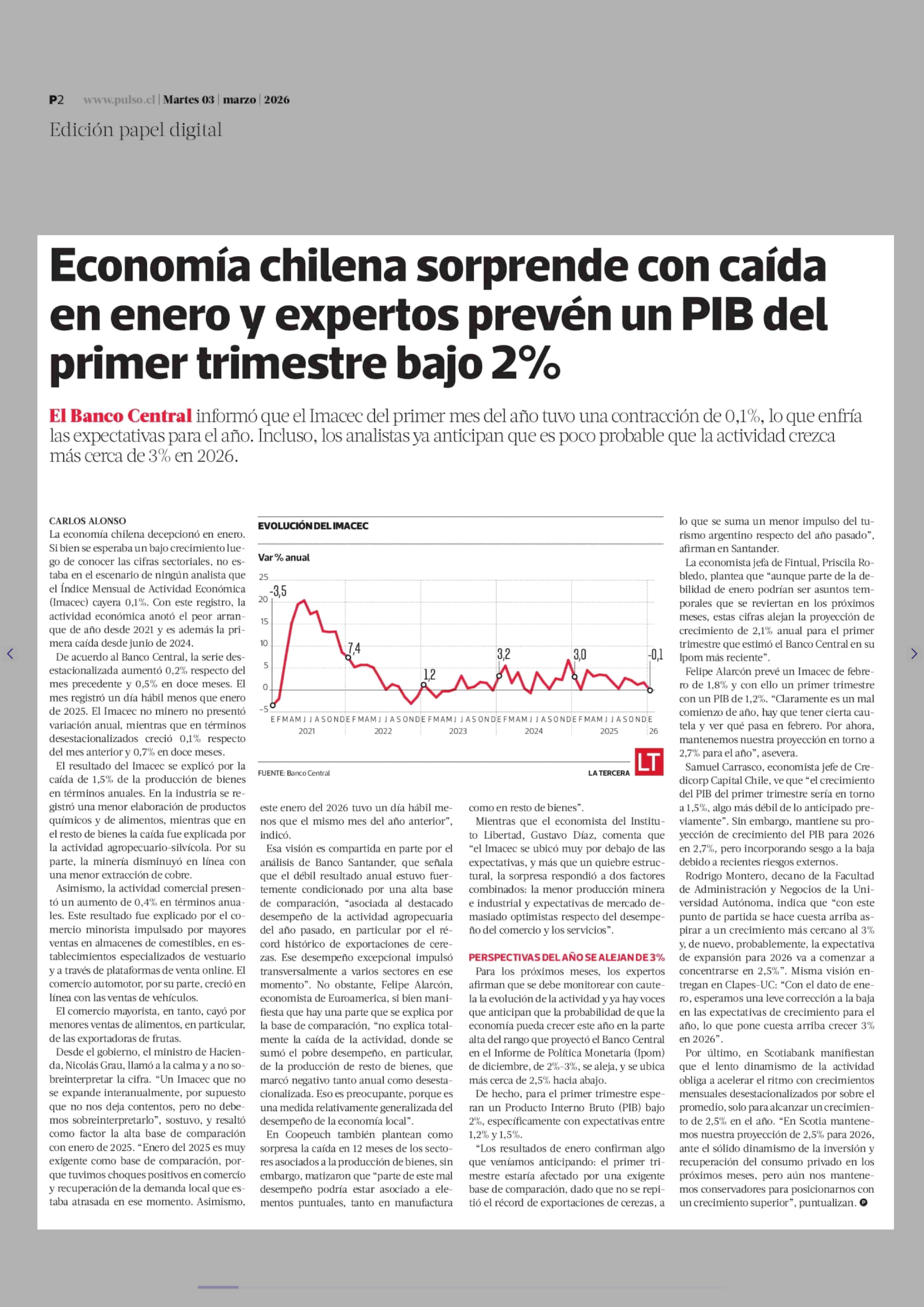 Título: Economía chilena sorprende con caída en enero y expertos prevén un PIB del primer trimestre bajo 2%