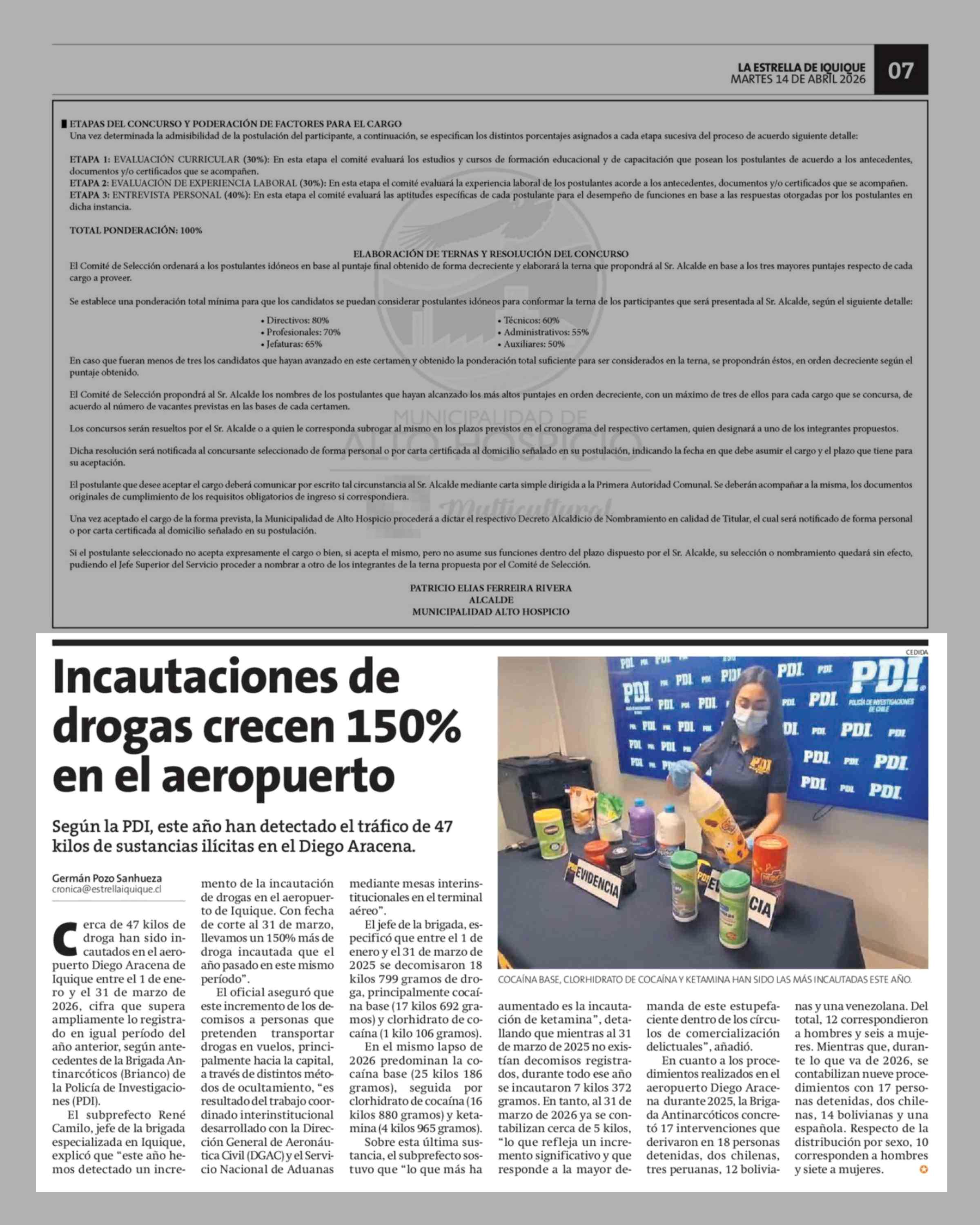 Incautaciones de drogas crecen 150% en el aeropuerto 14-04-2026 La Estrella de Iquique |
