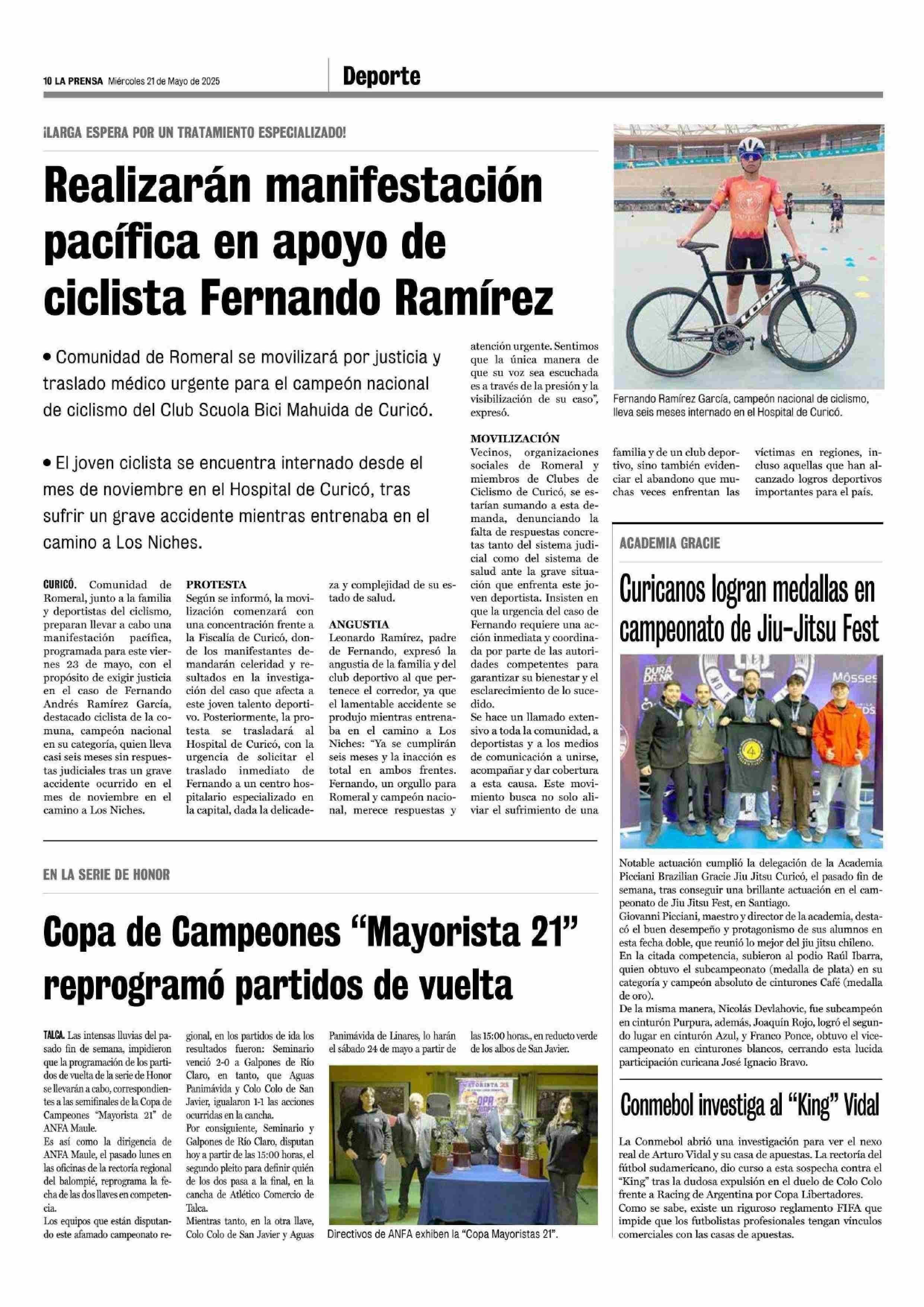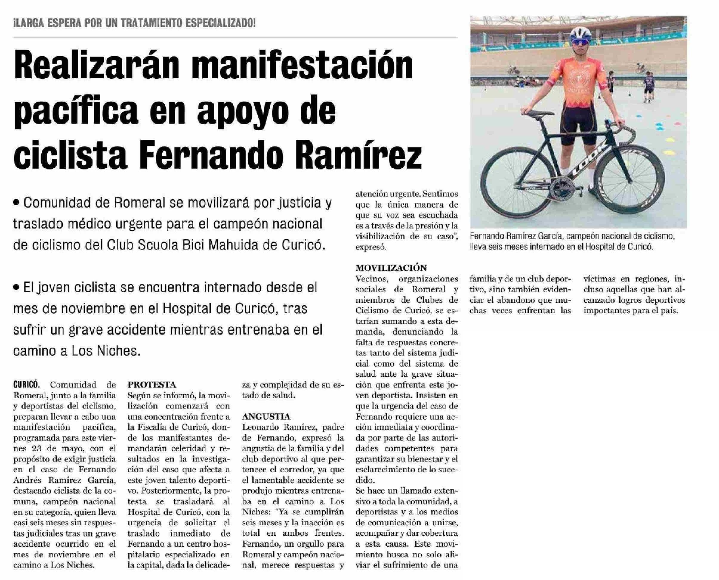 Realizarán manifestación pacífica en apoyo de ciclista Fernando Ramírez 21-05-2025 La Prensa de Curicó |