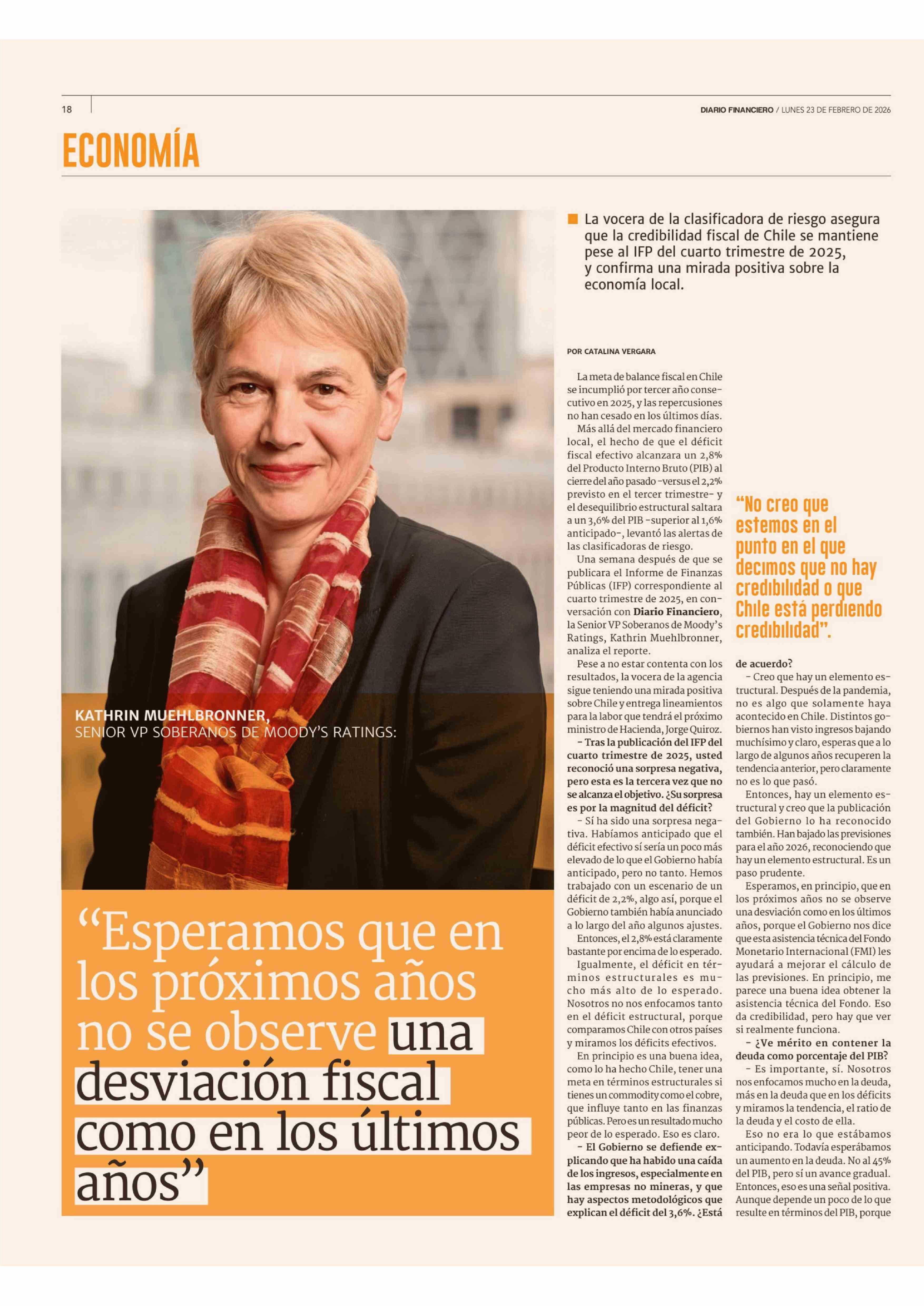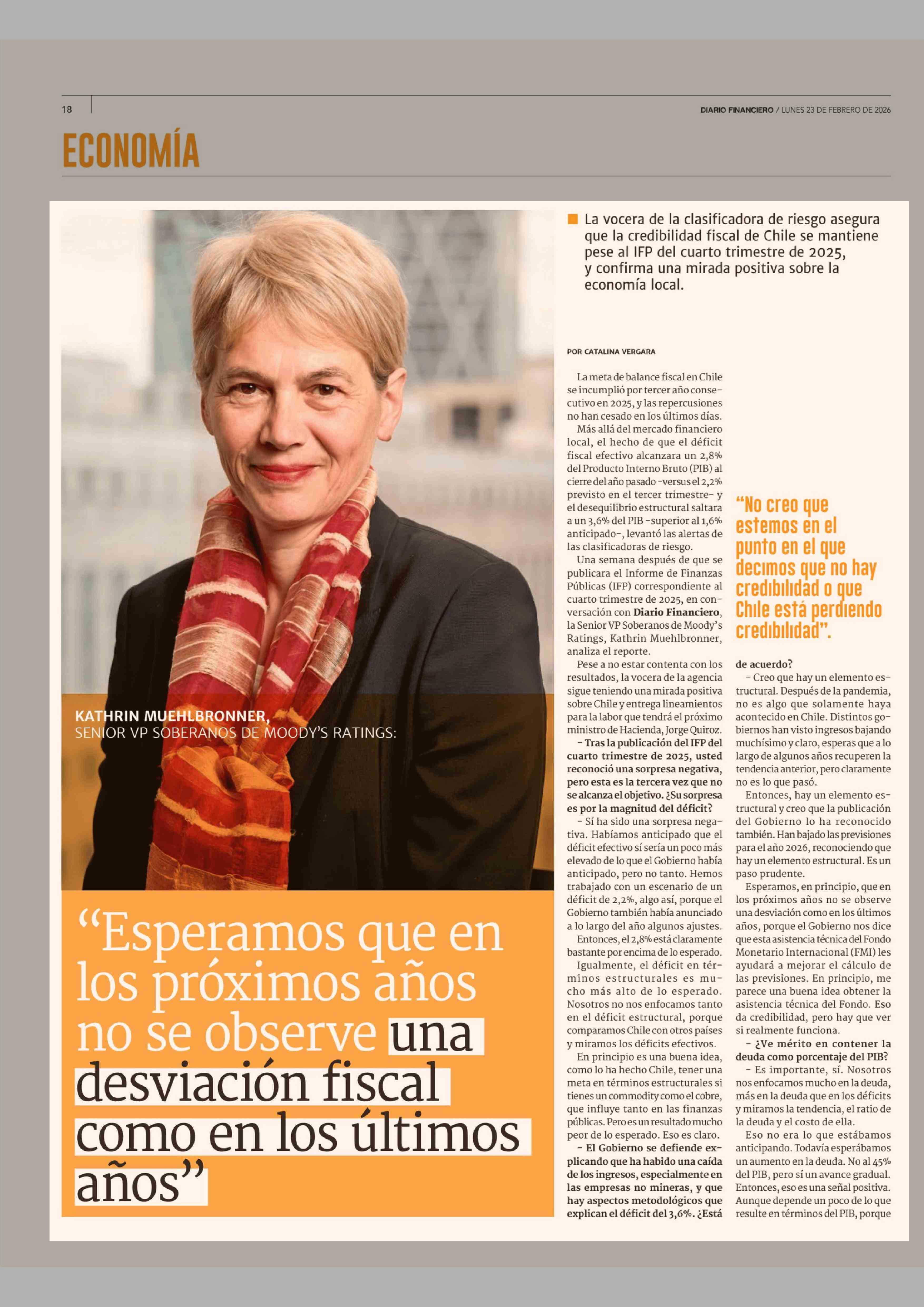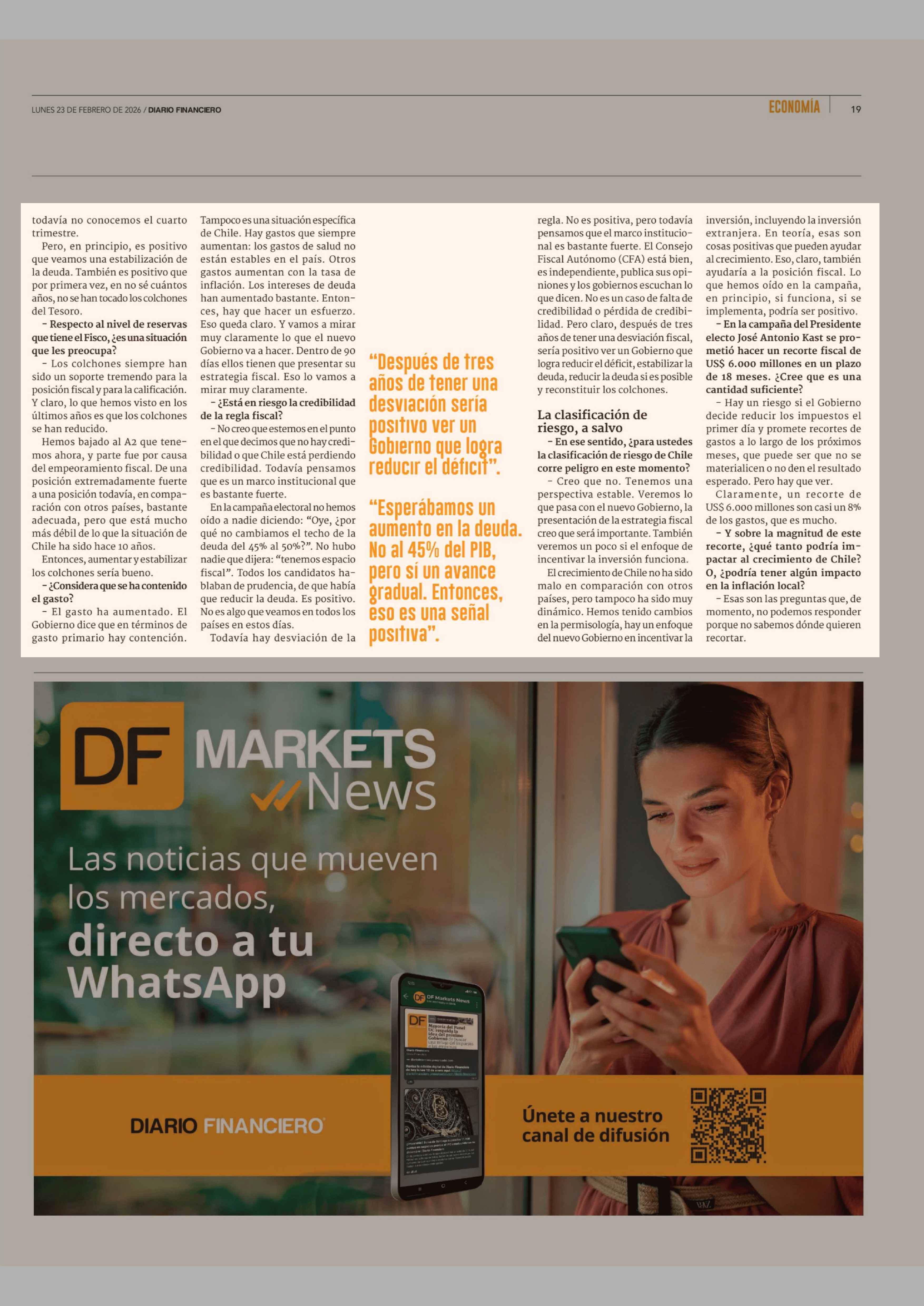 "'Esperamos que en los próximos años no se observe una desviación fiscal como en los últimos años" 23-02-2026 Diario Financiero |