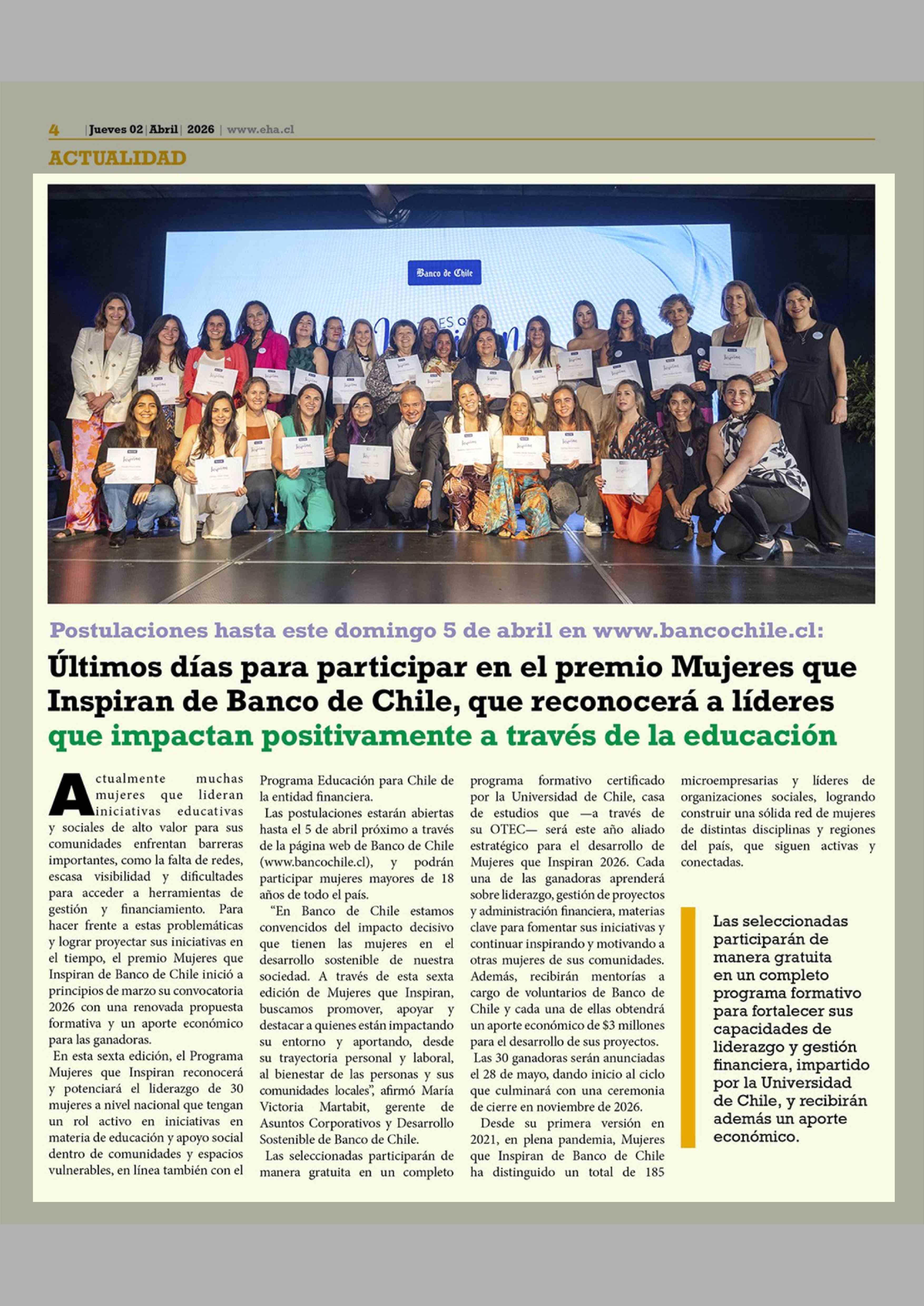 Últimos días para participar en el premio Mujeres que Inspiran de Banco de Chile, que reconocerá a líderes que impactan positivamente a través de la educación 02-04-2026 El Heraldo Austral |
