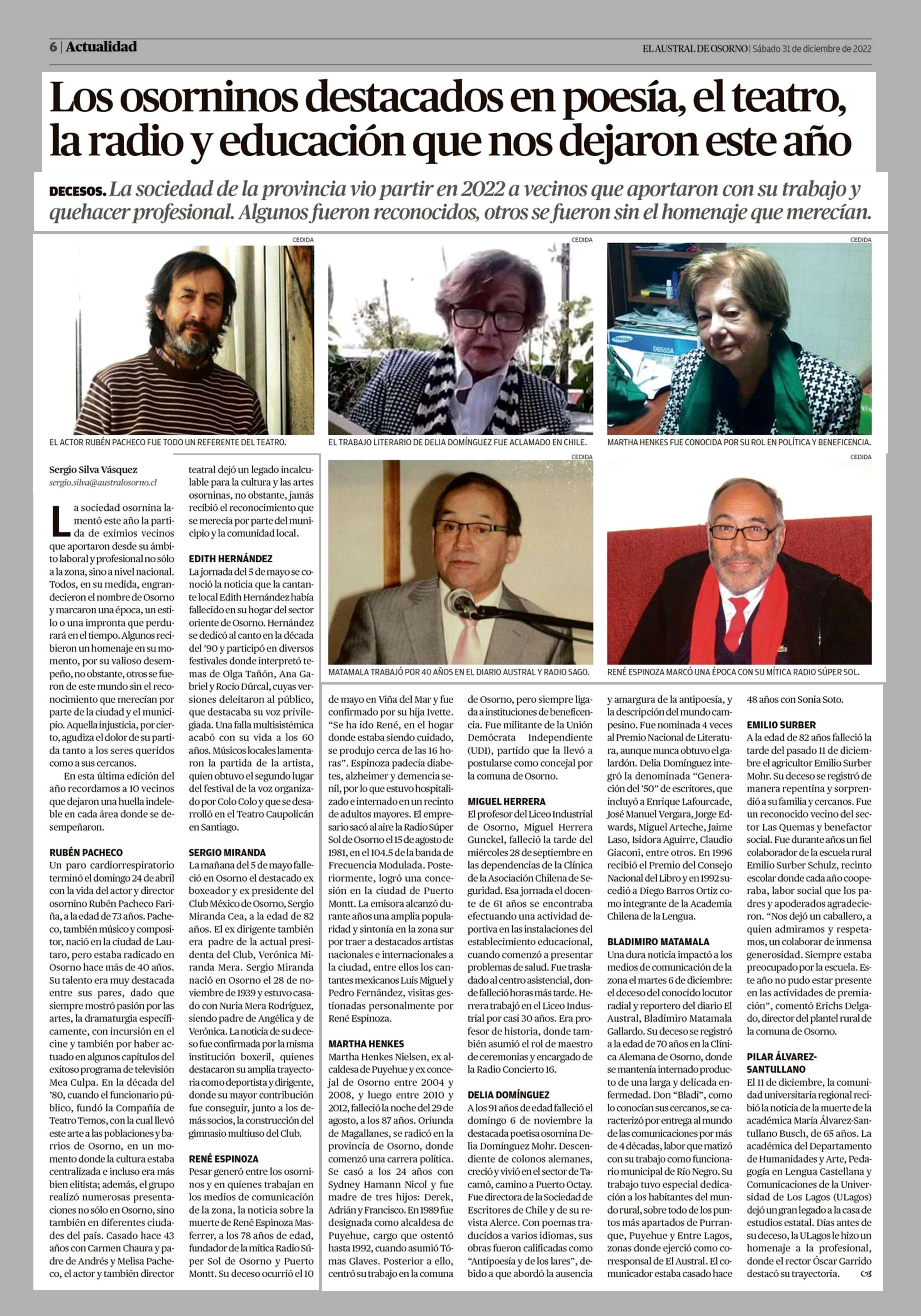 Los osorninos destacados en poesía, el teatro, la radio y educación que nos dejaron este año 31-12-2022 El Austral de Osorno |