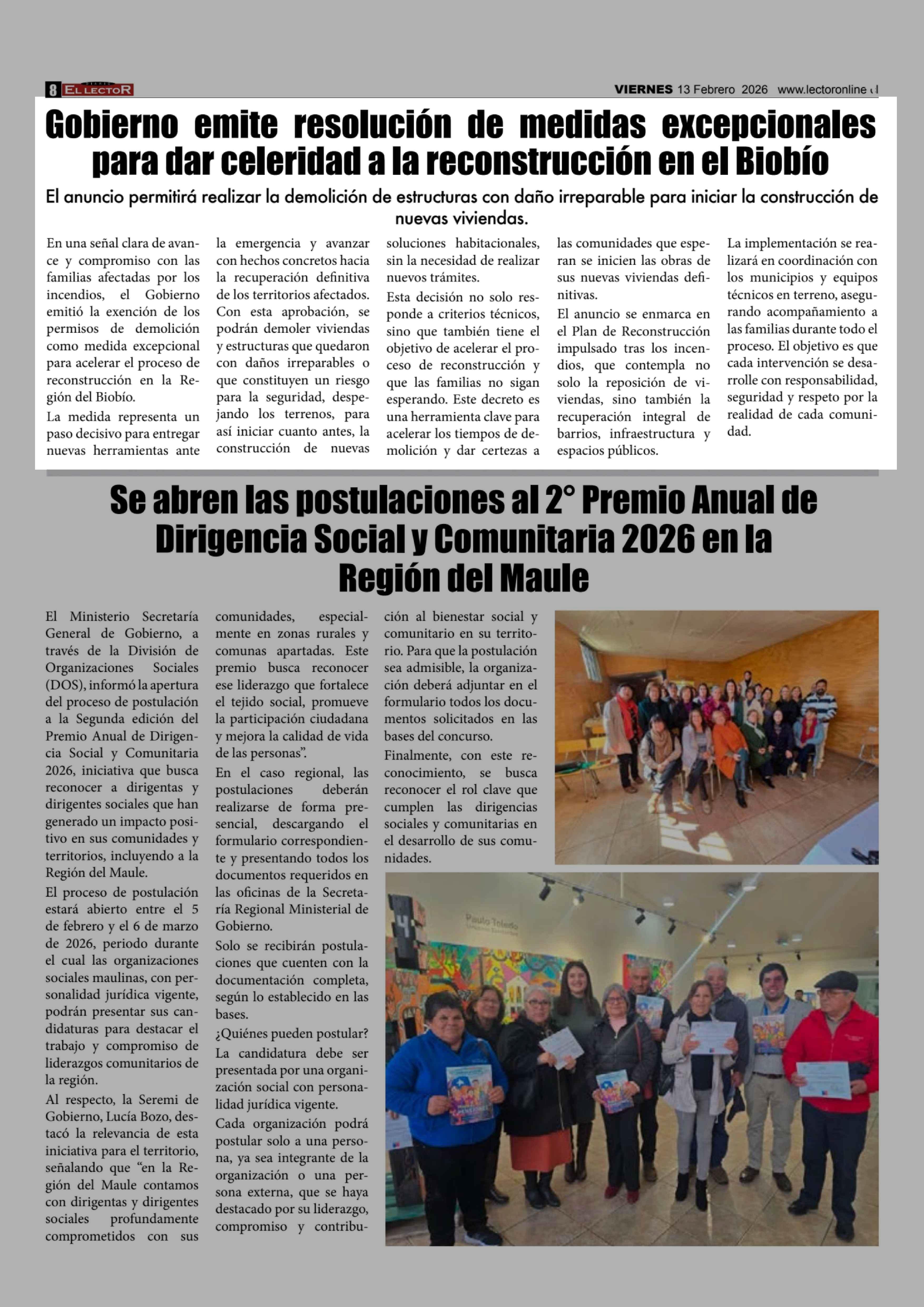 Gobierno emite resolución de medidas excepcionales para dar celeridad a la reconstrucción en el Biobio 13-02-2026 El Lector |