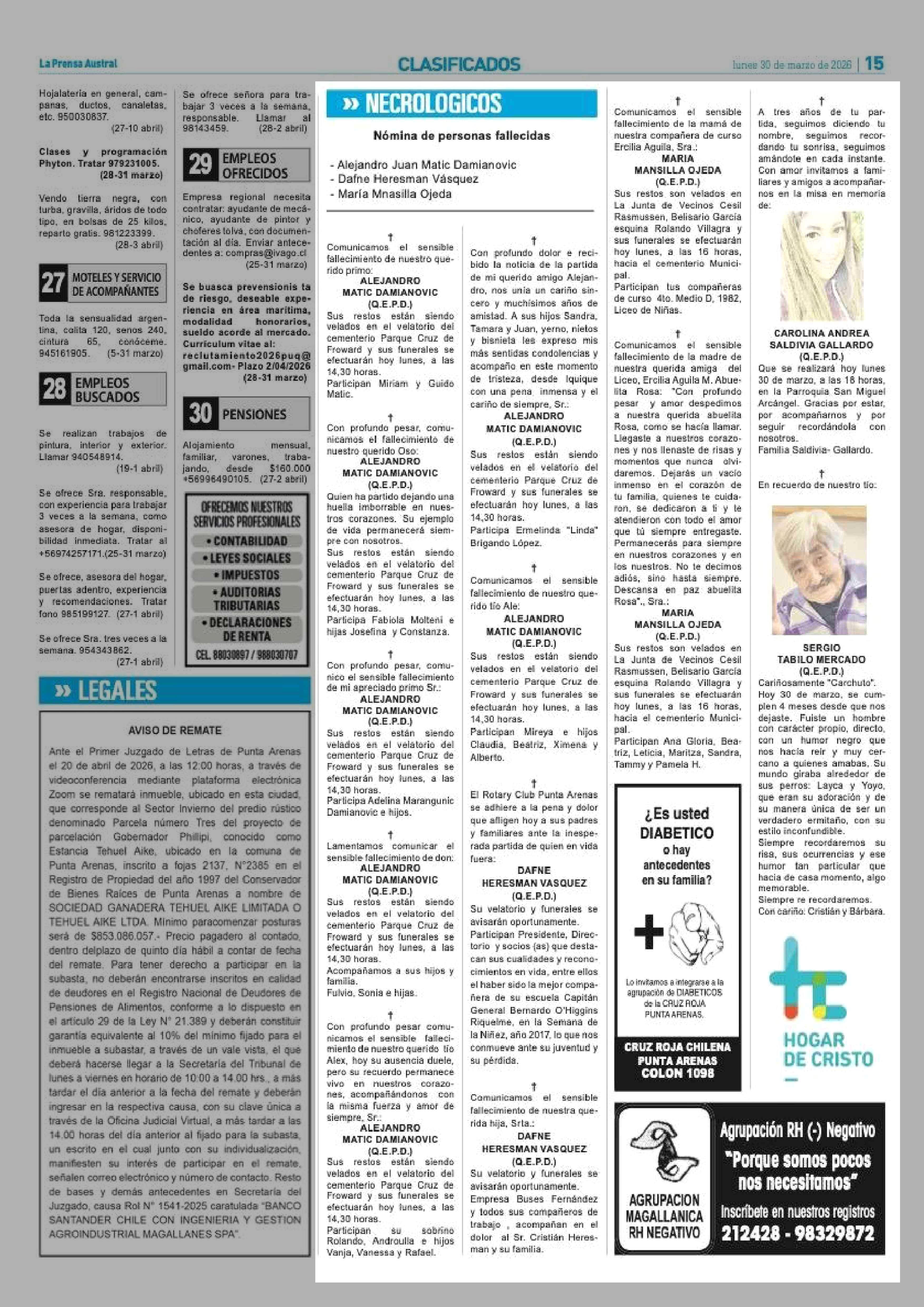 NECROLOGICOS 30-03-2026 La Prensa Austral |