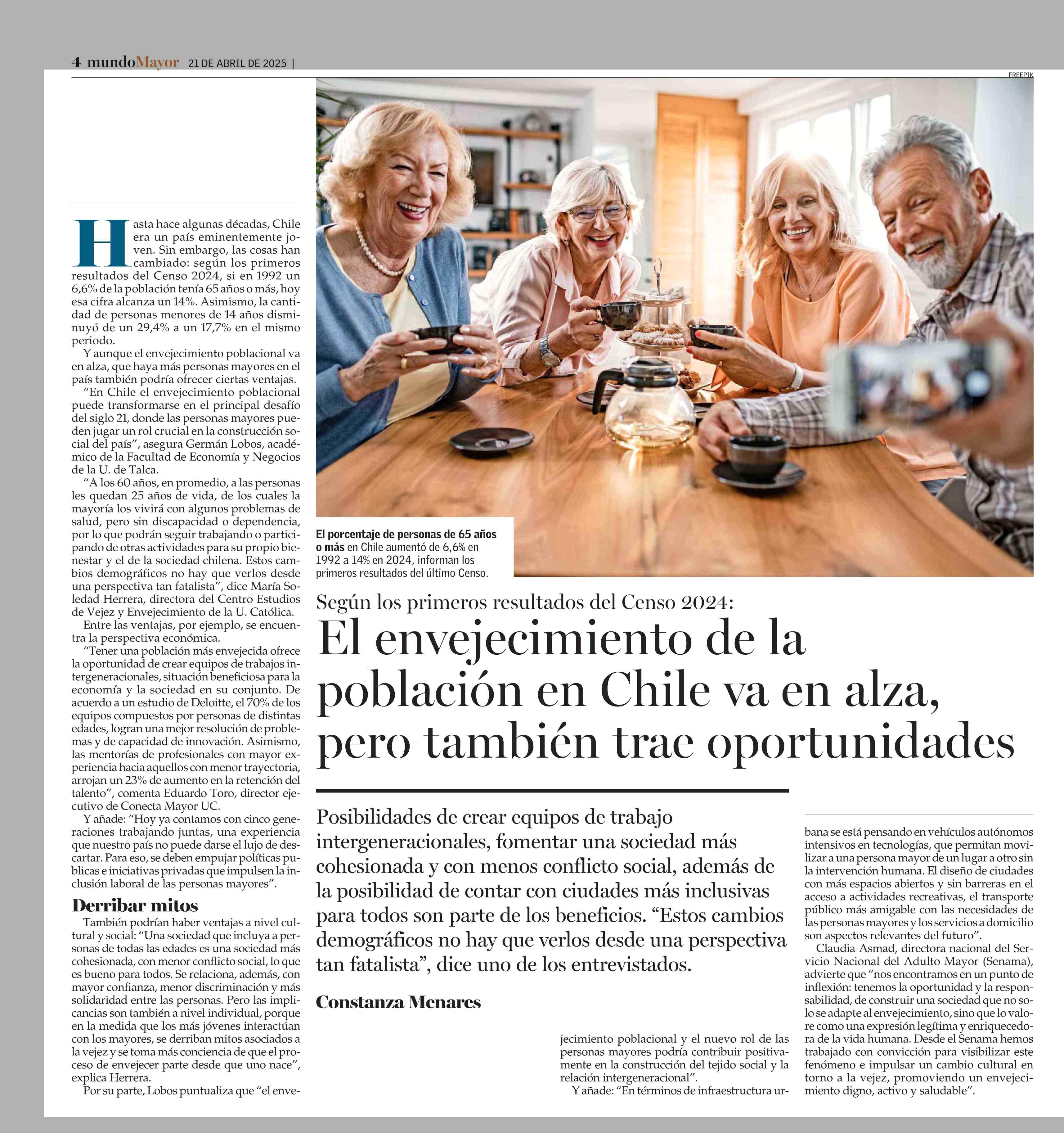 El envejecimiento de la población en Chile va en alza, pero tambien trae oportunidades 21-04-2025 El Mercurio |