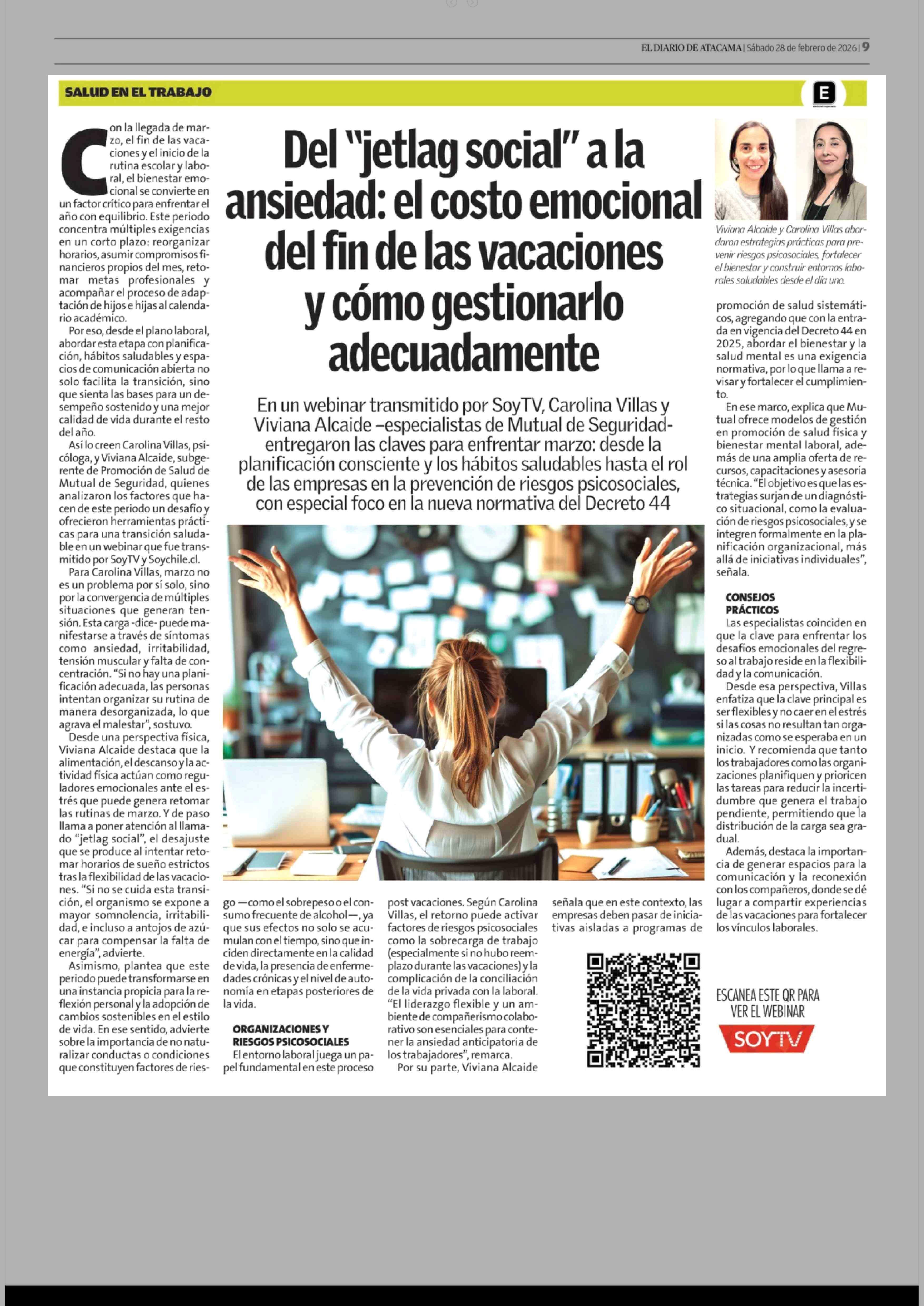 Del "jetlag social" a la ansiedad: el costo emocional del fin de las vacaciones y cómo gestionarlo adecuadamente 28-02-2026 El Diario de Atacama |