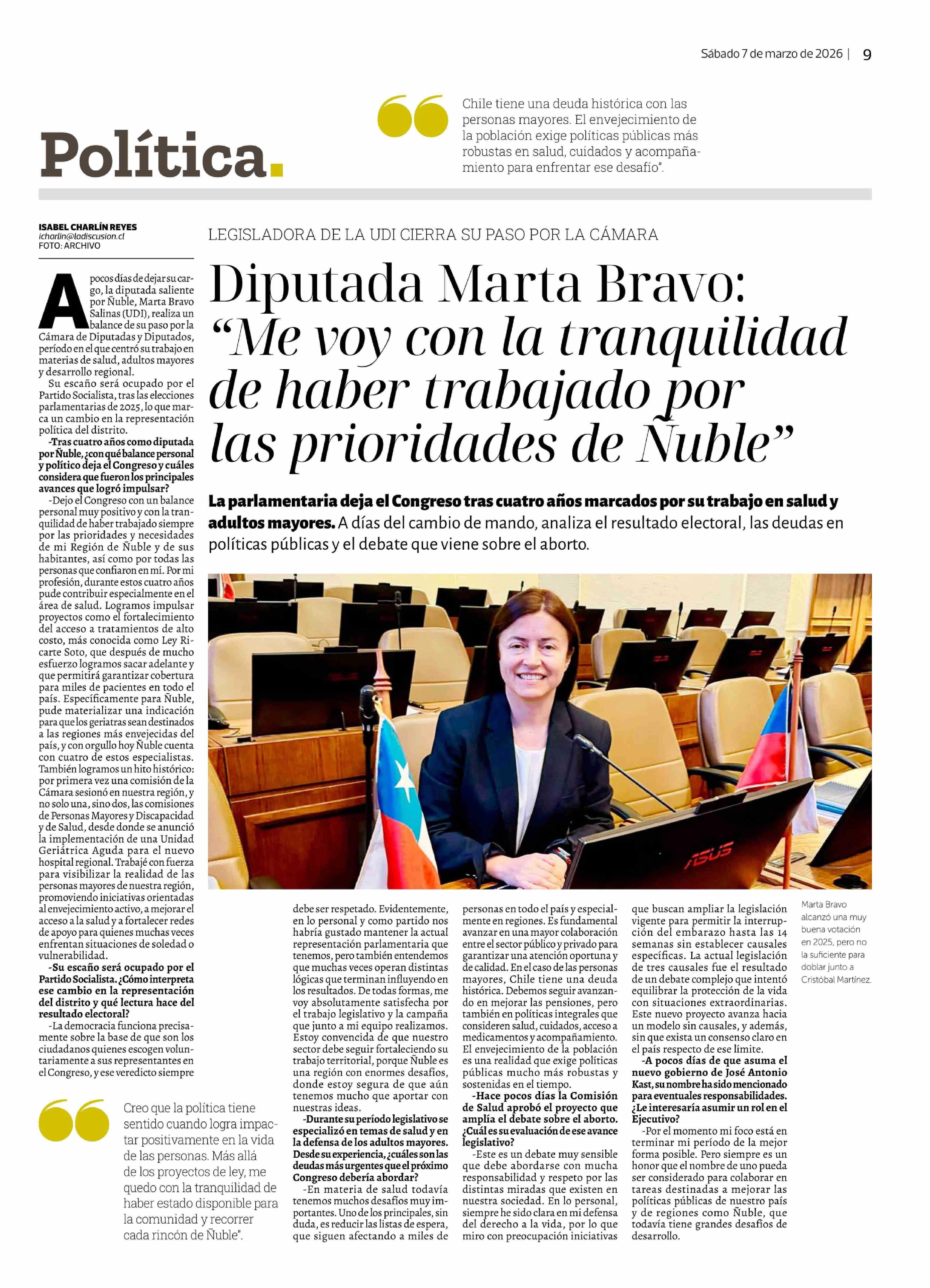 Diputada Marta Bravo: "Me voy con la tranquilidad de haber trabajado por las prioridades de Nuble" 07-03-2026 La Discusión |
