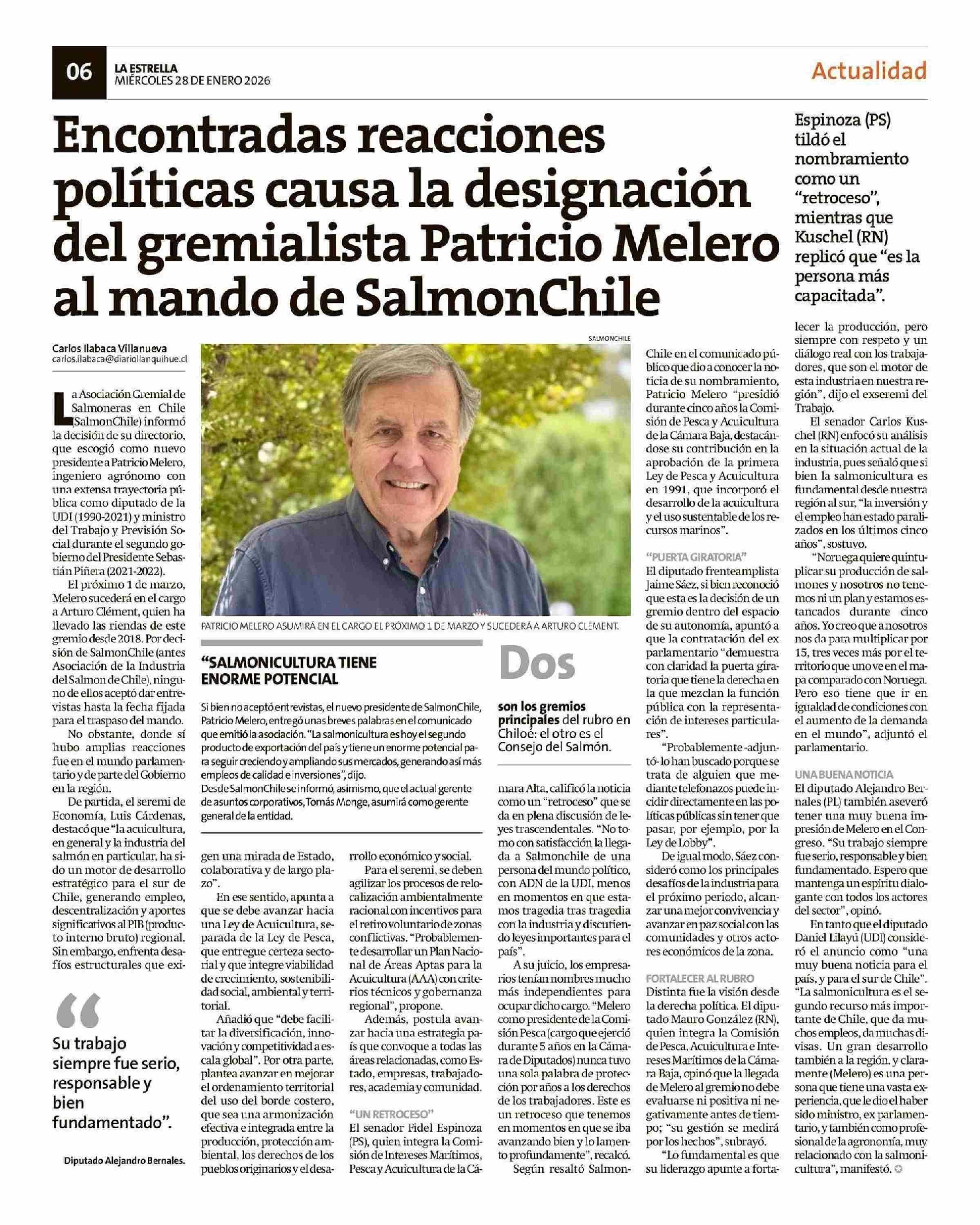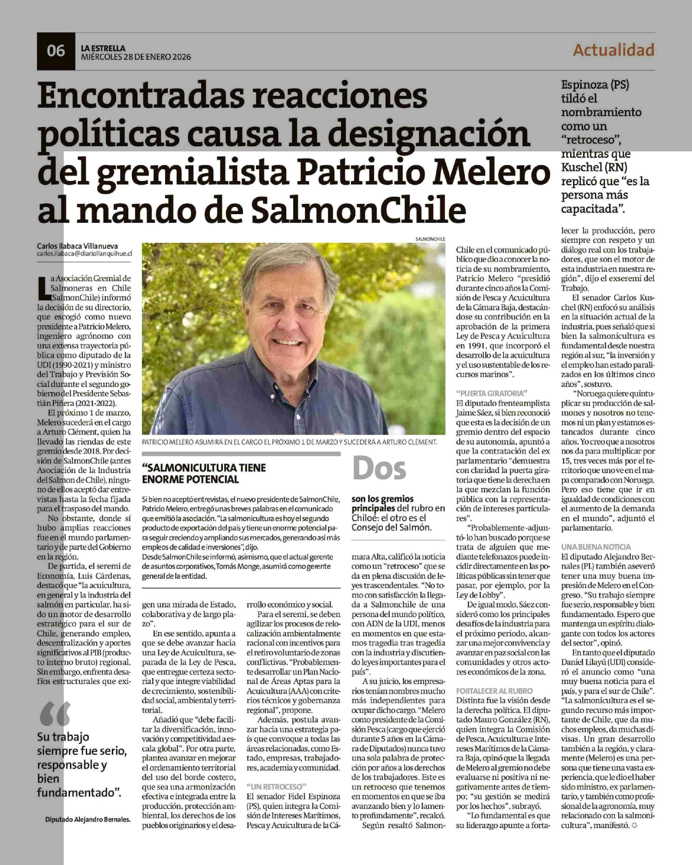 Encontradas reacciones políticas causa la designación del gremialista Patricio Melero al mando de SalmonChile 28-01-2026 La Estrella de Chiloé |