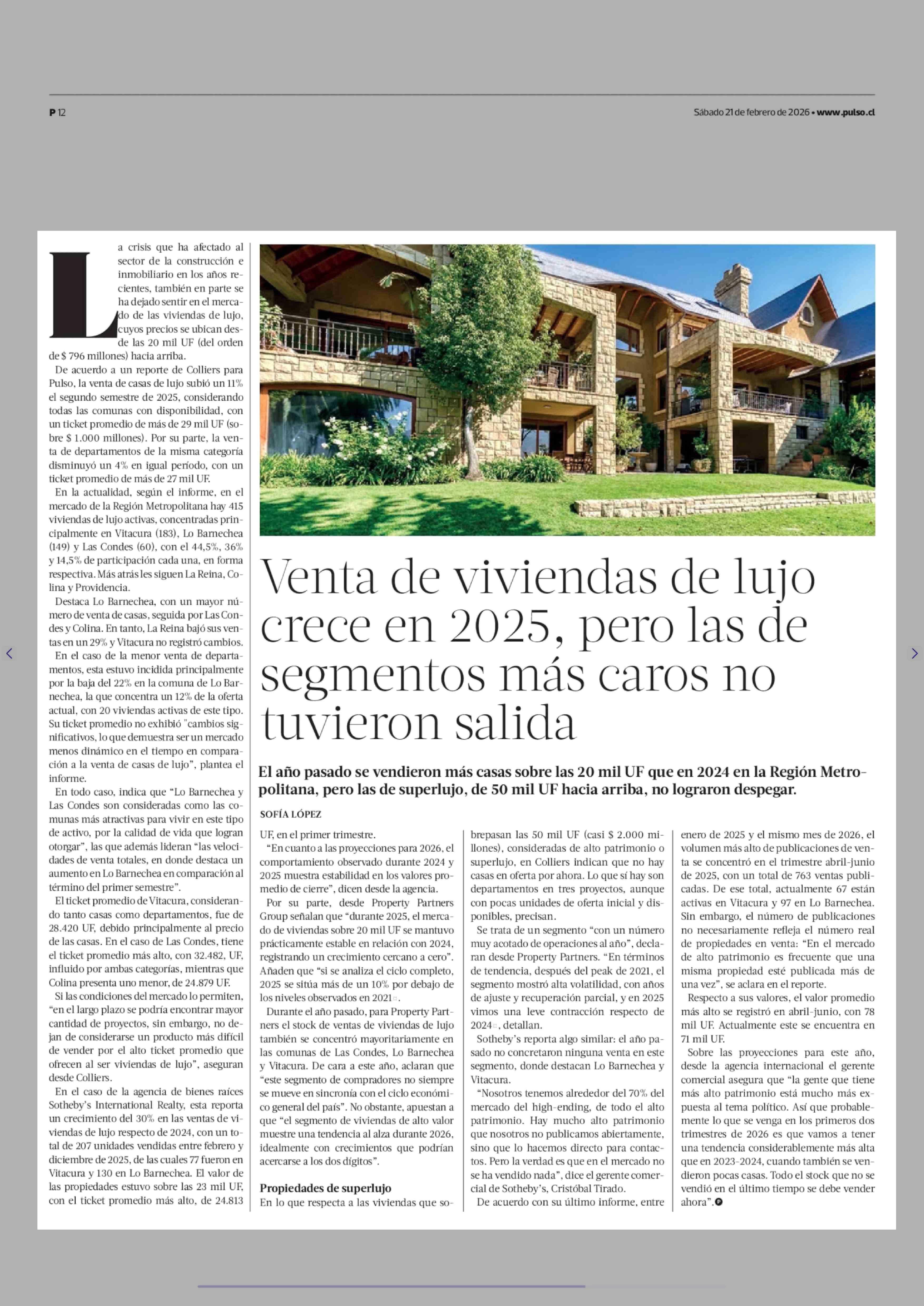 Venta de viviendas de lujo crece en 2025, pero las de segmentos más caros no tuvieron salida 21-02-2026 La Tercera |