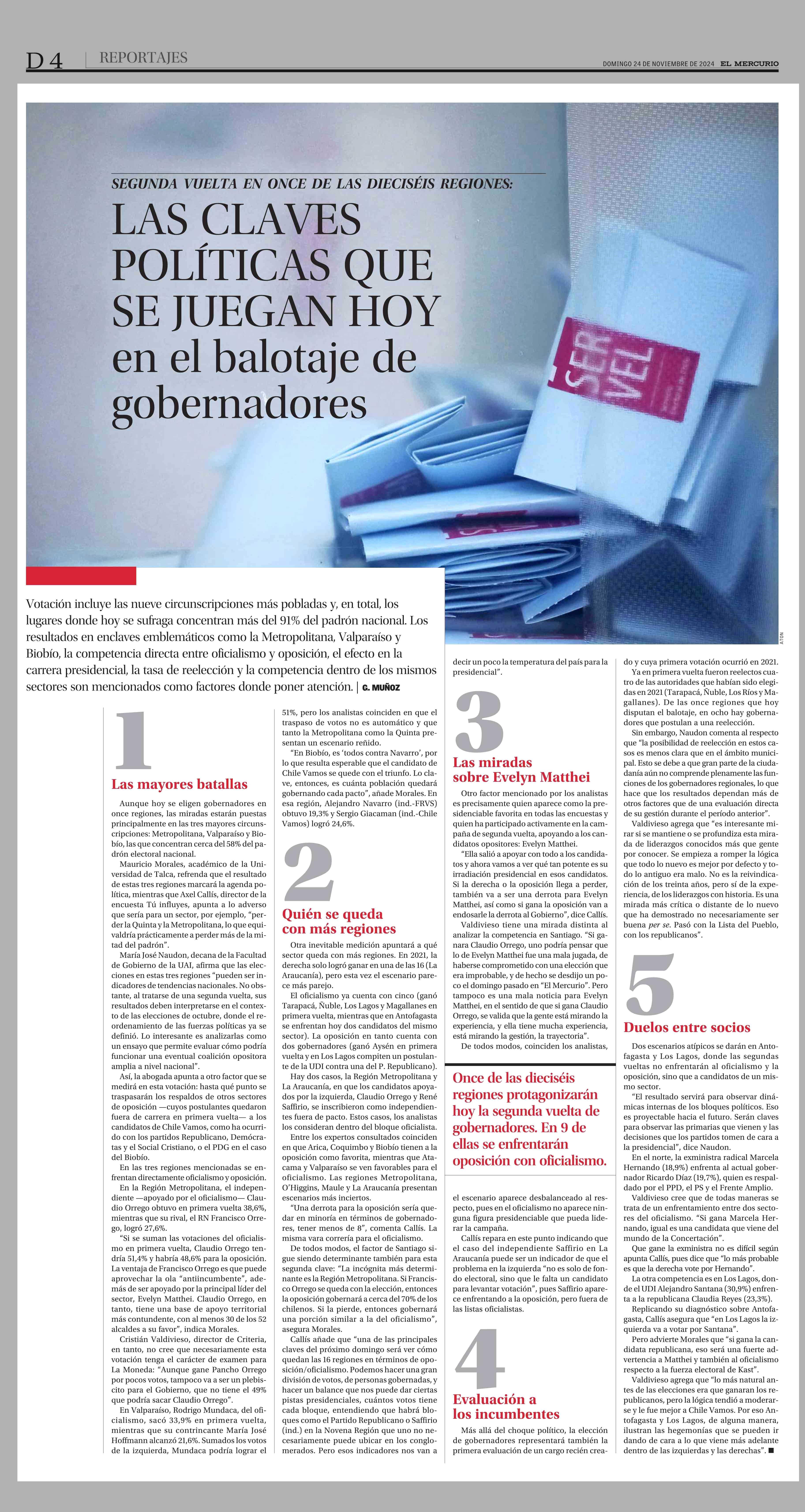 LAS CLAVES POLÍTICAS QUE SE JUEGAN HOY en el balotaje de gobernadores 24-11-2024 El Mercurio |