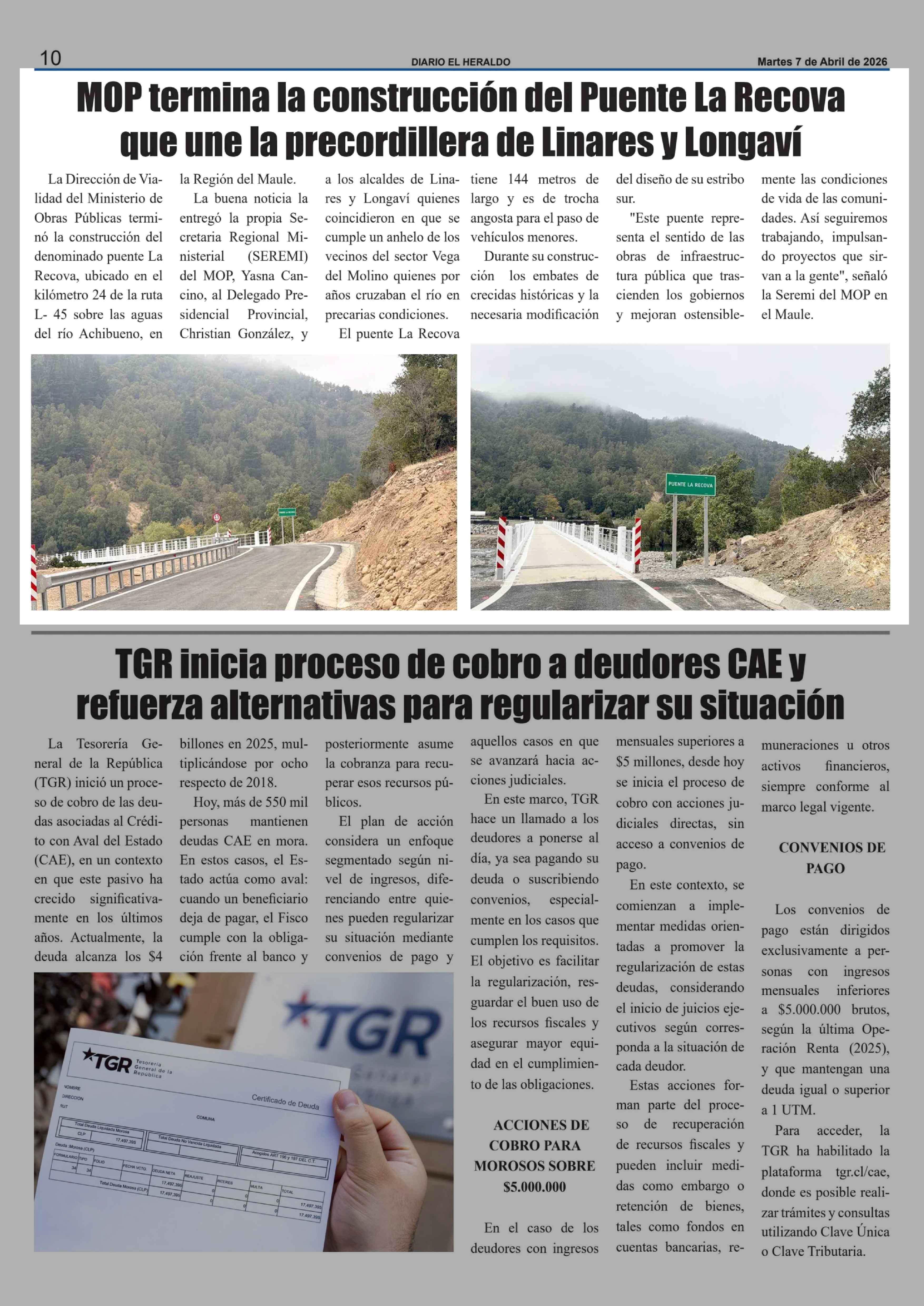 MOP termina la construcción del Puente La Recova que une la precordillera de Linares y Longaví 07-04-2026 El Heraldo |