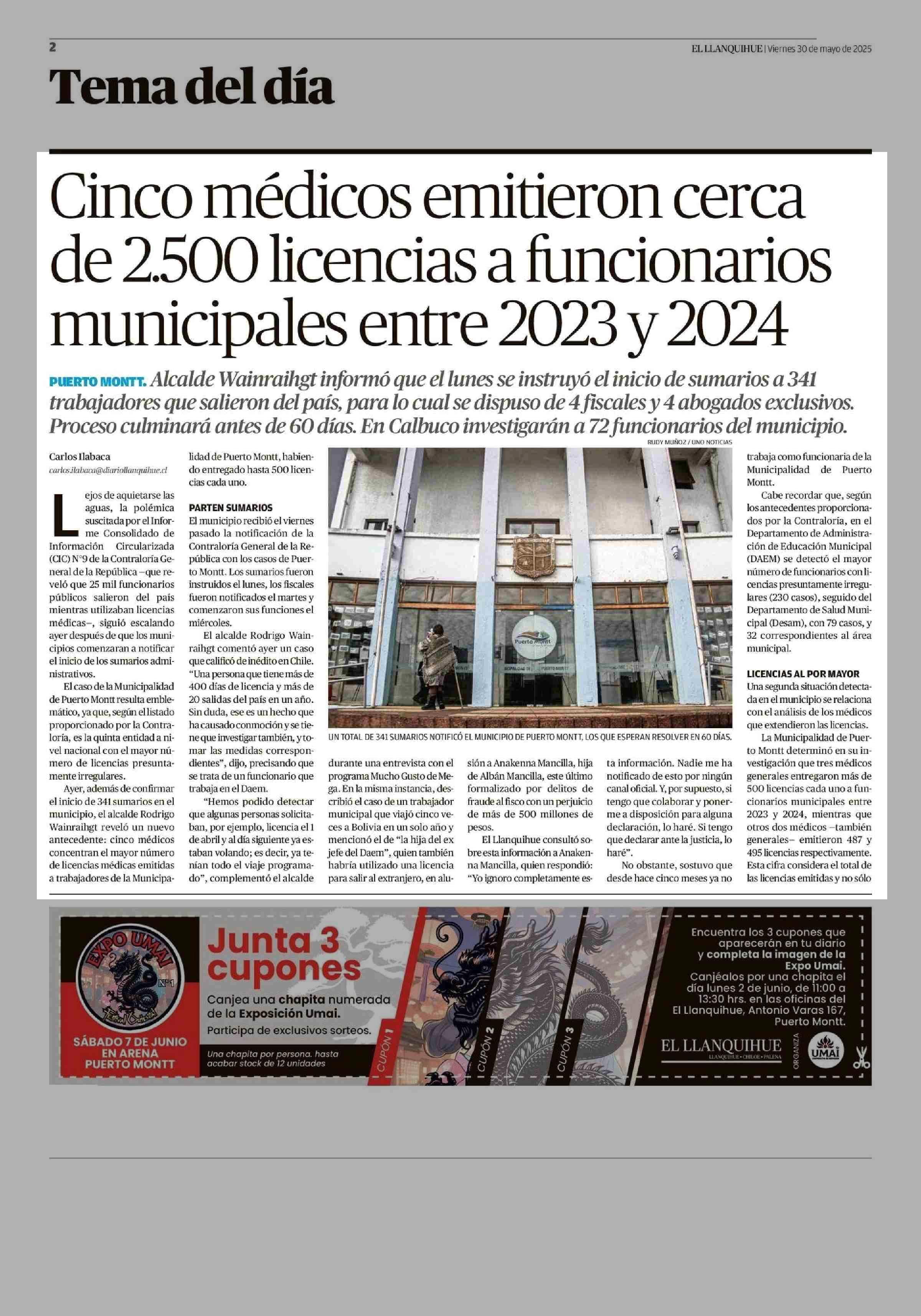 Cinco médicos emitieron cerca de 2.500 licencias a funcionarios municipales entre 2023 y 2024 30-05-2025 El Llanquihue |