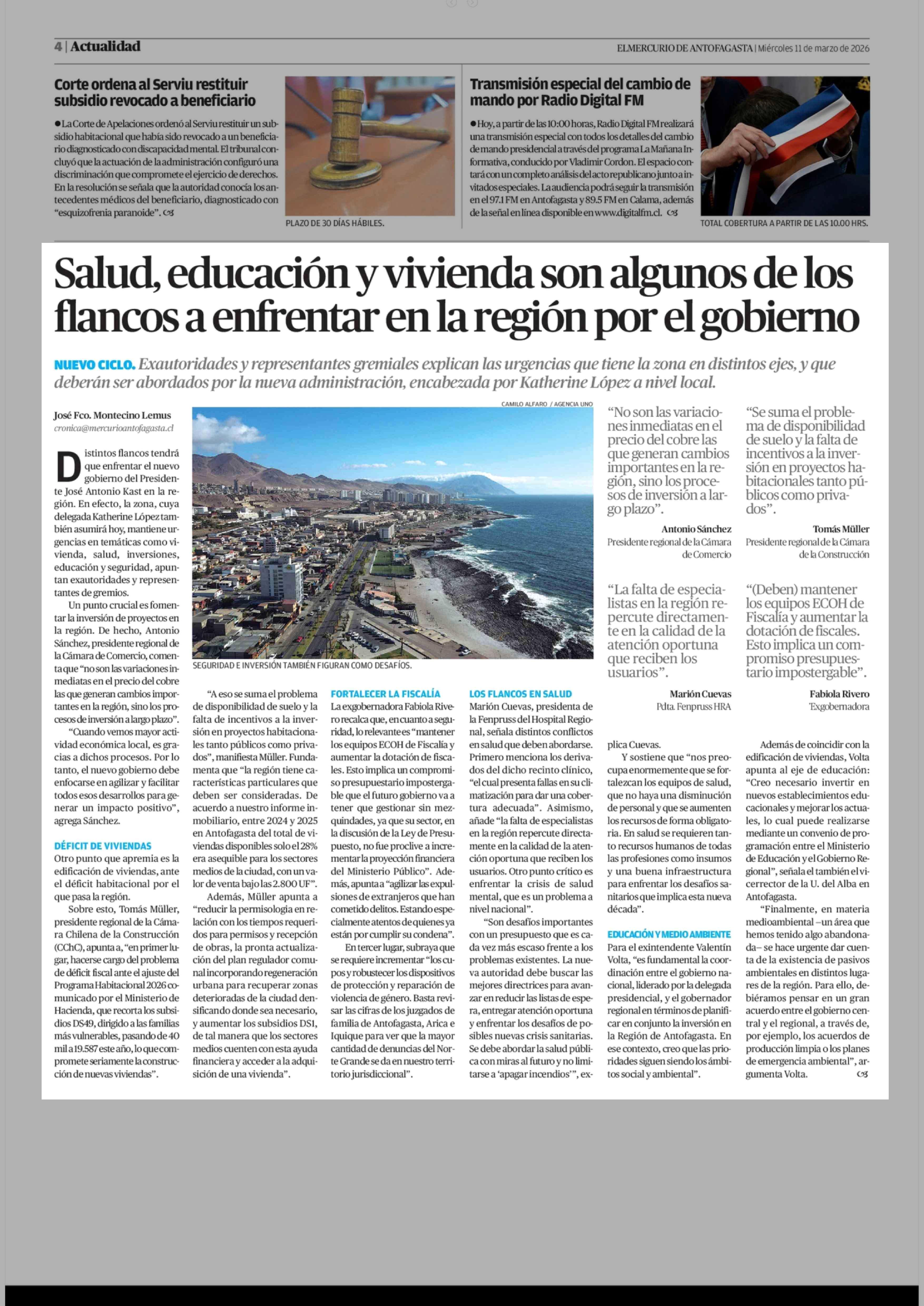 Salud, educación y vivienda son algunos de los flancos a enfrentar en la región por el gobierno 11-03-2026 El Mercurio de Antofagasta |
