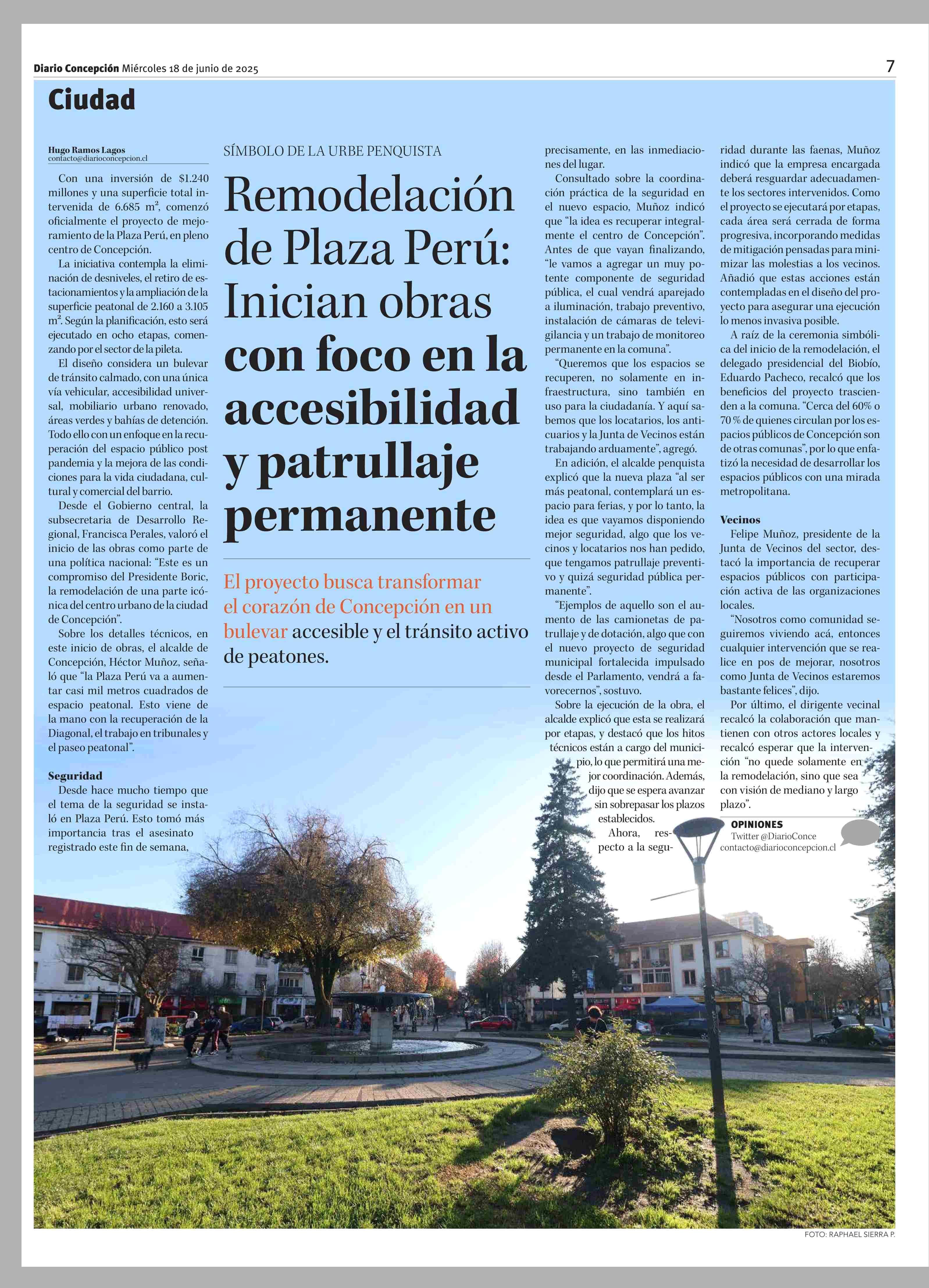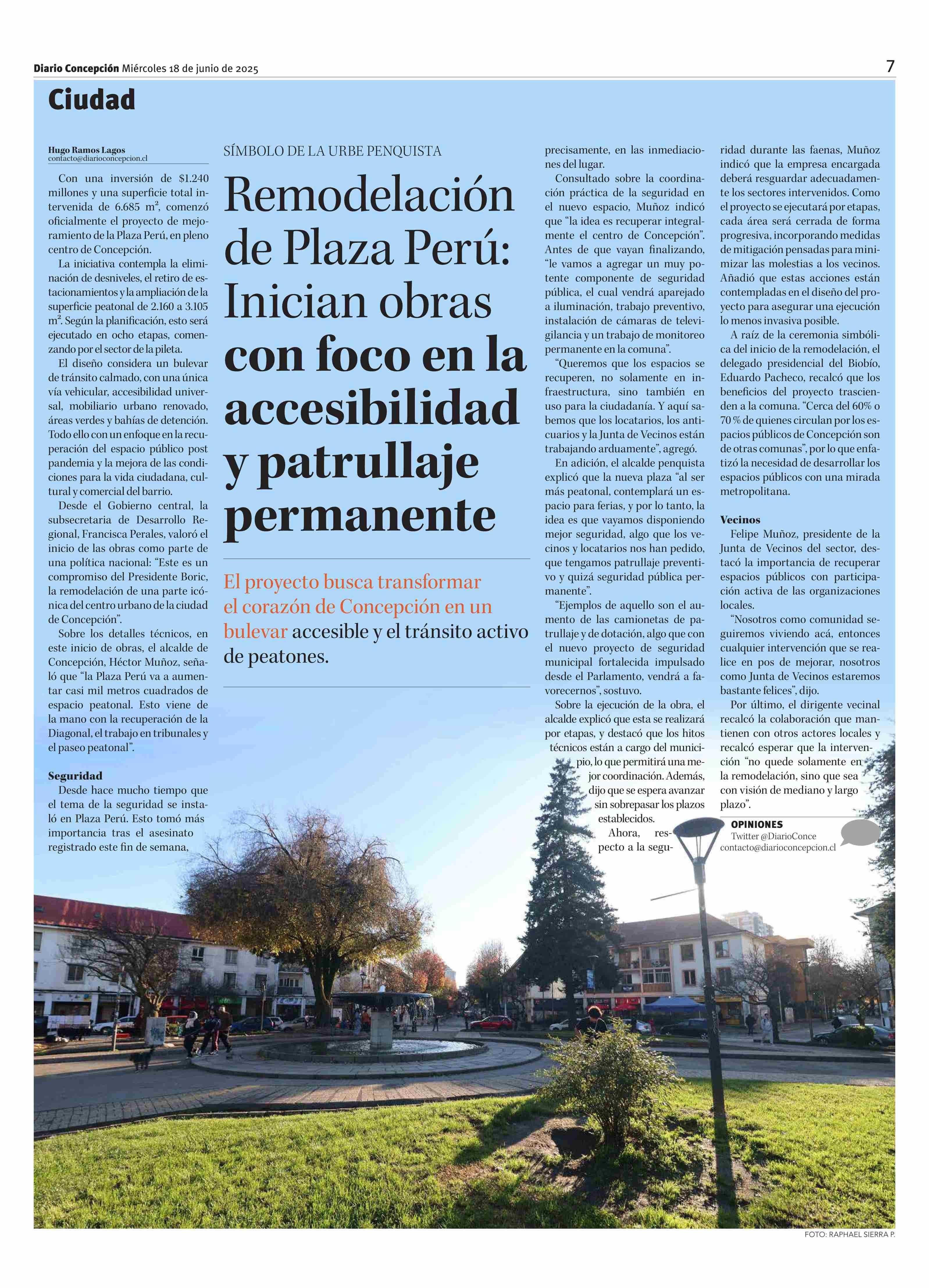 Remodelación de Plaza Perú: Inician obras con foco en la accesibilidad y patrullaje permanente 18-06-2025 Diario Concepción |
