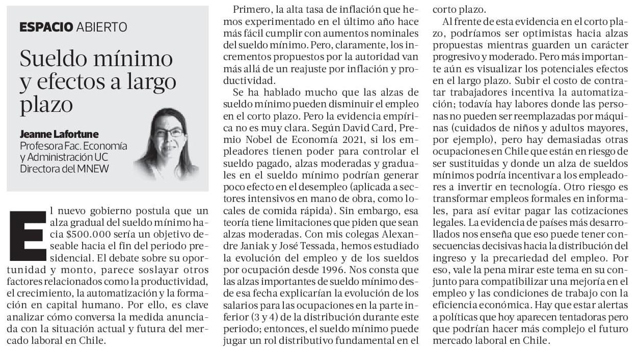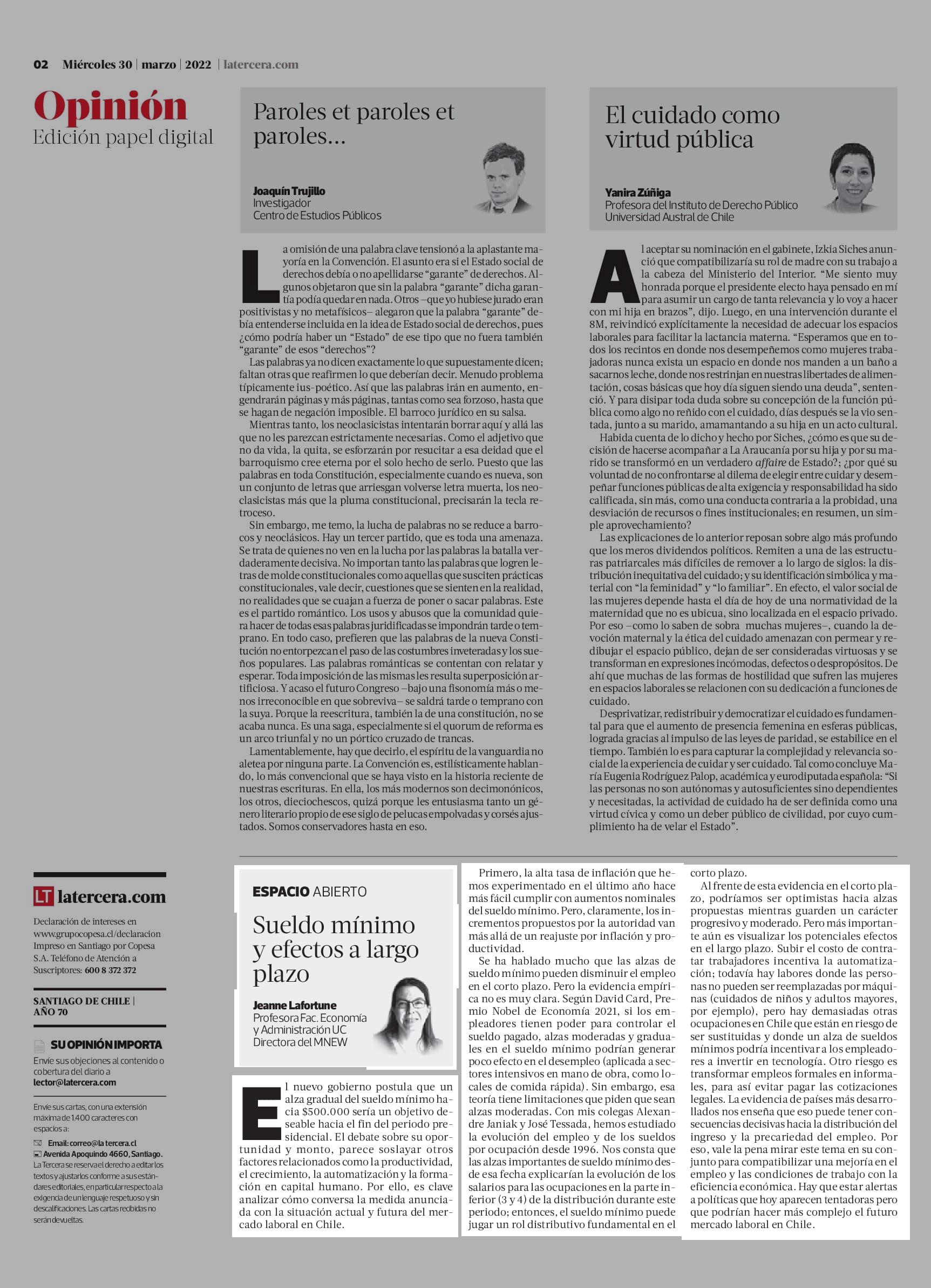 Sueldo mínimo y efectos a largo plazo 30-03-2022 La Tercera |