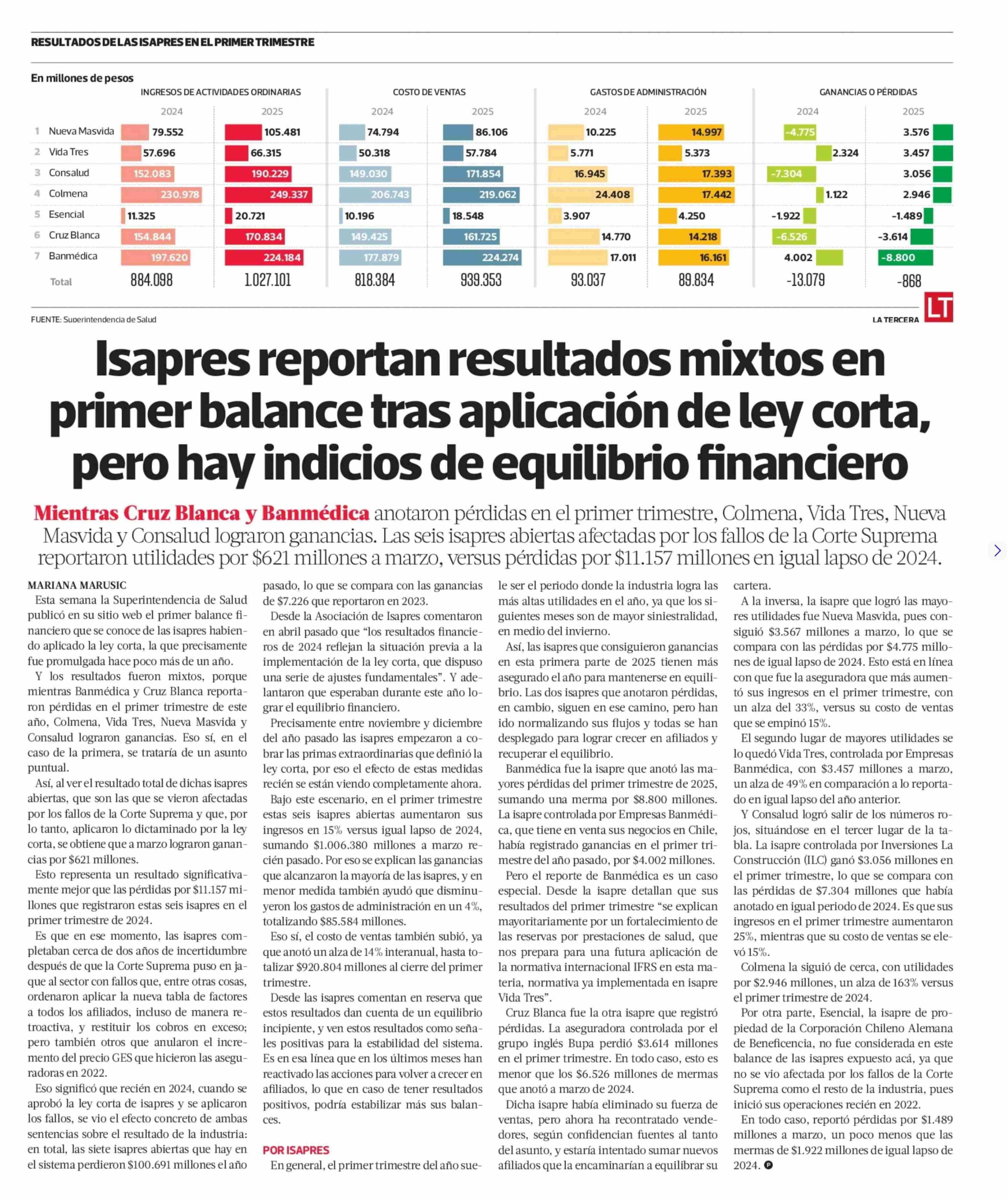 Isapres reportan resultados mixtos en 20-06-2025 La Tercera |