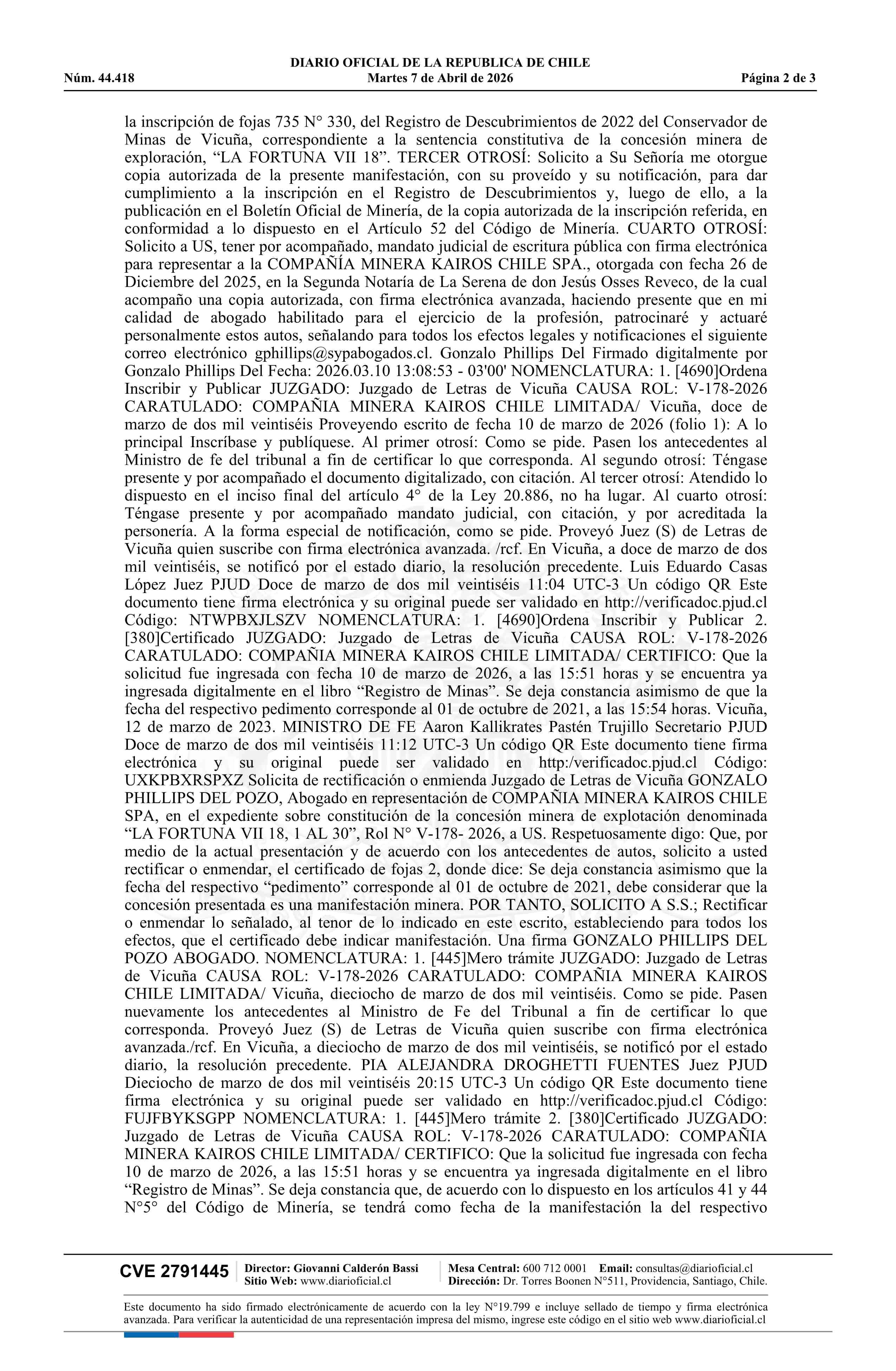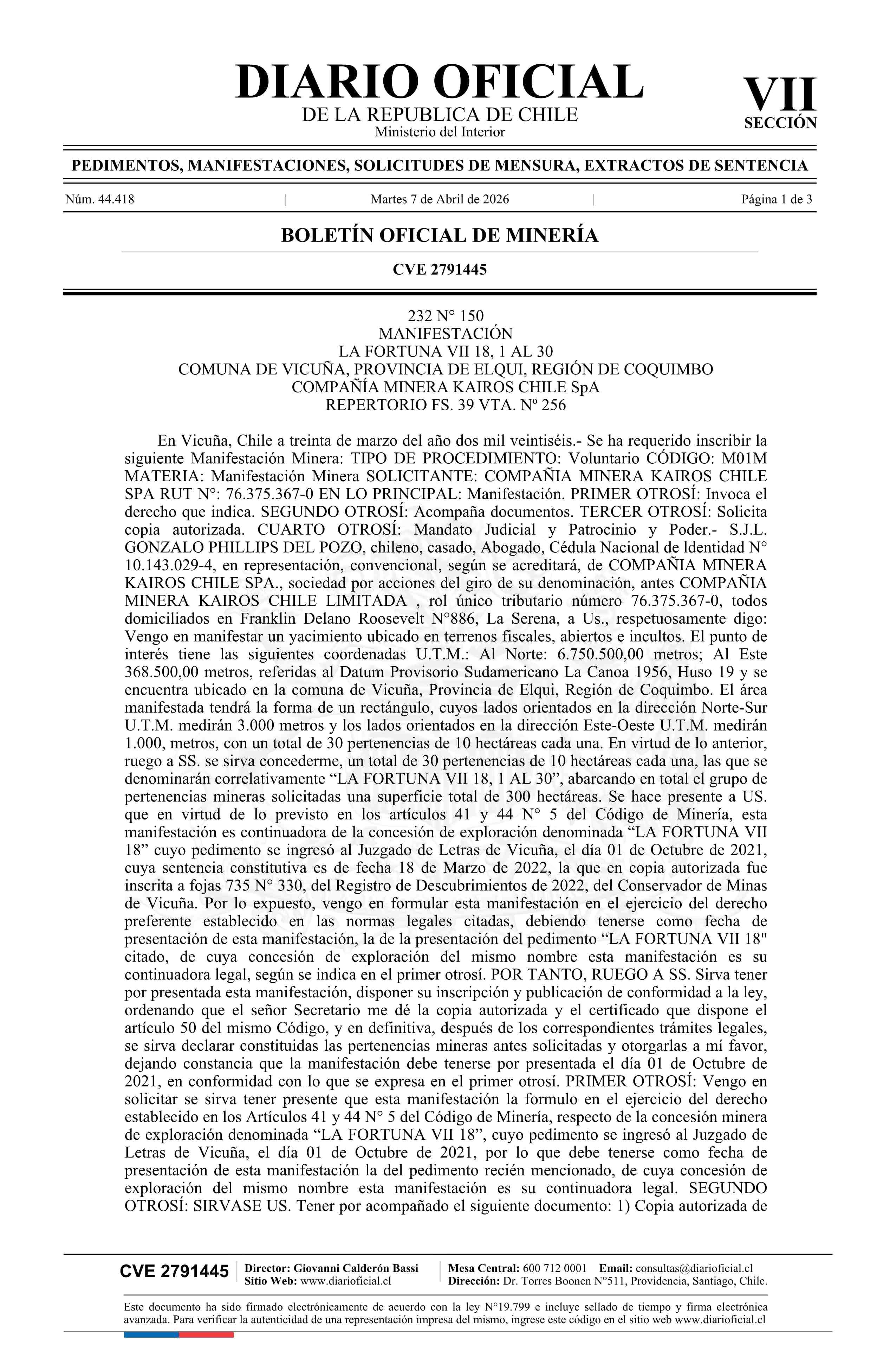 LA FORTUNA VII 18, 1 AL 30 / Compañía Minera Kairos Chile SpA