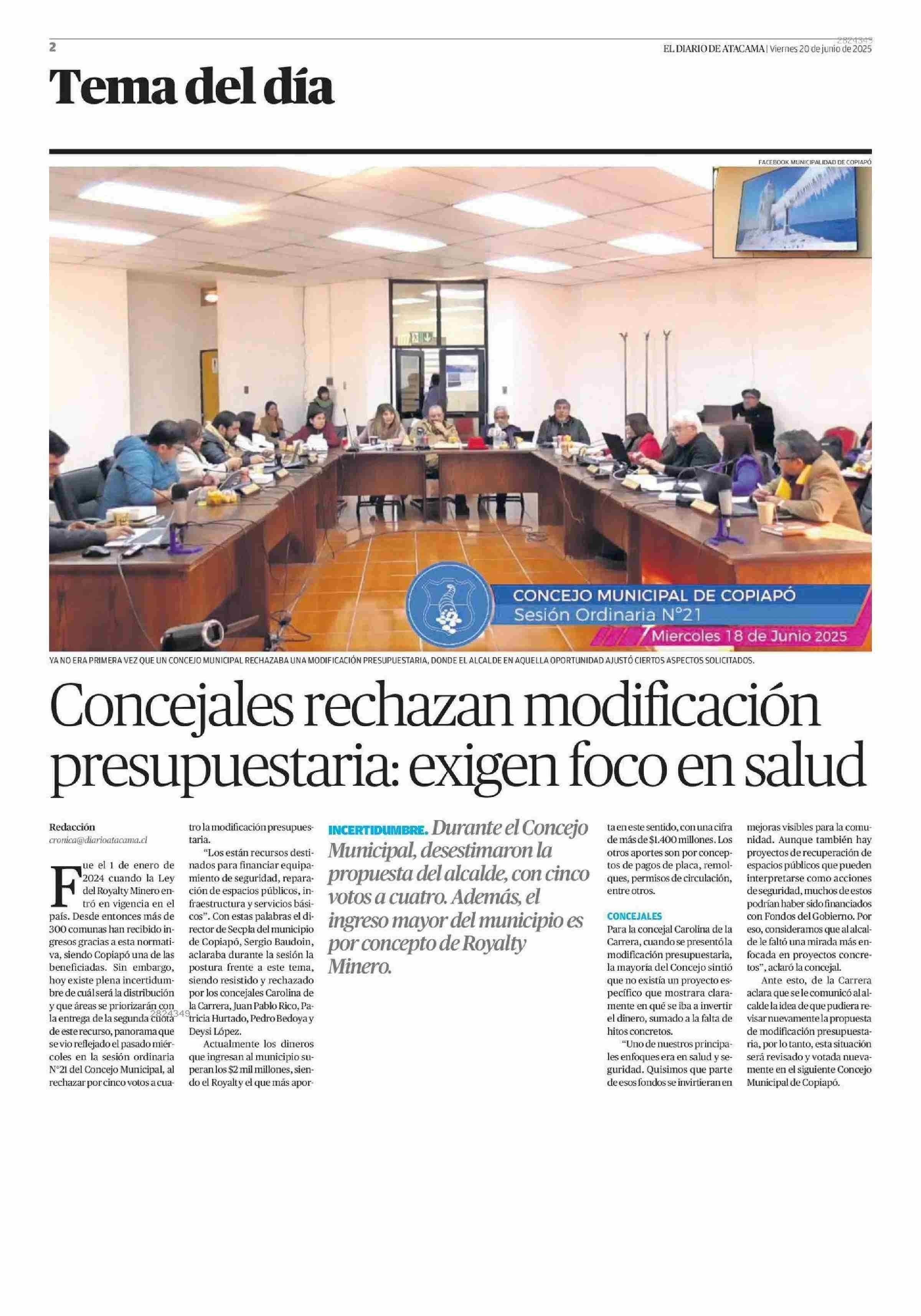 Concejales rechazan modificación presupuestaria: exigen foco en salud 20-06-2025 El Diario de Atacama |