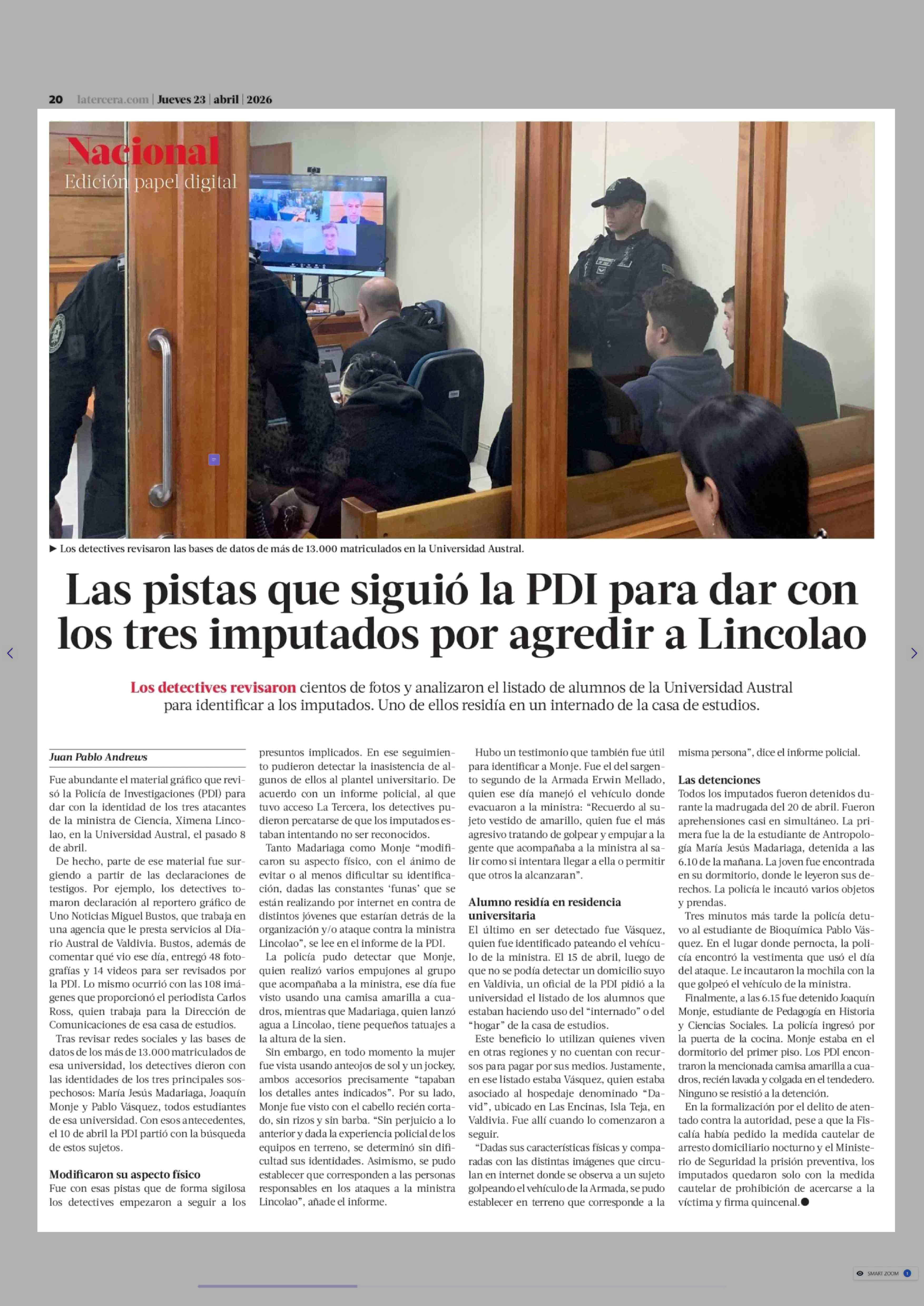 Las pistas que siguió la PDI para dar con los tres imputados por agredir a Lincolao 23-04-2026 La Tercera |