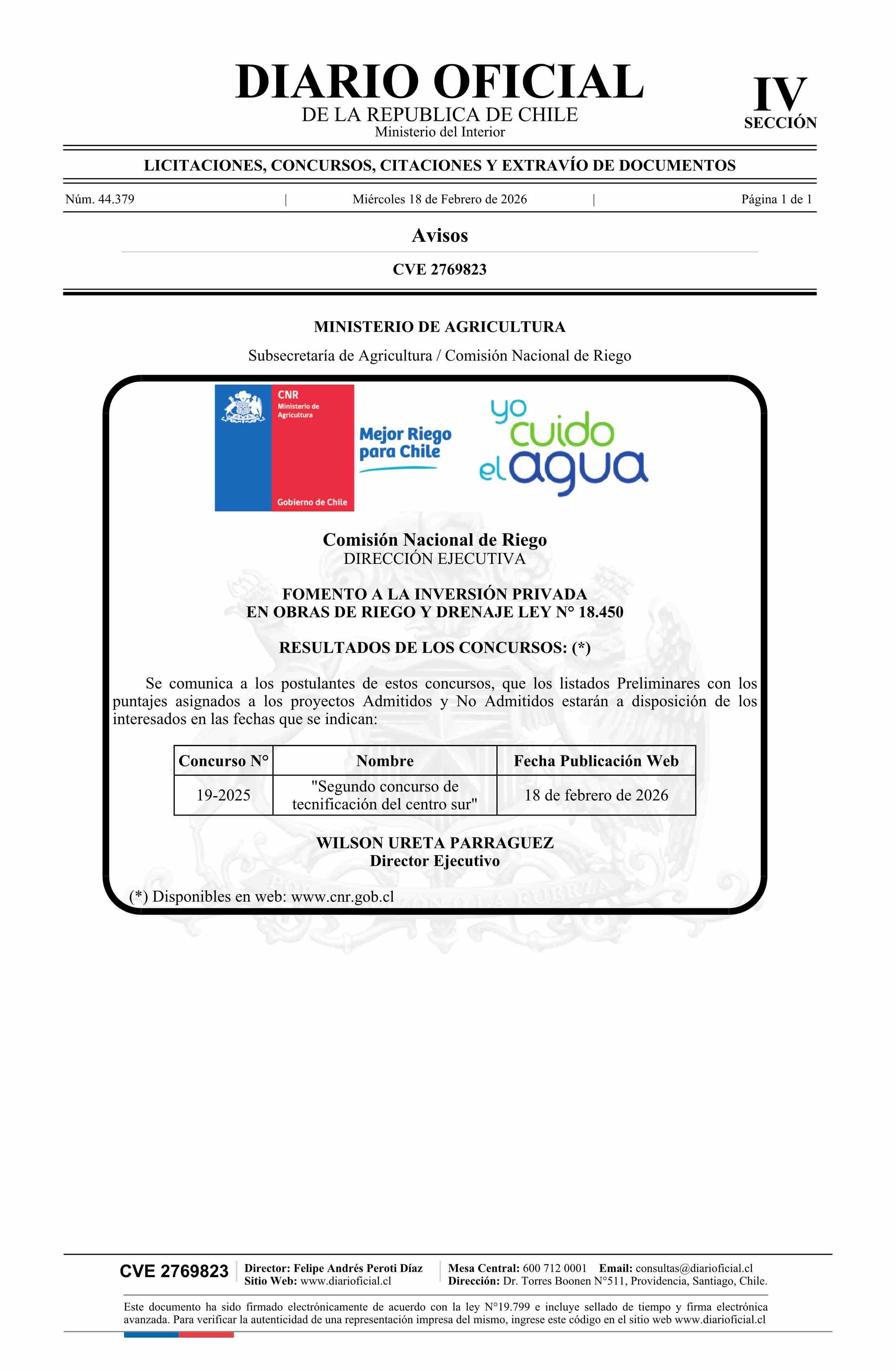 AVISO LICITACIONES: Fomento a la Inversión Privada en Obras de Riego y Drenaje Ley N° 18.450 18-02-2026 Diario Oficial Edición Electrónica |