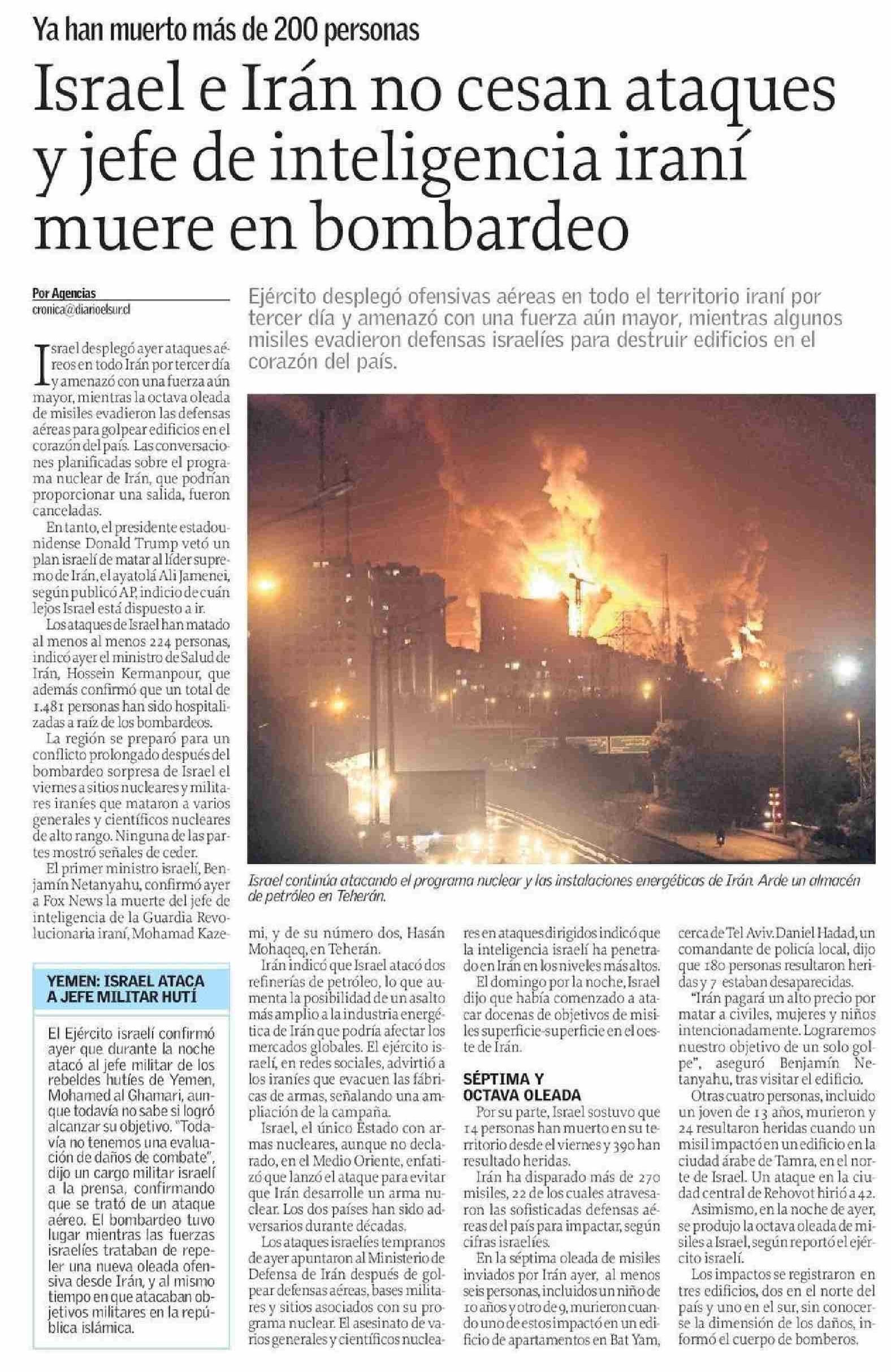 | Título: | Israel e Irán no cesan ataques y Jefe de inteligencia iraní muere en bombardeo |