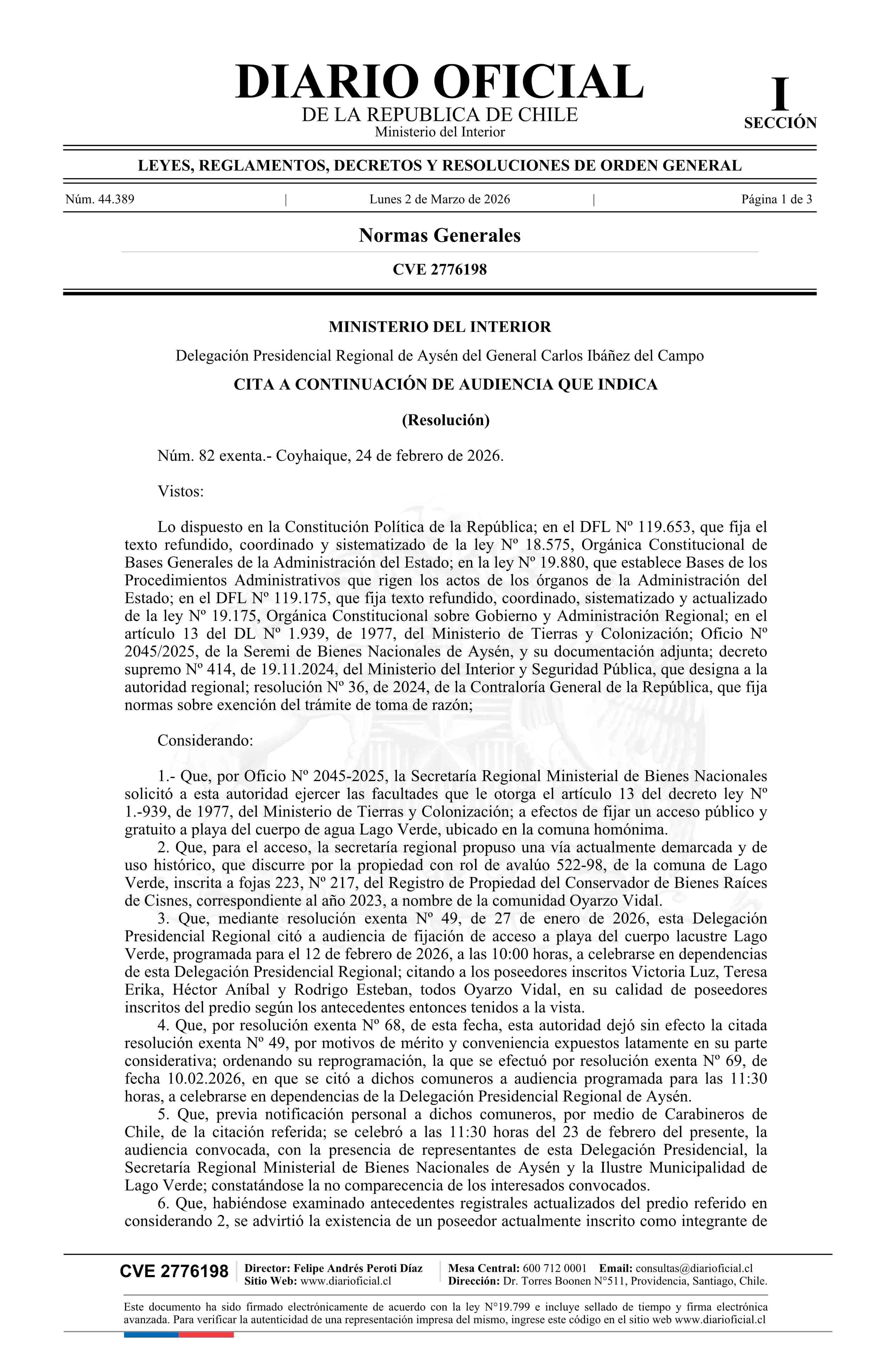 Resolución exenta número 82, de 2026.- Cita a continuación de audiencia que indica 02-03-2026 Diario Oficial Edición Electrónica |