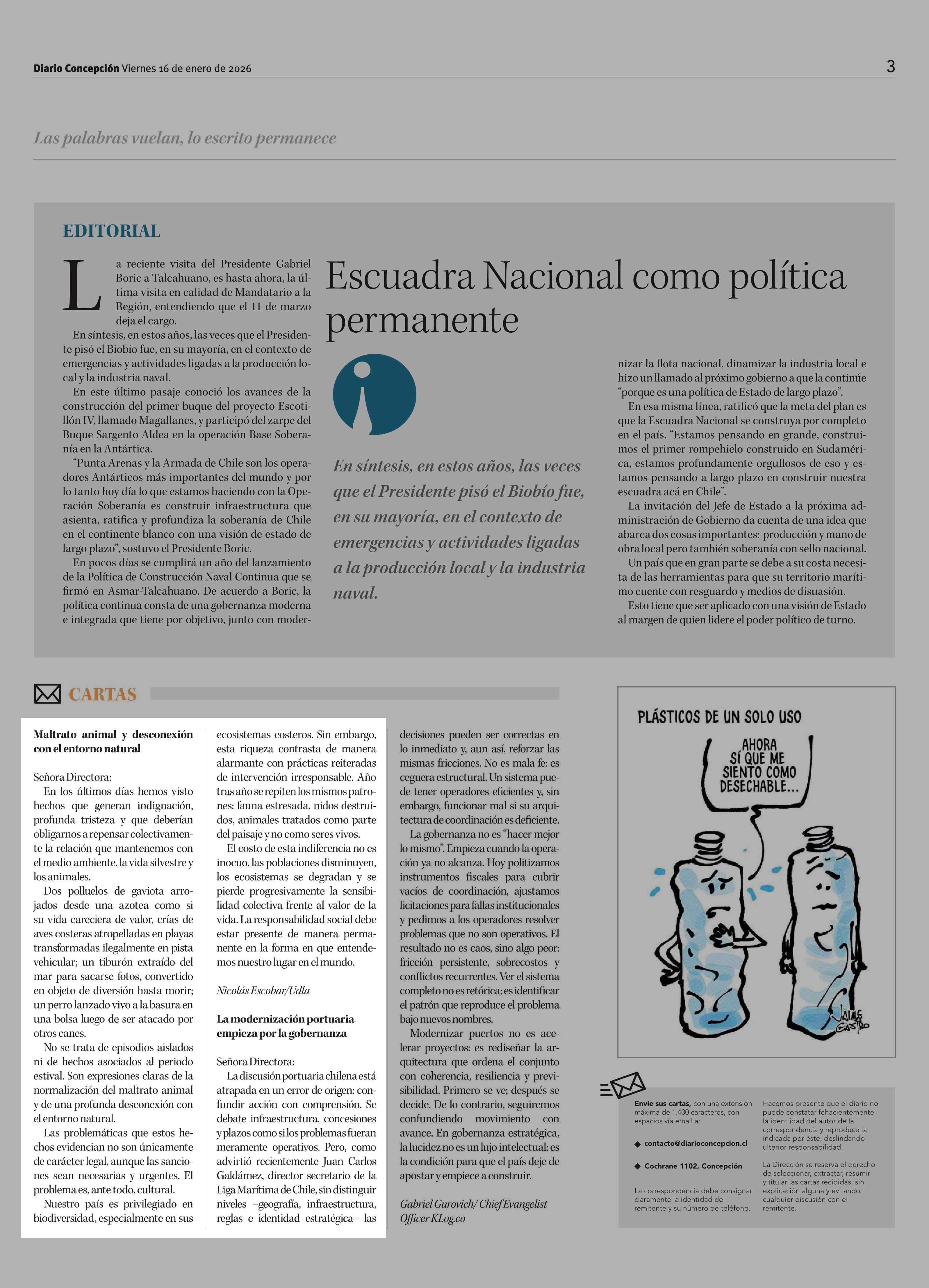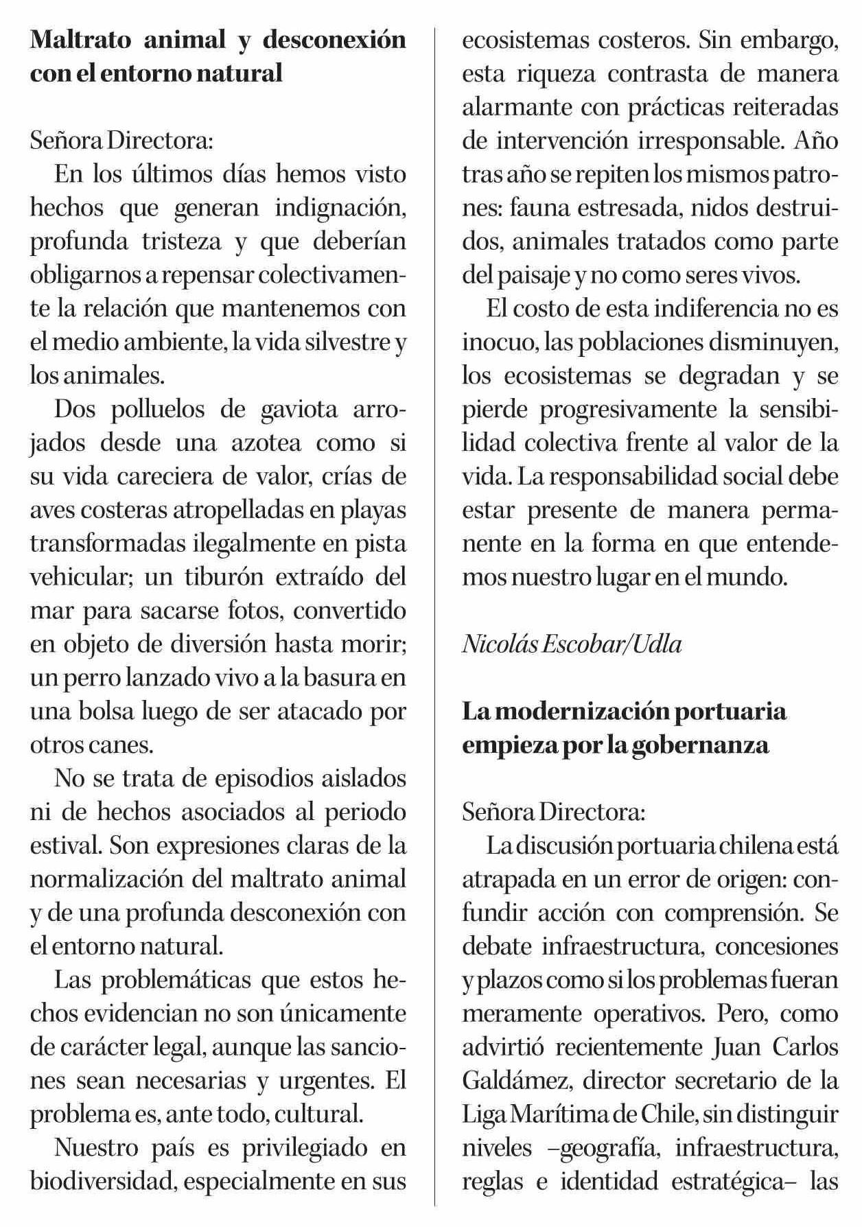 Cartas: Maltrato animal y desconexión con el entorno natural 16-01-2026 Diario Concepción |