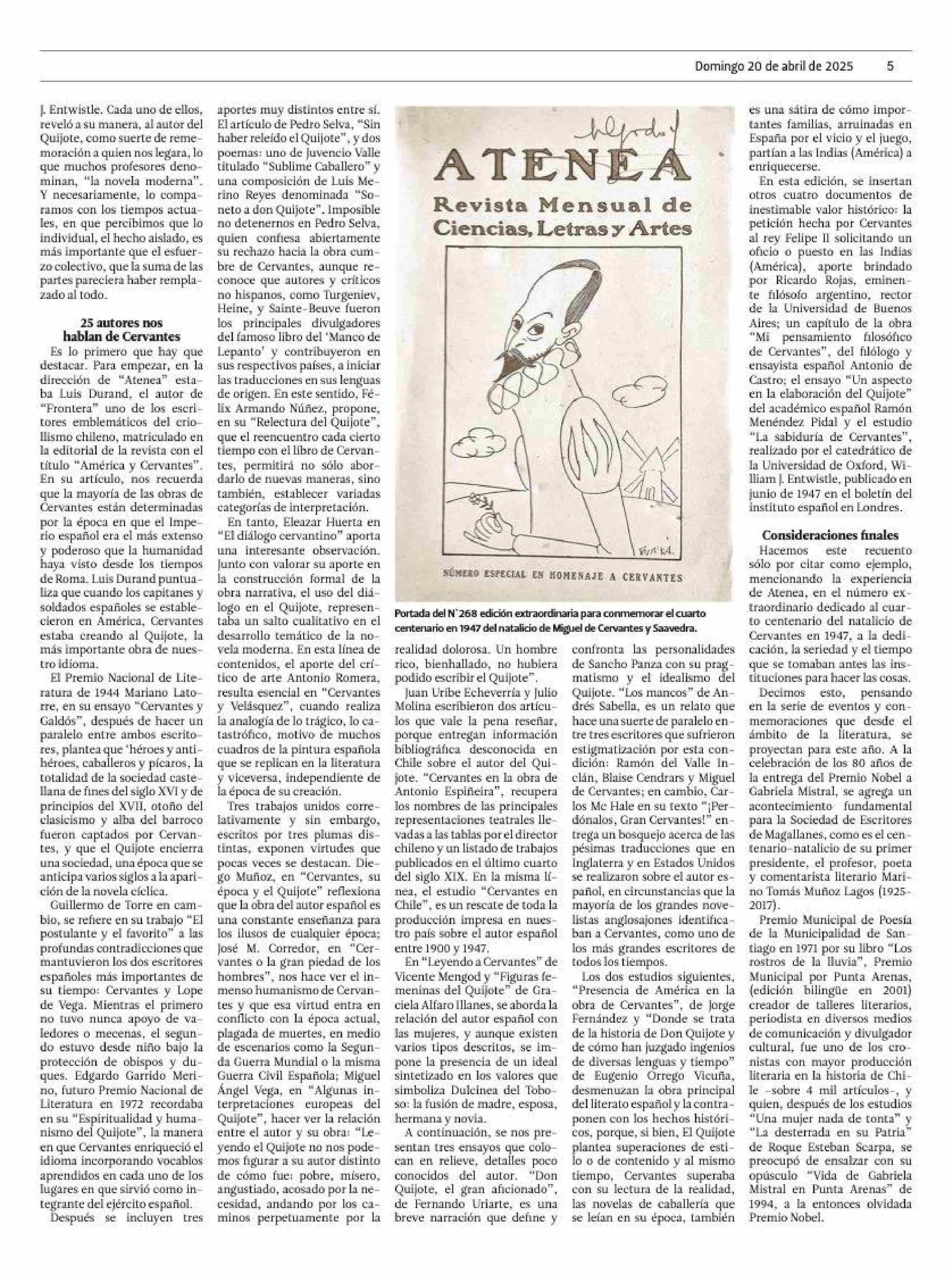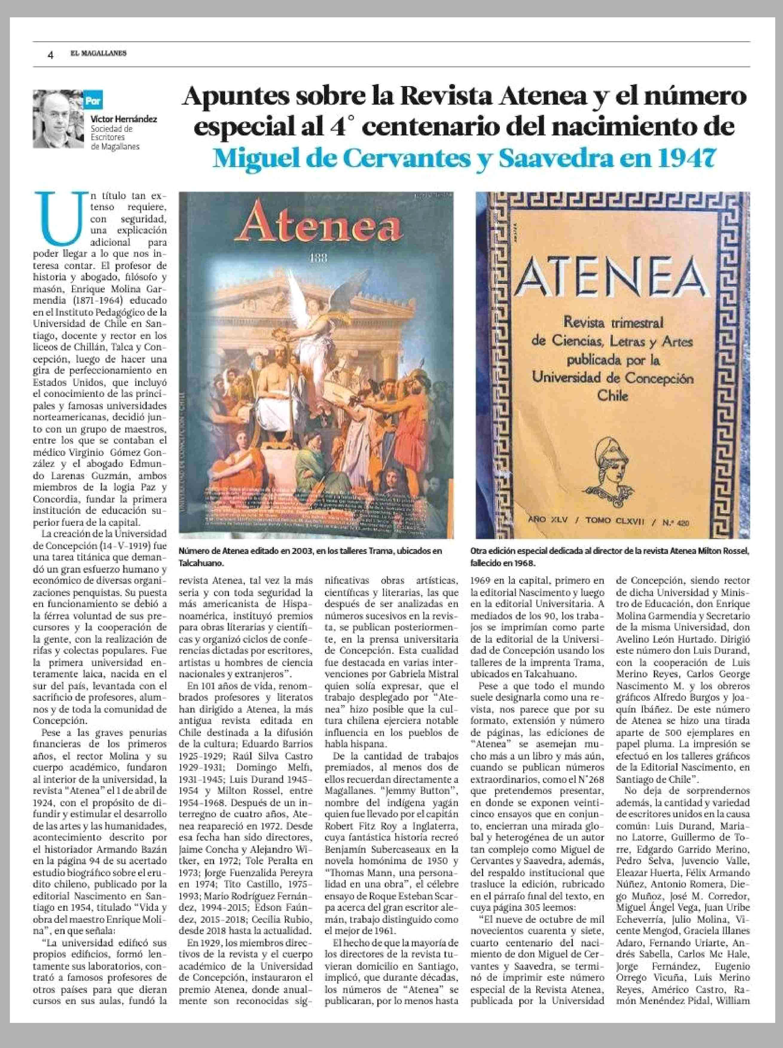 Apuntes sobre la Revista Atenea y el número especial al 4” centenario del nacimiento de Mionel de Cervantes v Saavedra en 1947 20-04-2025 El Magallanes |