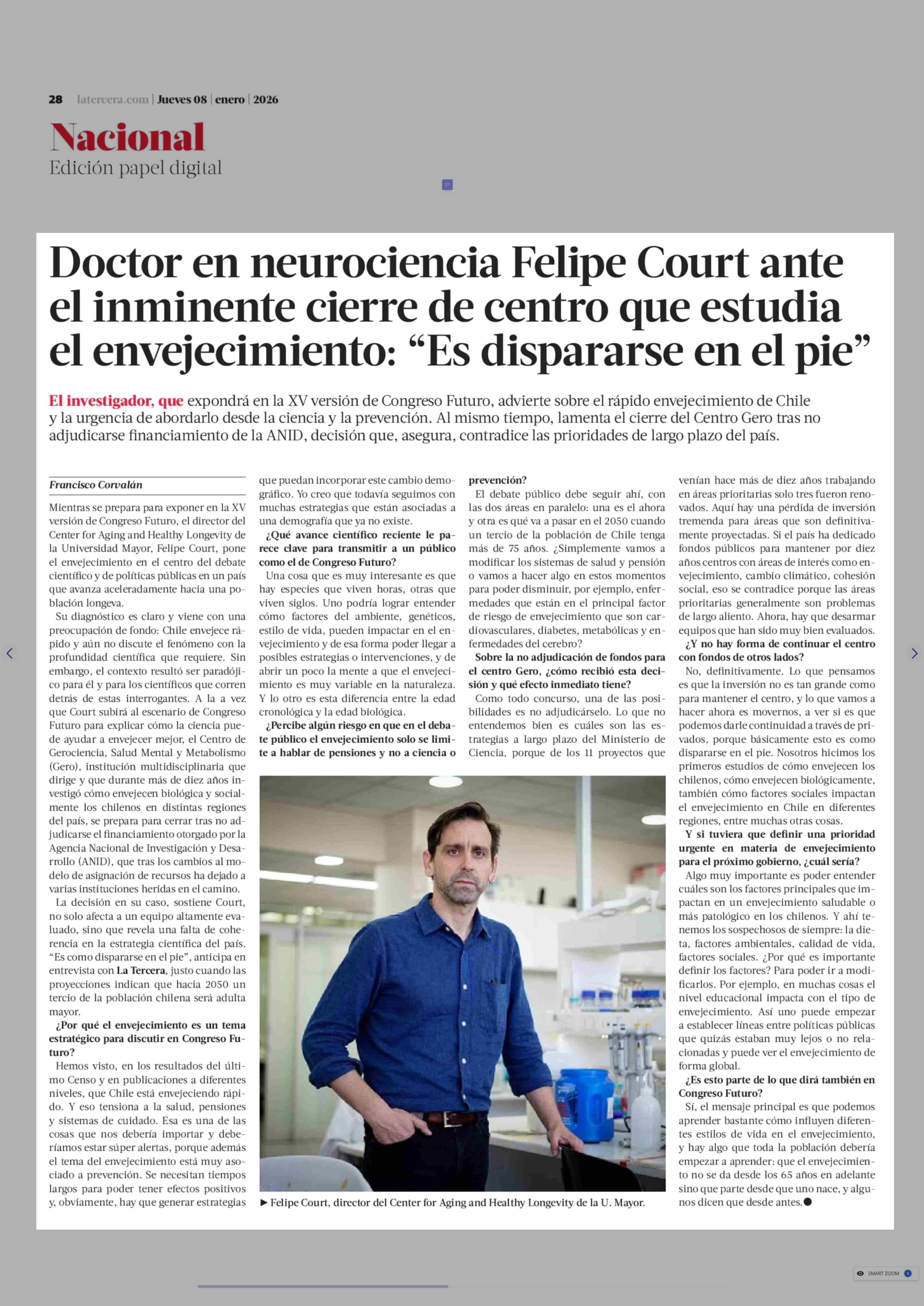 Doctor en neurociencia Felipe Court ante el inminente cierre de centro que estudia el envejecimiento: "Es dispararse en el pie" 08-01-2026 La Tercera |