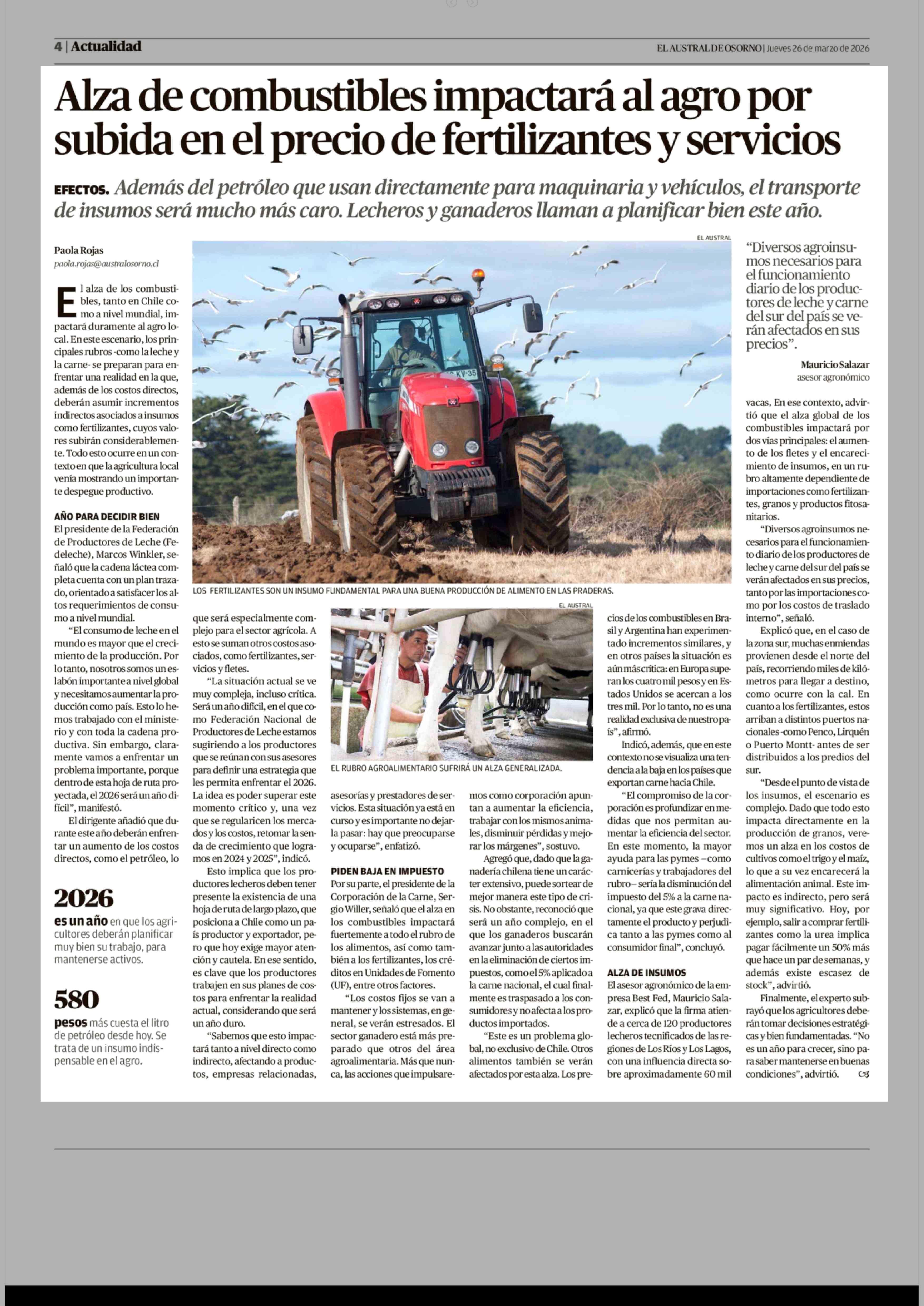 Alza de combustibles impactará al agro por subida en el precio de fertilizantes y servicios 26-03-2026 El Austral de Osorno |