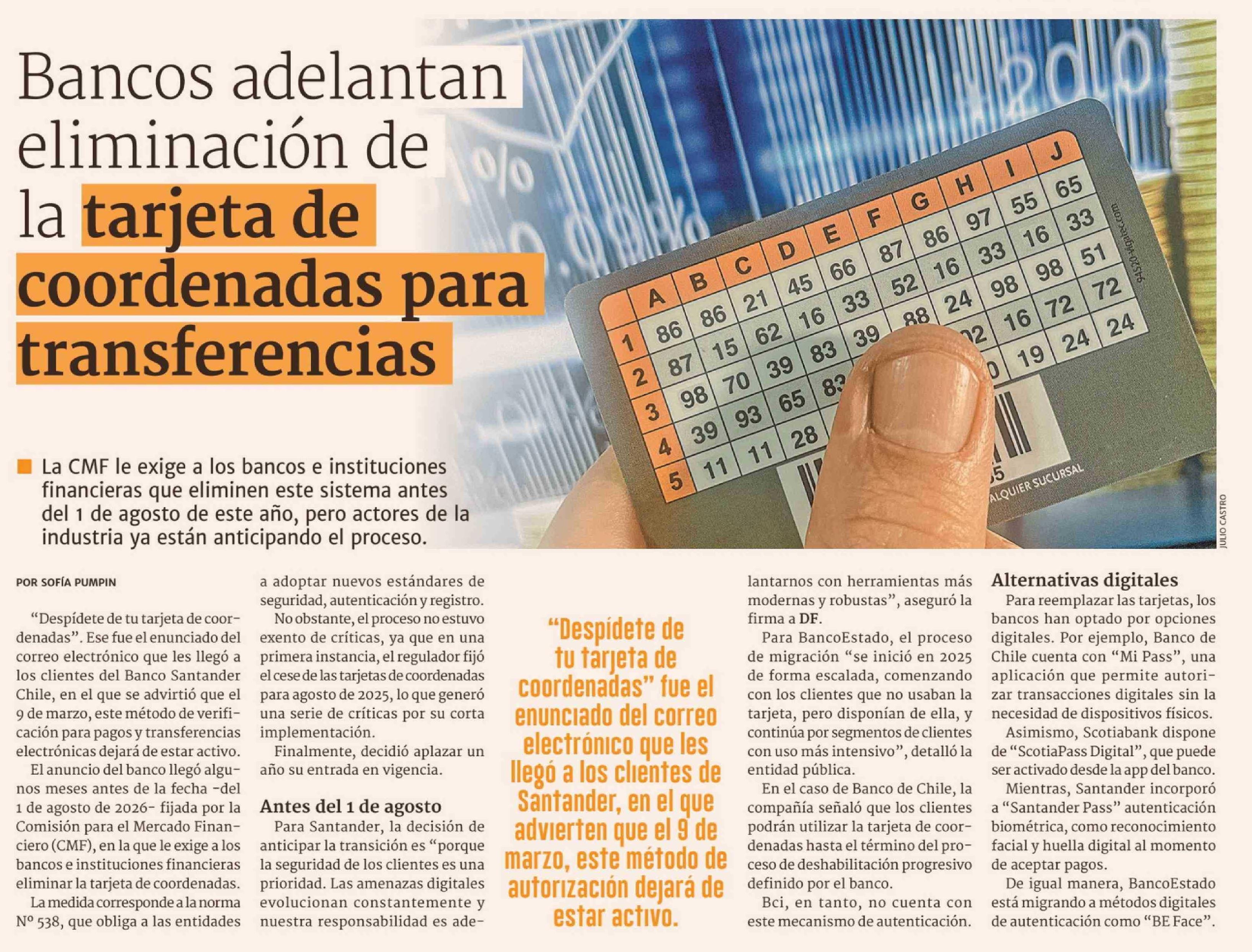 Bancos adelantan eliminación de % la tarjeta de coordenadas para transferencias 19-02-2026 Diario Financiero |
