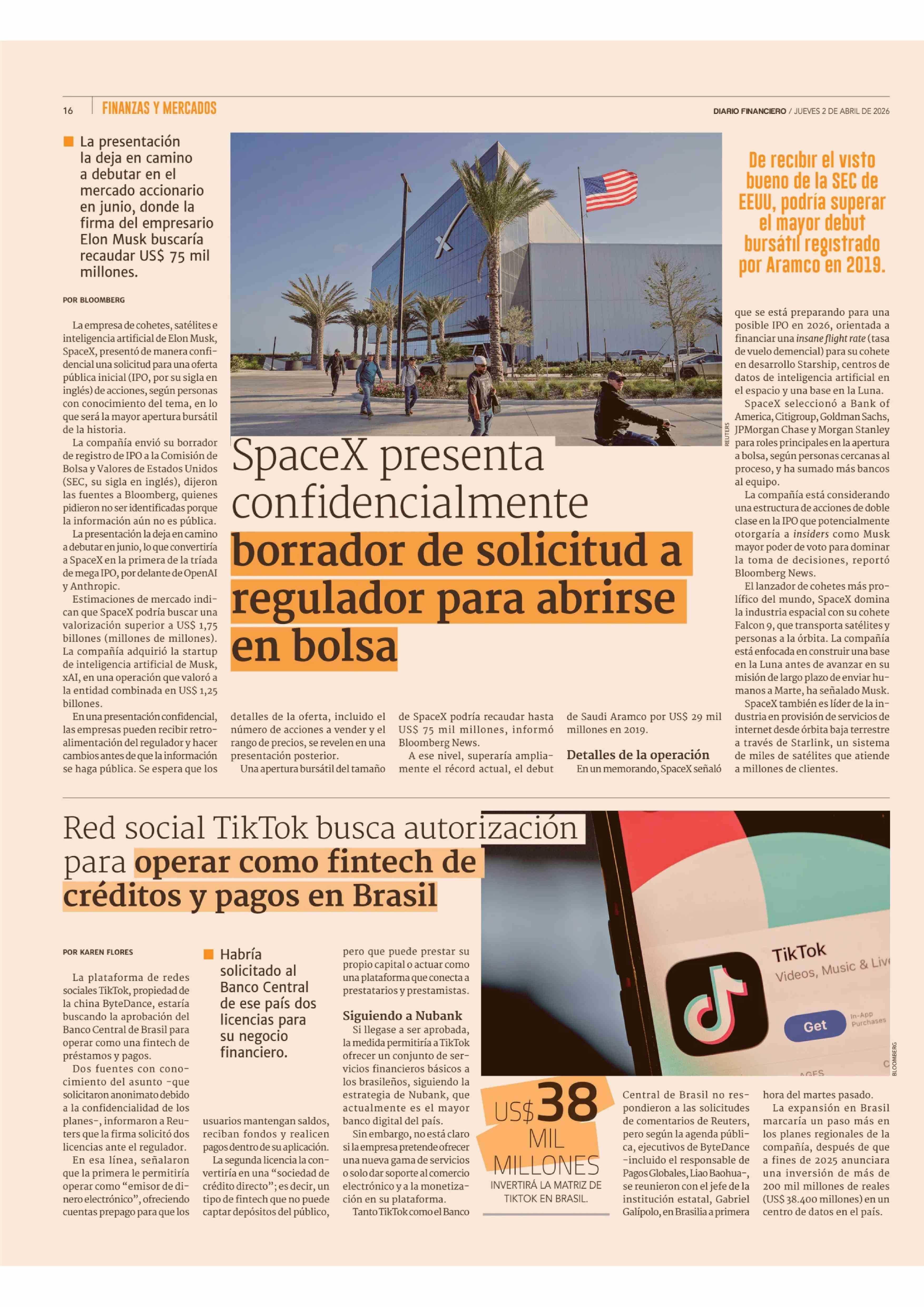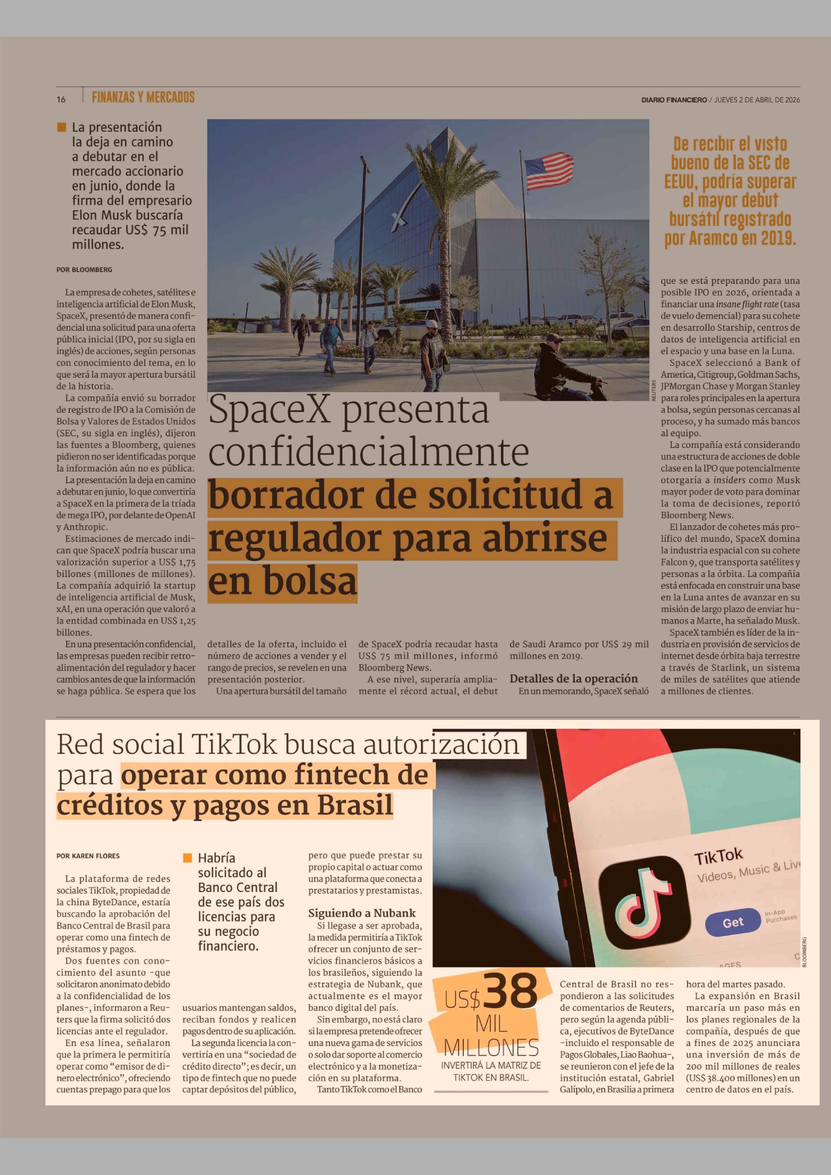 Red social TikTok busca autorización para operar como fintech de créditos y pagos en Brasil 02-04-2026 Diario Financiero |