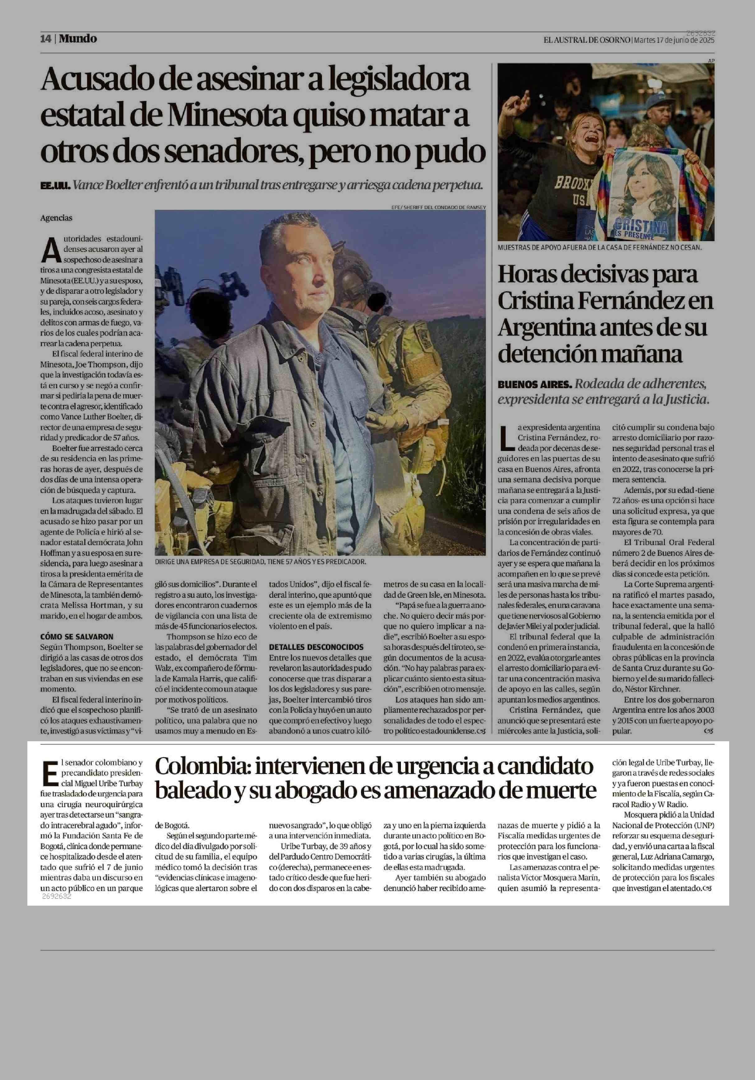 Colombia: intervienen de urgencia a candidato baleado y su abogado es amenazado de muerte 17-06-2025 El Austral de Osorno |
