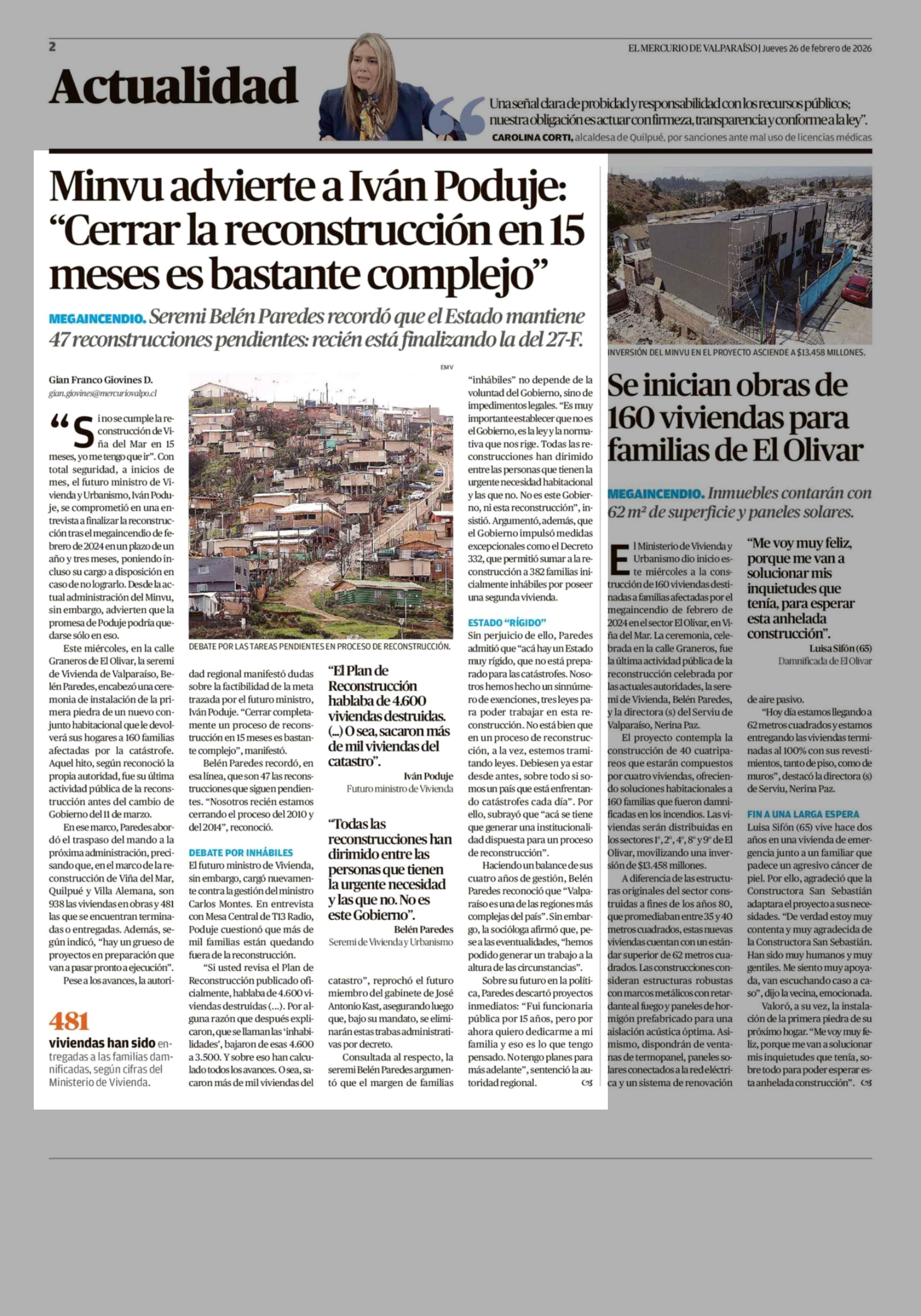 Minvu advierte a Iván Poduje: "Cerrar la reconstrucción en 15 meses es bastante complejo" 26-02-2026 El Mercurio de Valparaíso |