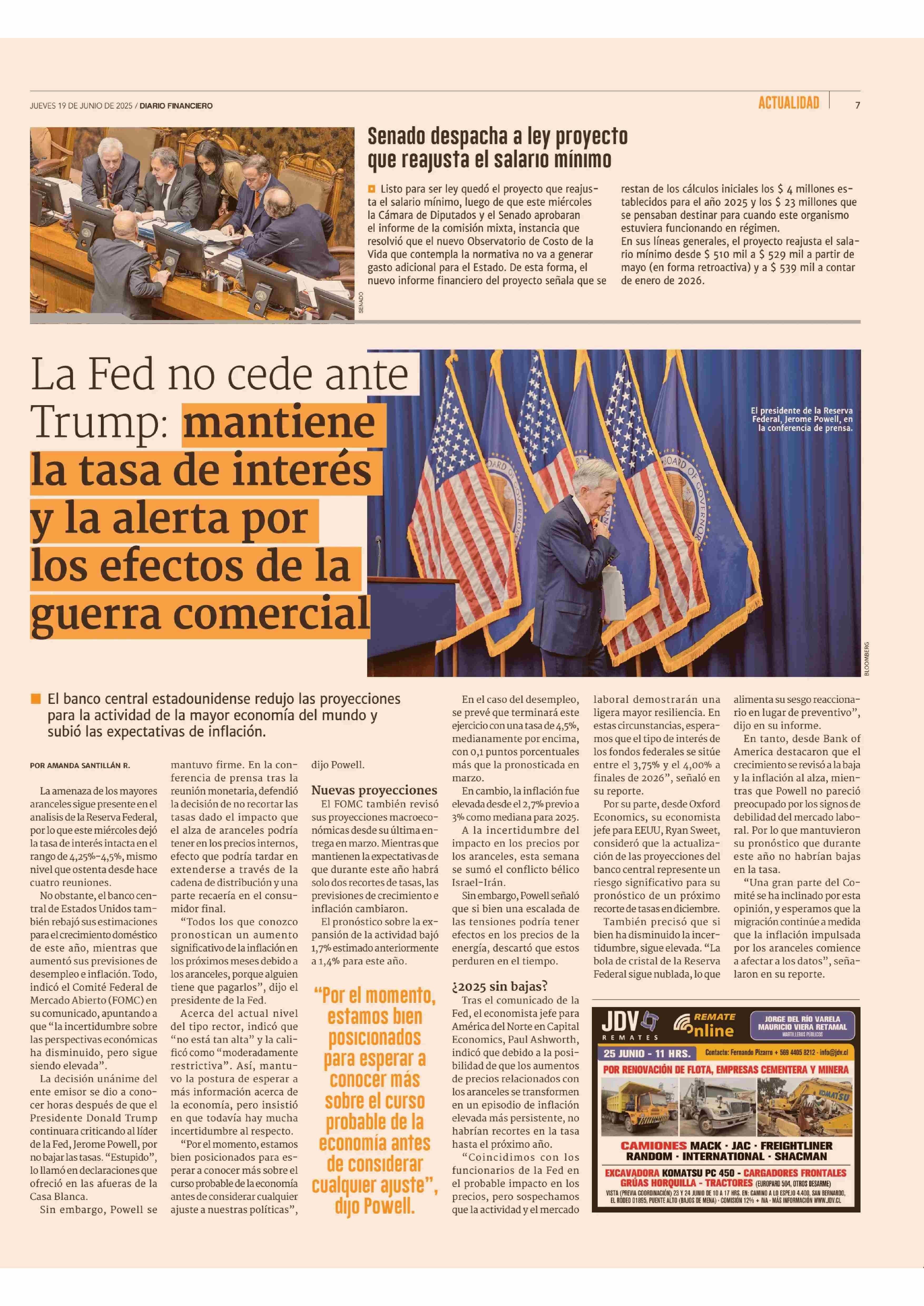 La Fed no cede ante Trump: mantiene la tasa de interés y la alerta por los efectos de la guerra comercia 19-06-2025 Diario Financiero |