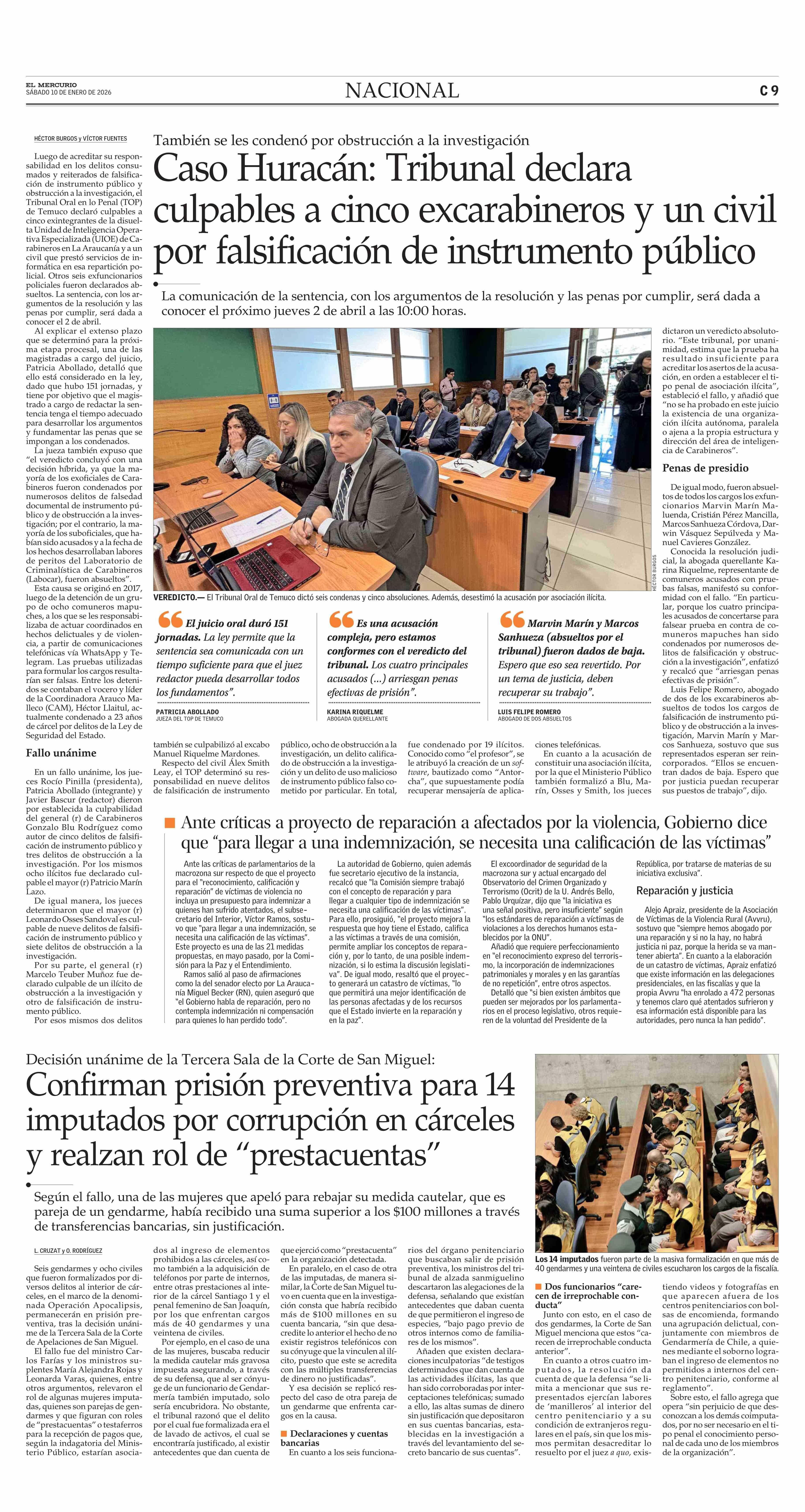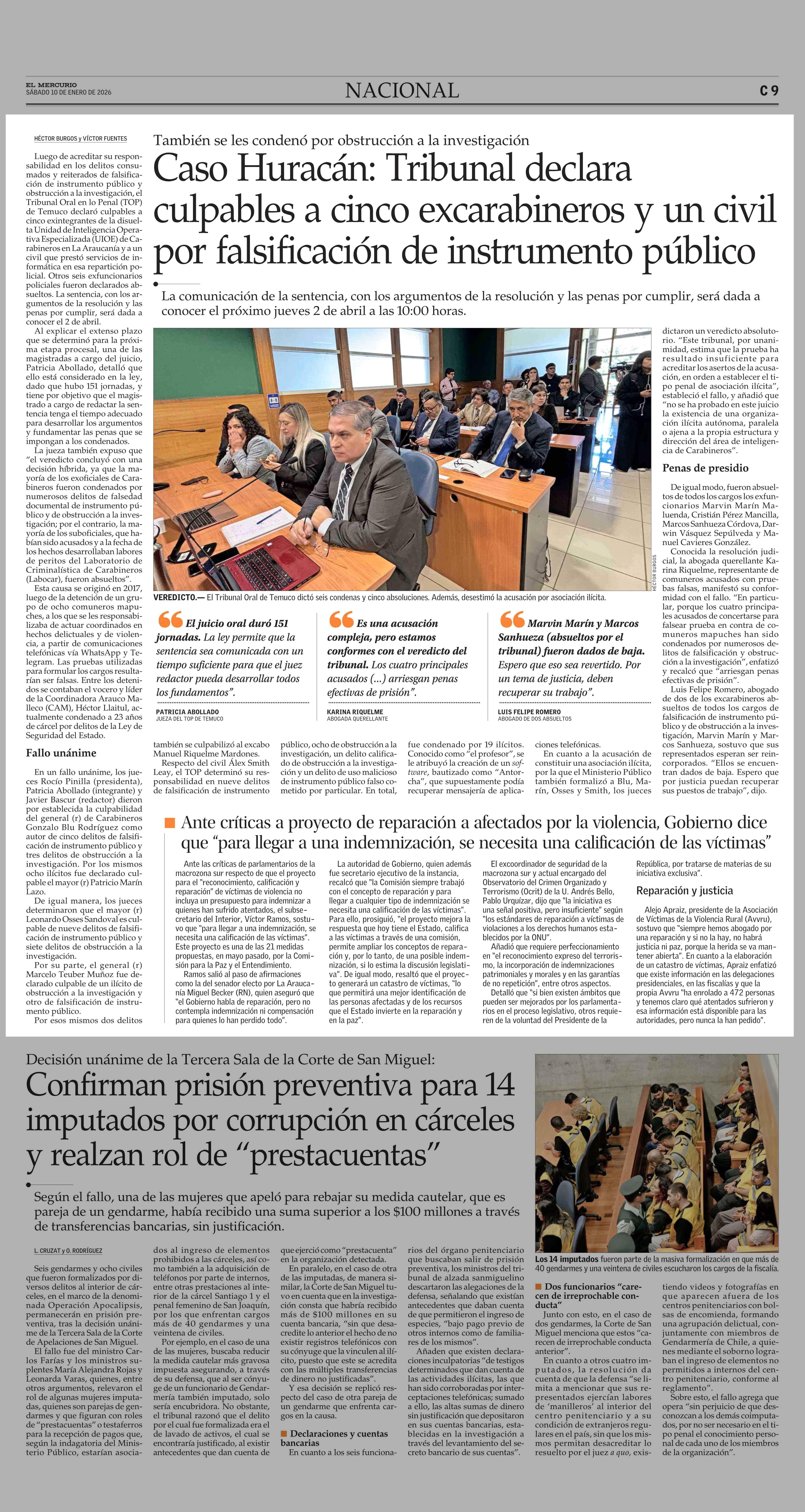 Caso Huracán: Tribunal declara culpables a cinco excarabineros y un civil por falsificación de instrumento público 10-01-2026 El Mercurio |