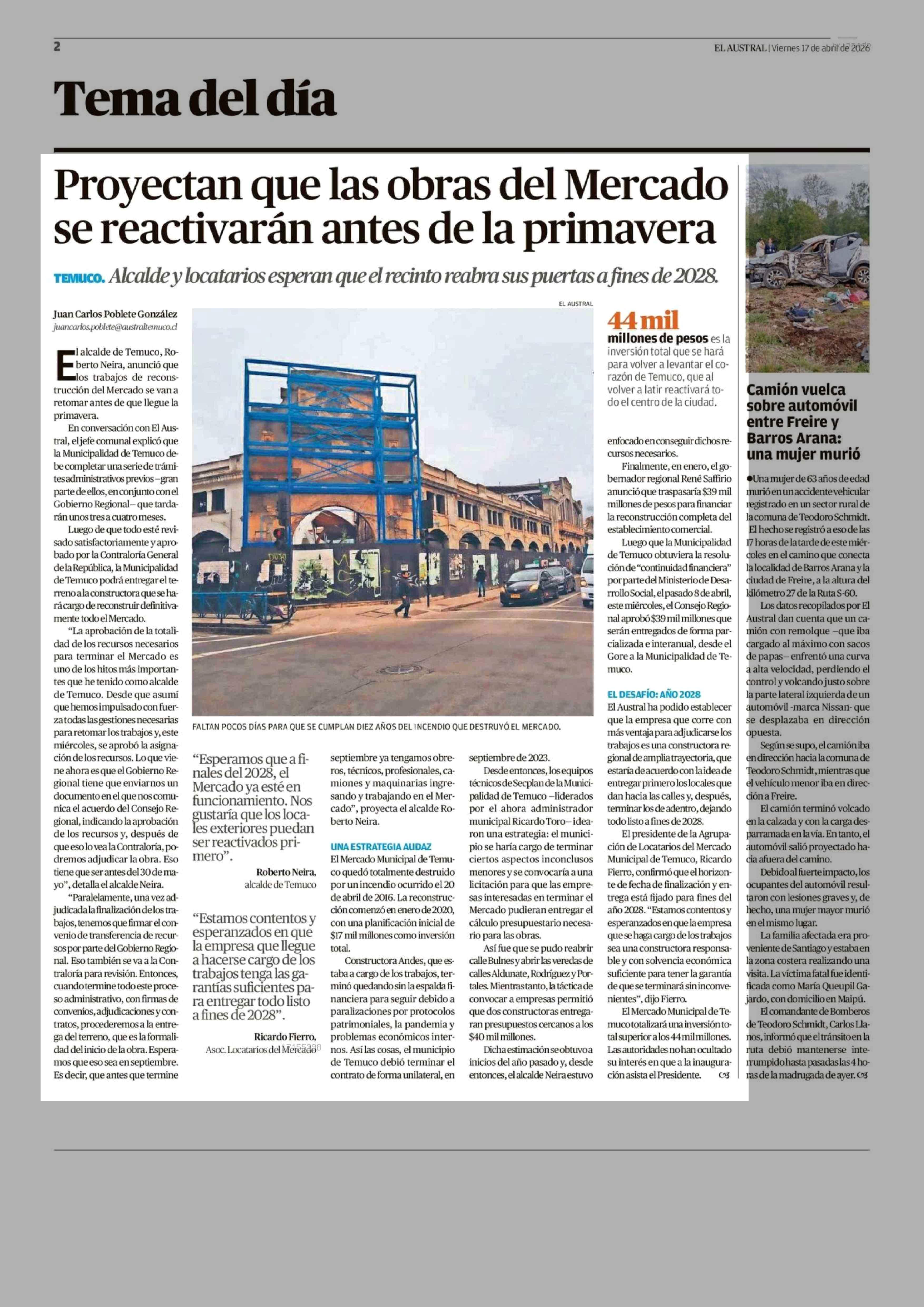 Proyectan que las obras del Mercado se reactivarán antes de la primavera 17-04-2026 El Austral de la Araucanía |