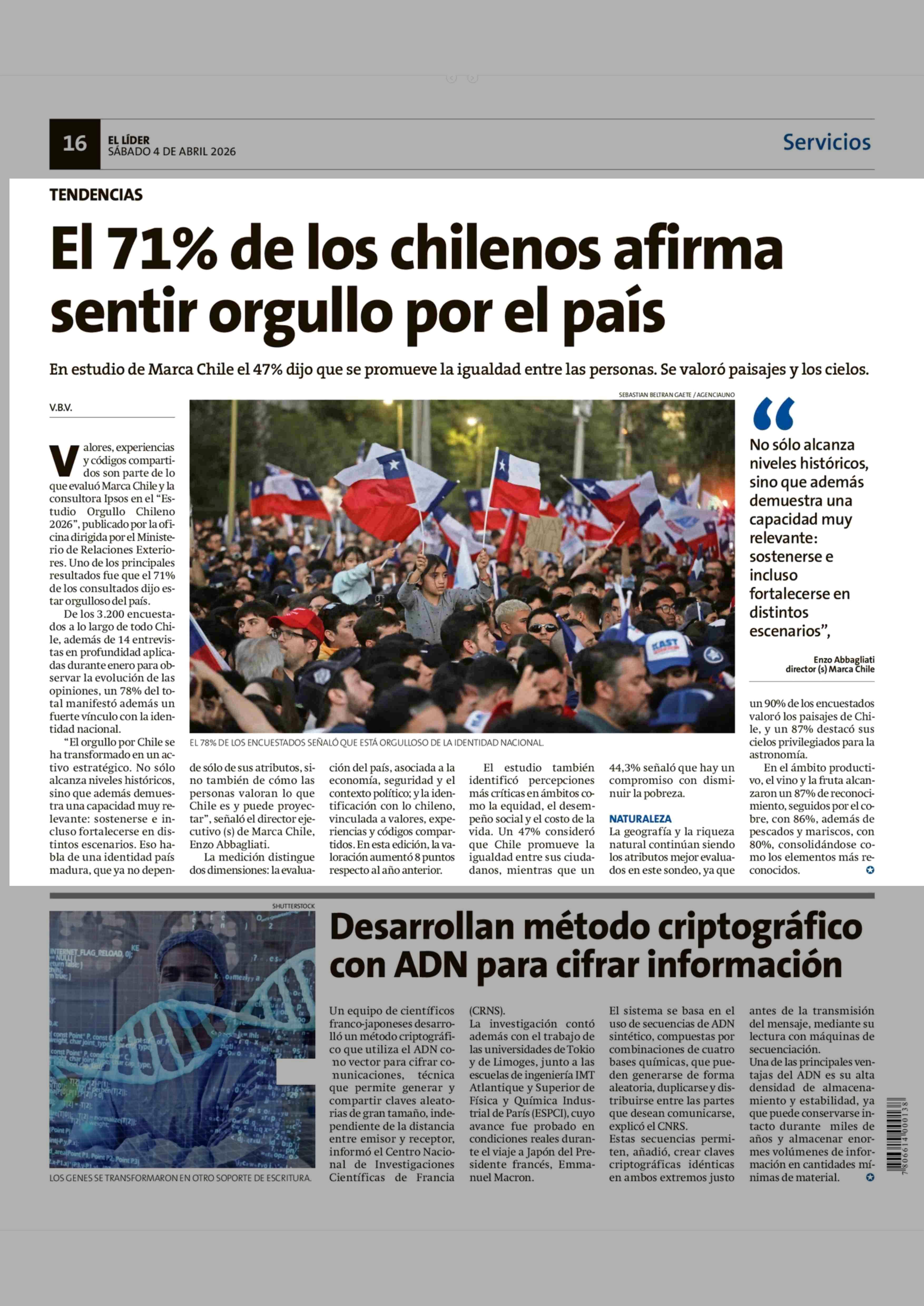 El 71% de los chilenos afirma sentir orgullo por el pais 04-04-2026 El Líder |