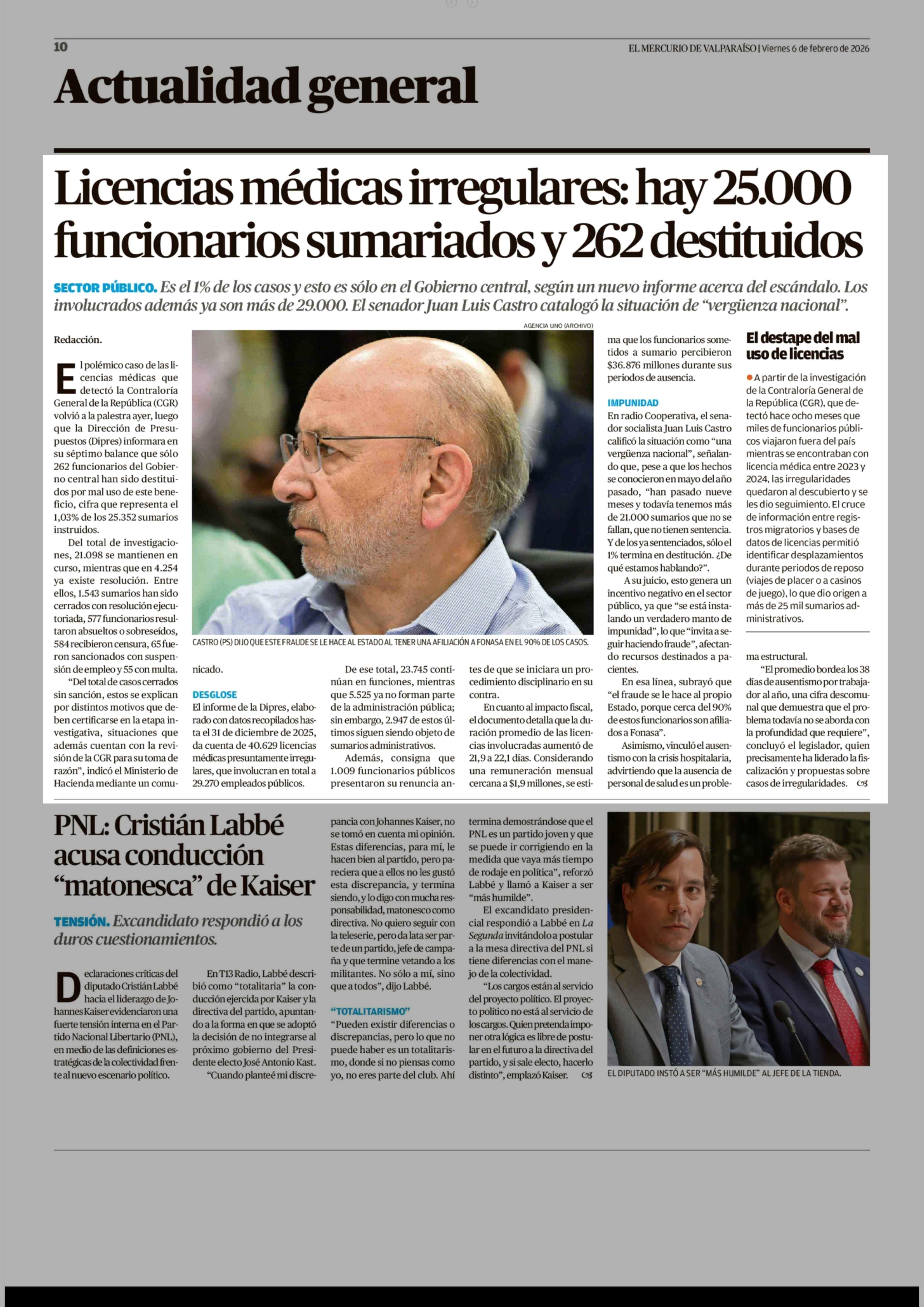 Licencias médicas irregulares: hay 25.000 funcionarios sumariados y 262 destituidos 06-02-2026 El Mercurio de Valparaíso |