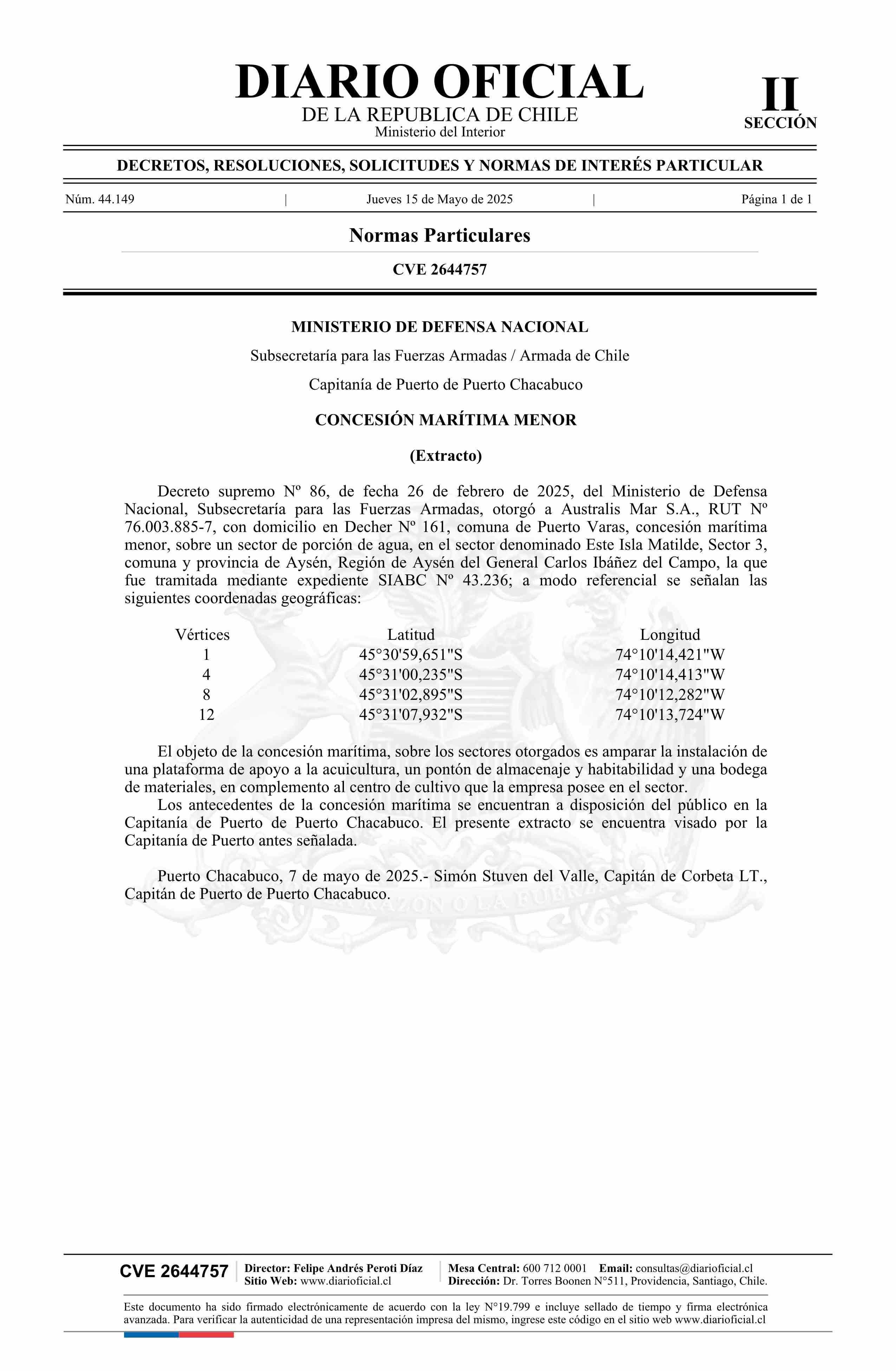 | Título: | Extracto de decreto número 86, de 2025.- Otorga concesión marítima menor |
