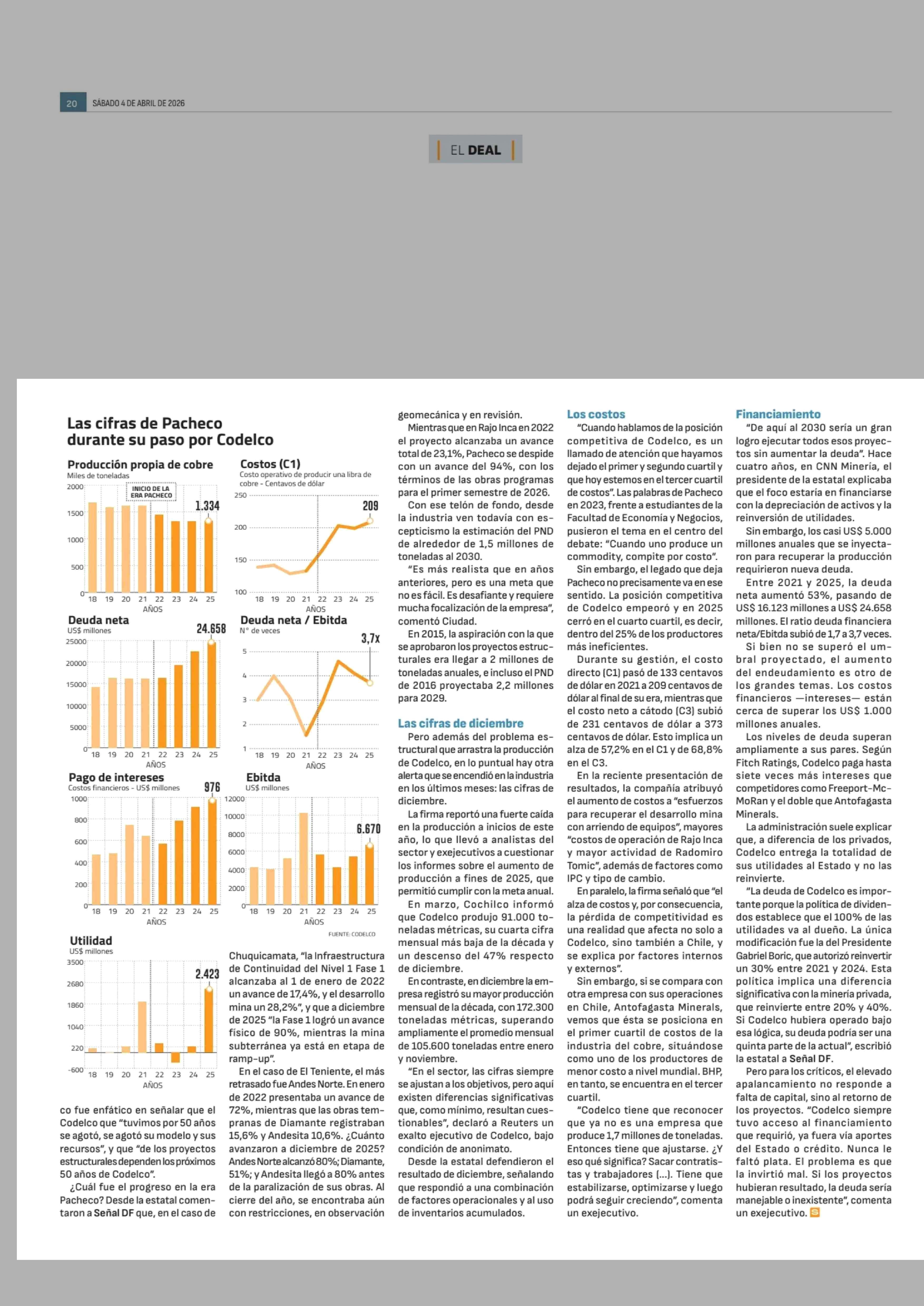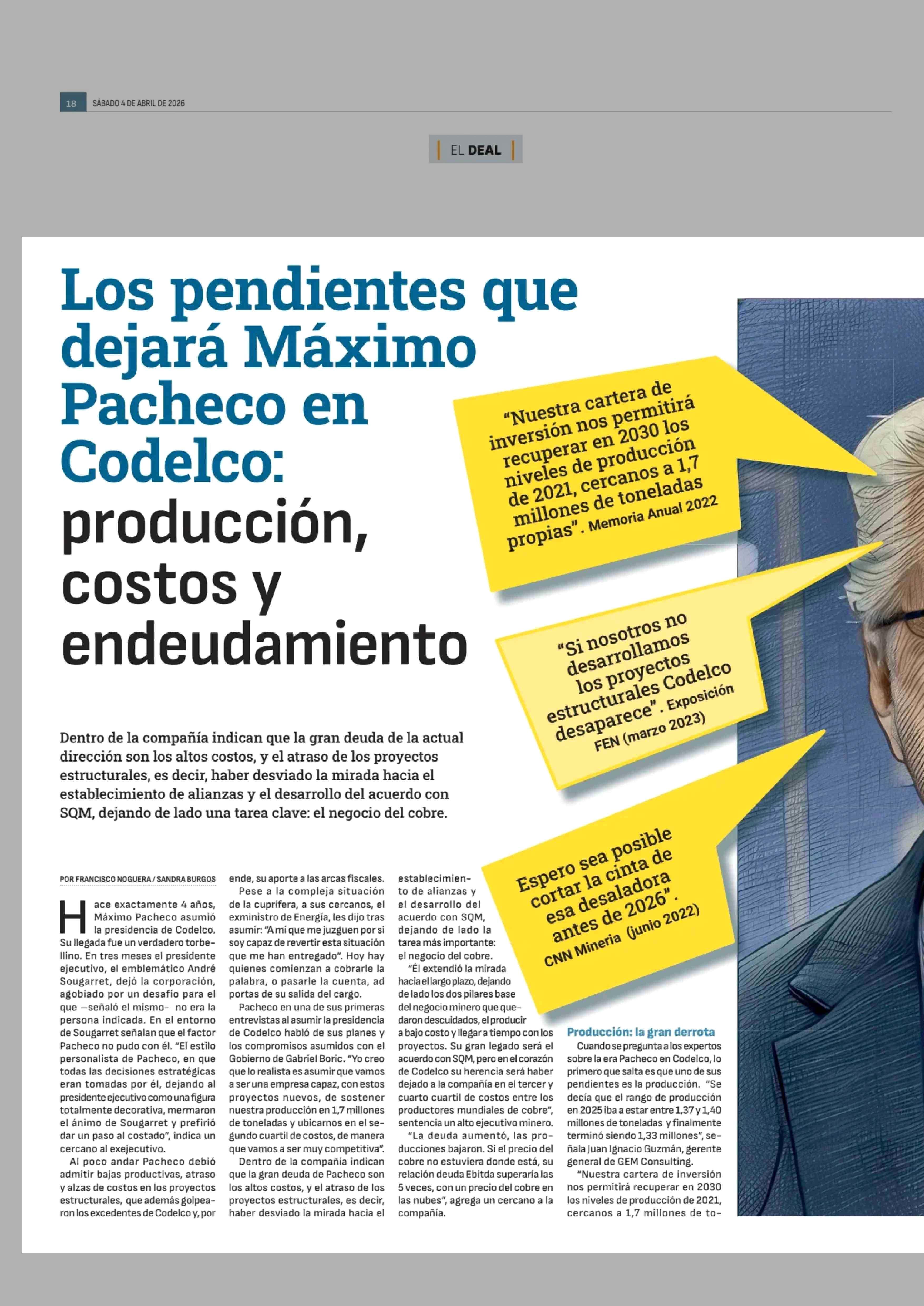 Los pendientes que dejara Maximo Pacheco en Codelco: producción, costos y endeudamiento 04-04-2026 Diario Financiero |