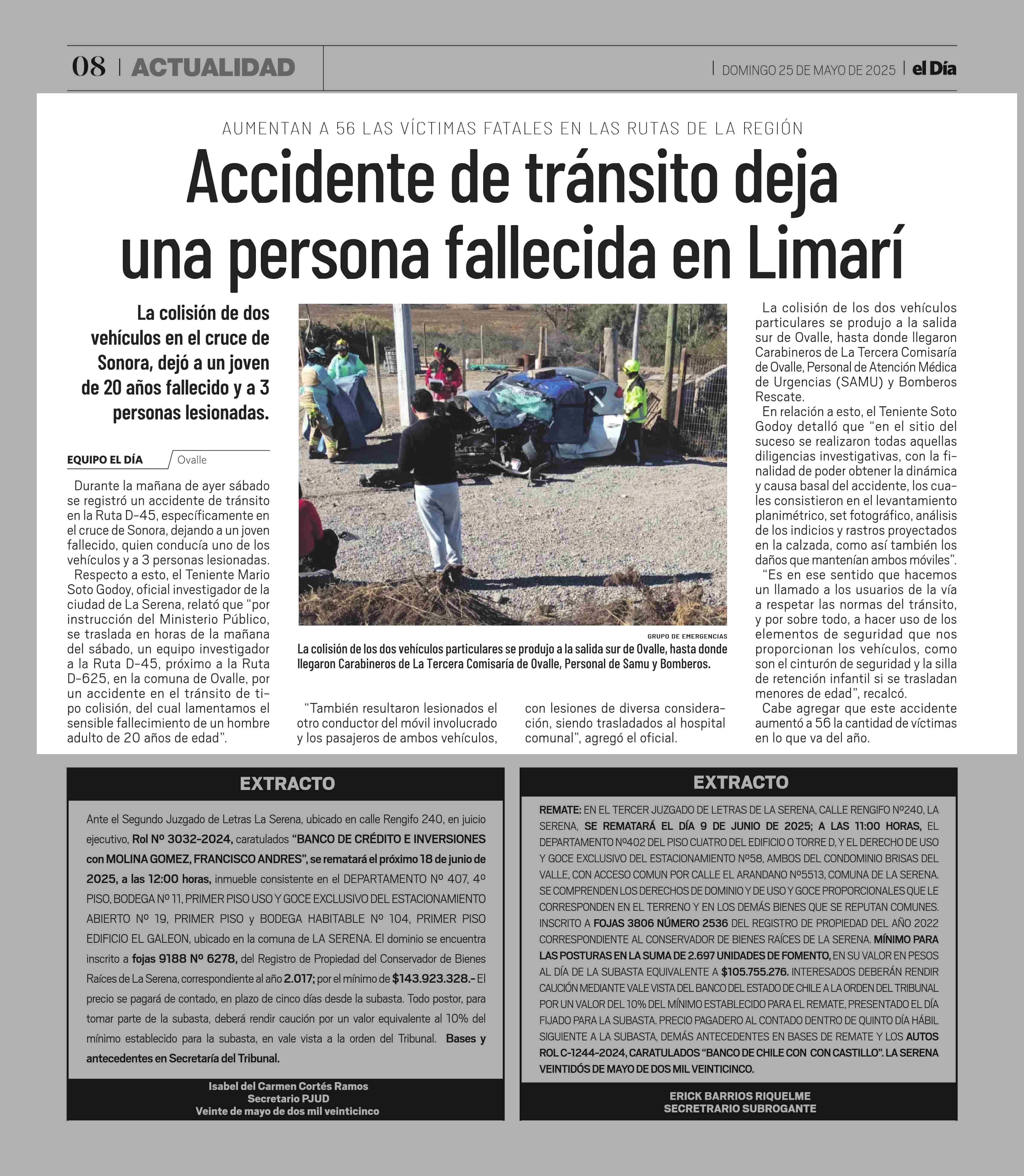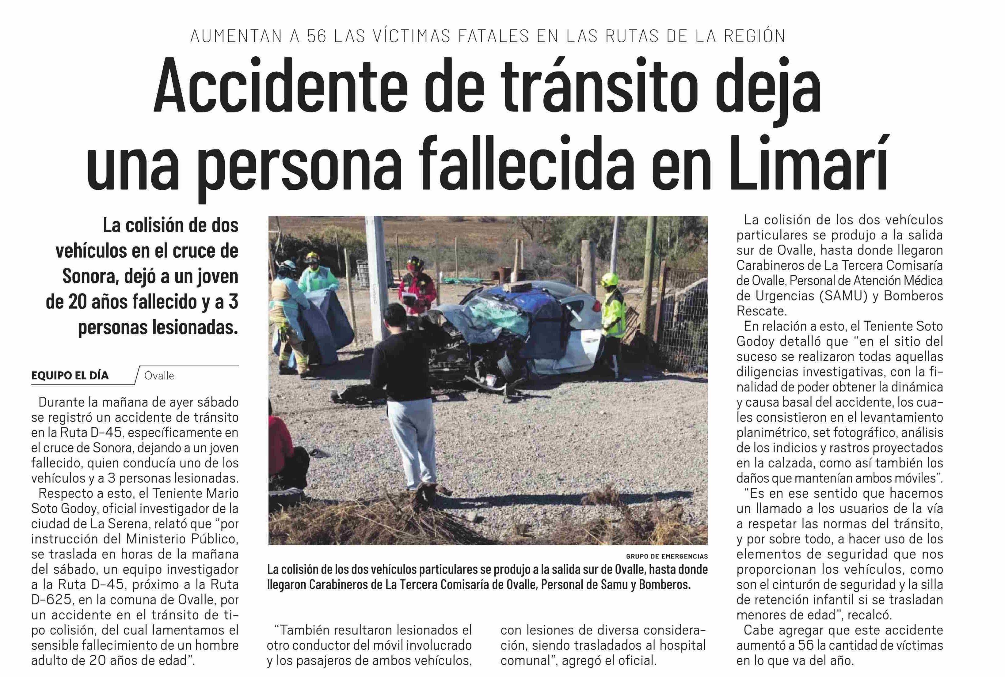 | Título: | Accidente de tránsito deja una persona fallecida en Limarí |