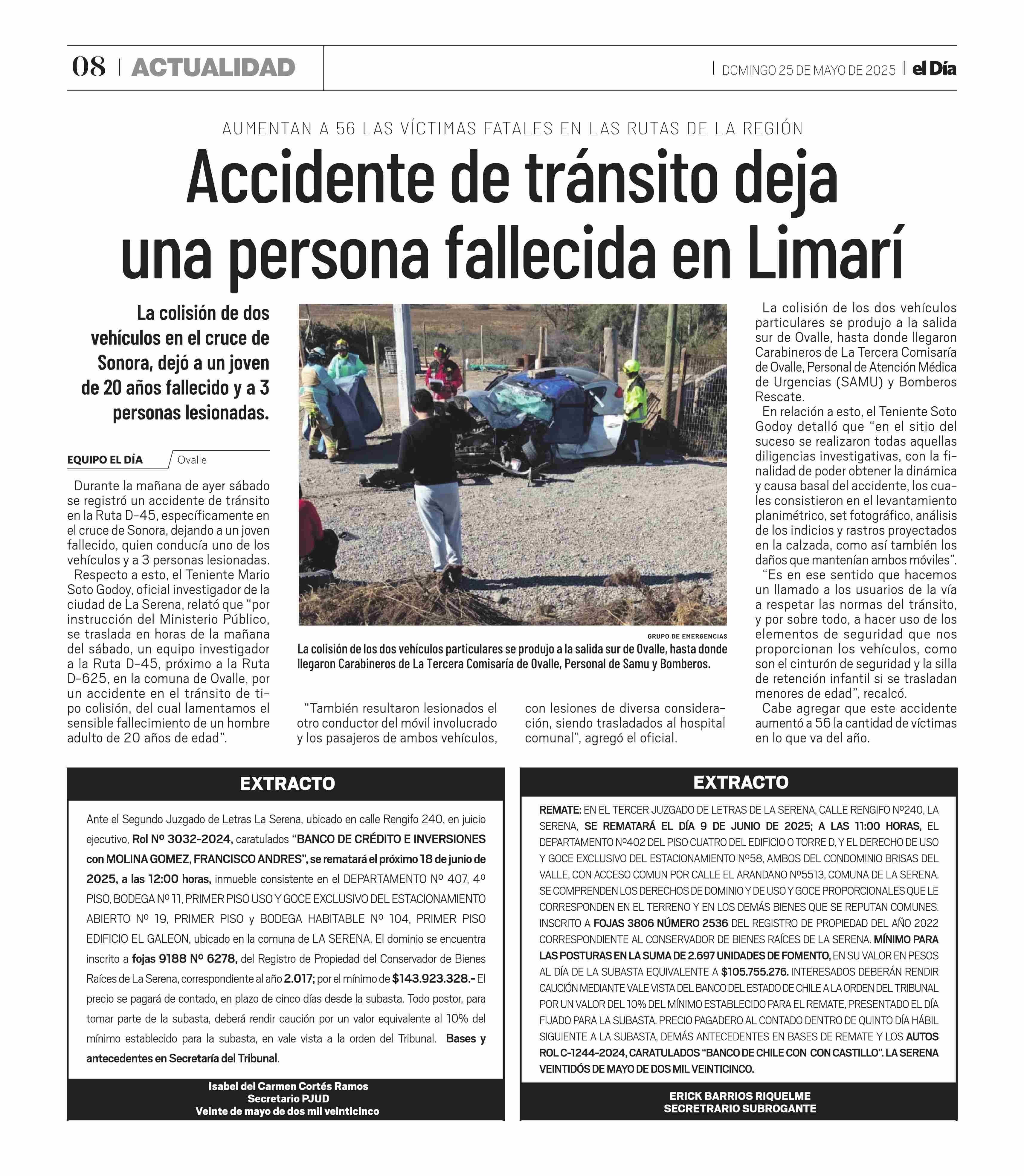 Accidente de tránsito deja una persona fallecida en Limarí 25-05-2025 El Día |