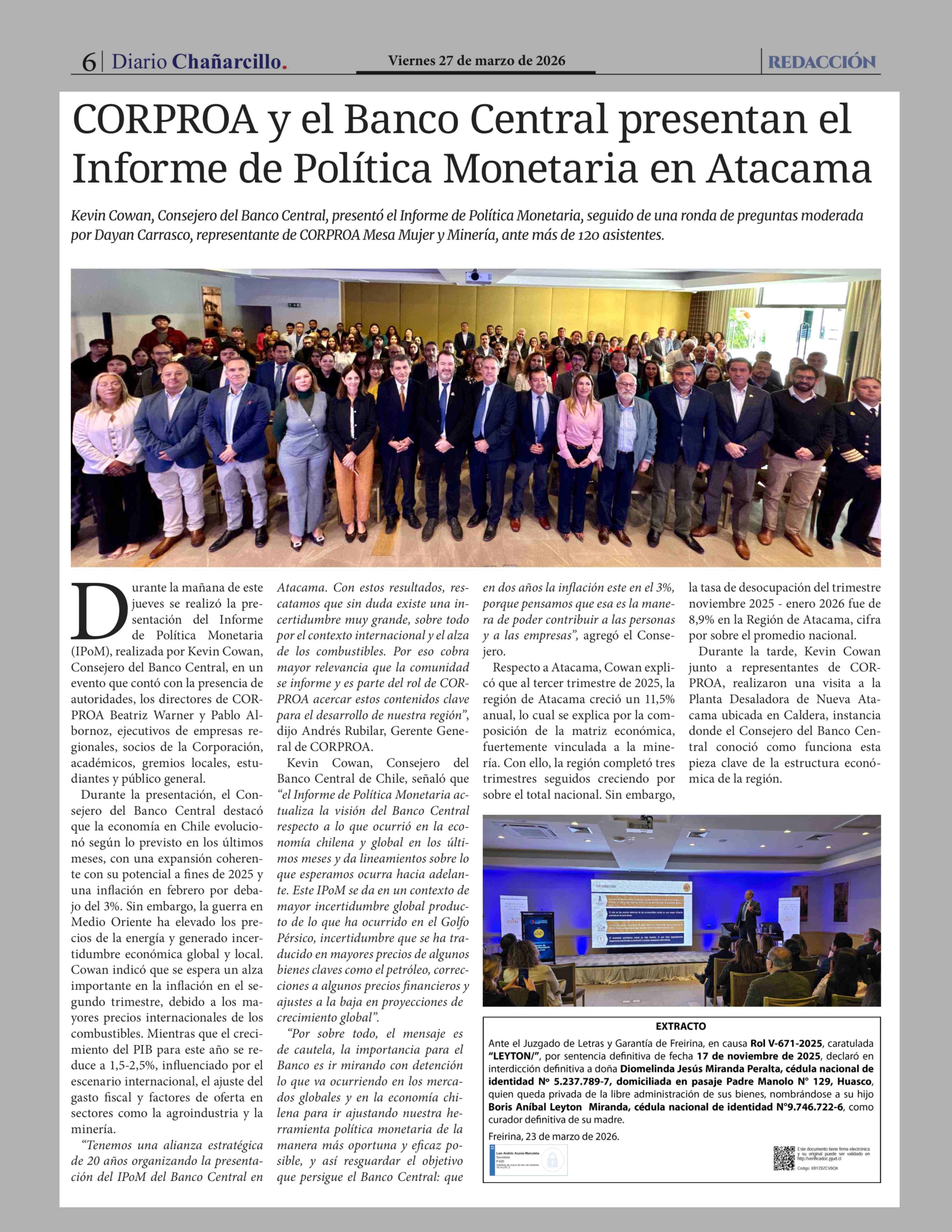 CORPROA y el Banco Central presentan el Informe de Política Monetaria en Atacama 27-03-2026 Diario Chañarcillo |