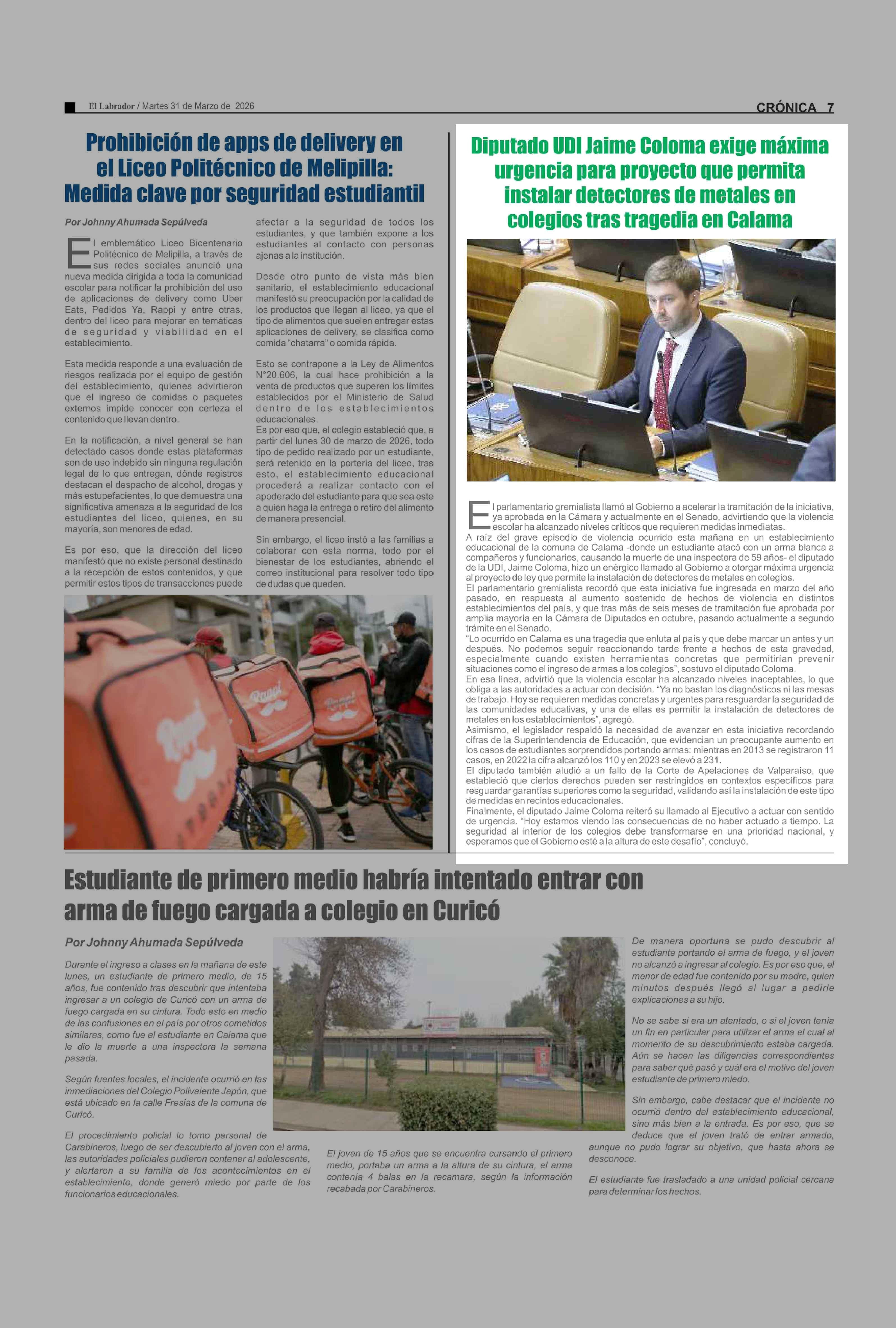 Diputado UDI Jaime Coloma exige máxima urgencia para proyecto que permita instalar detectores de metales en colegios tras tragedia en Calama 31-03-2026 El Labrador |