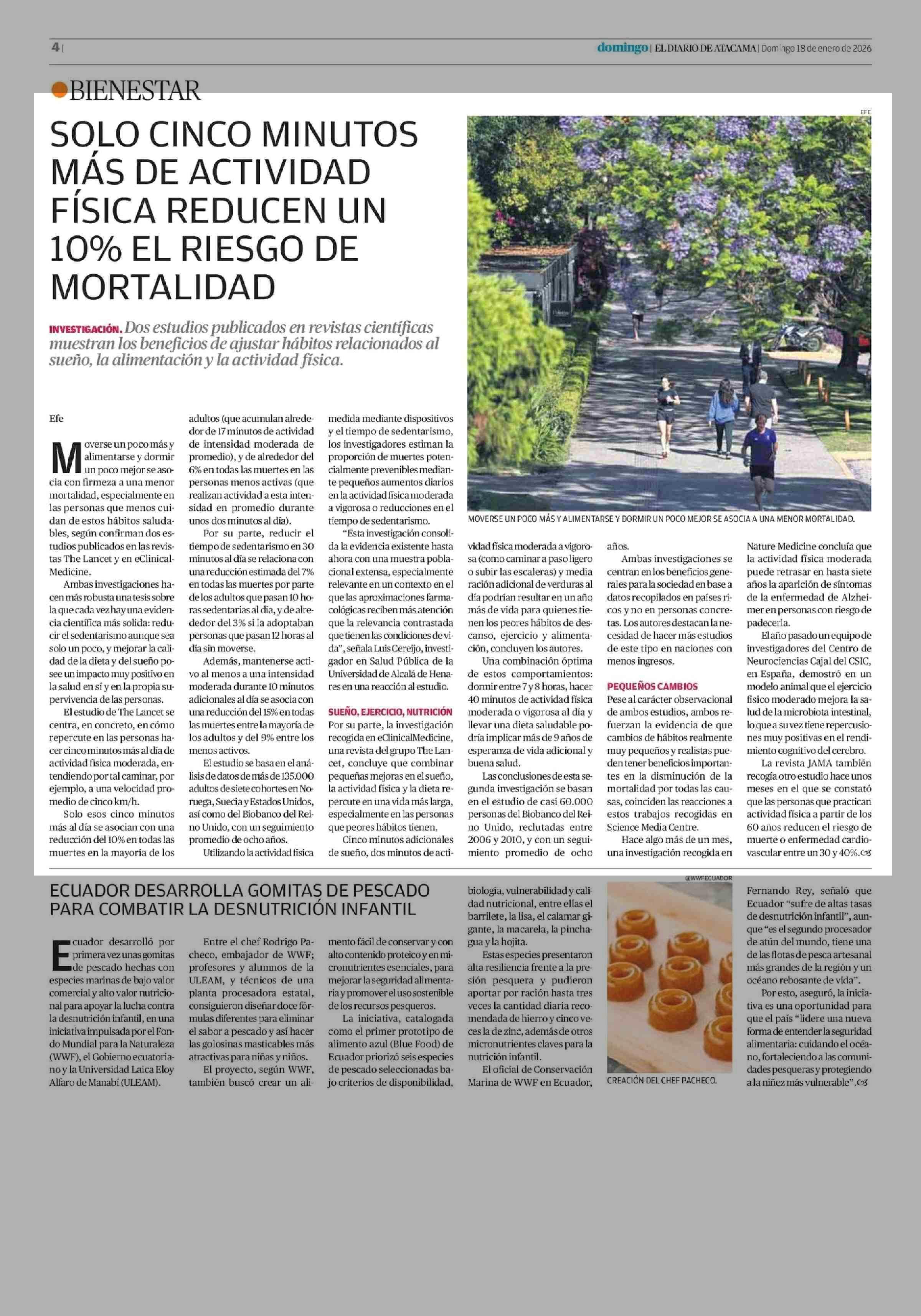 SOLO CINCO MINUTOS MÁS DE ACTIVIDAD FÍSICA REDUCEN UN 10% EL RIESGO DE MORTALIDAD 18-01-2026 El Diario de Atacama |