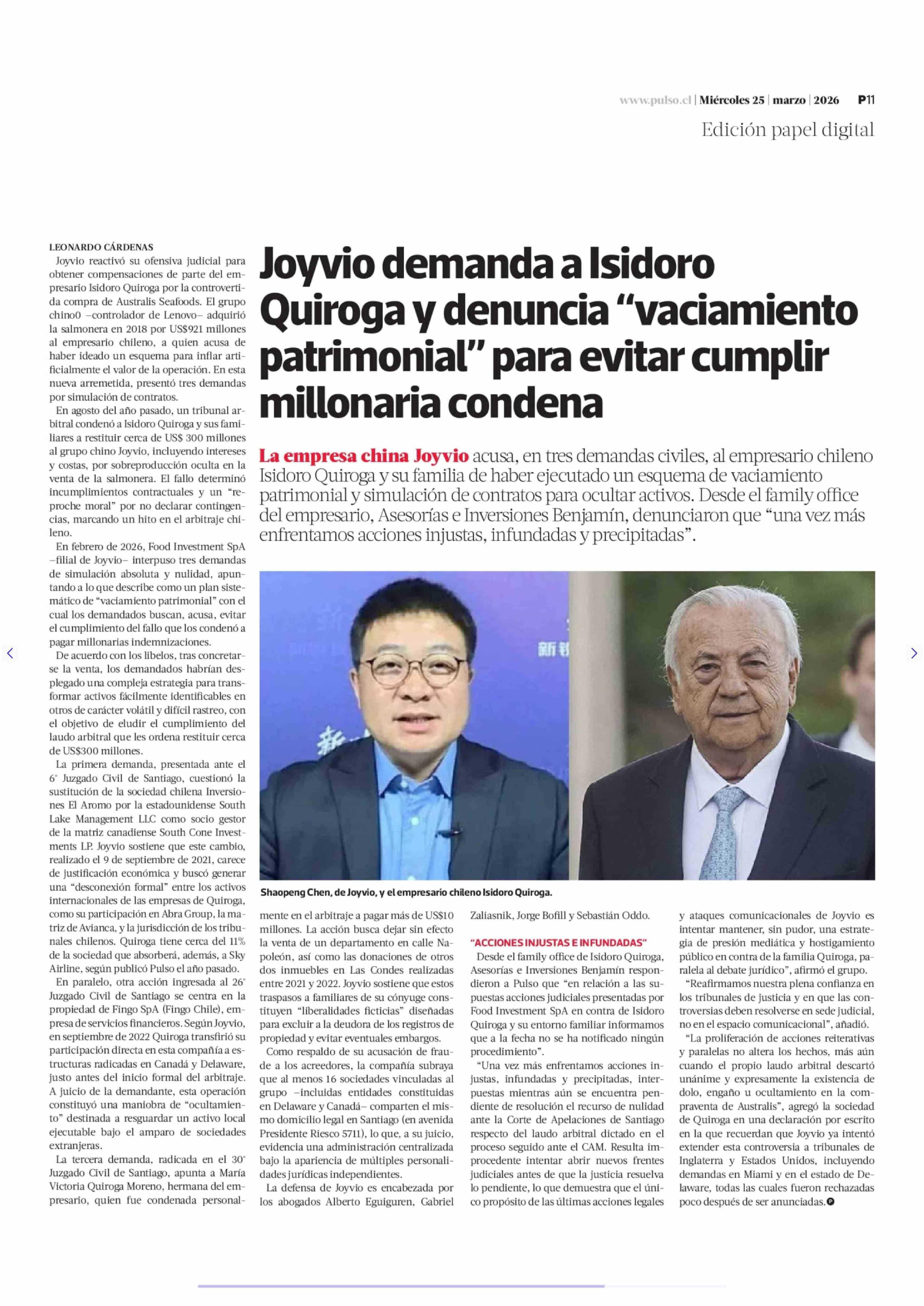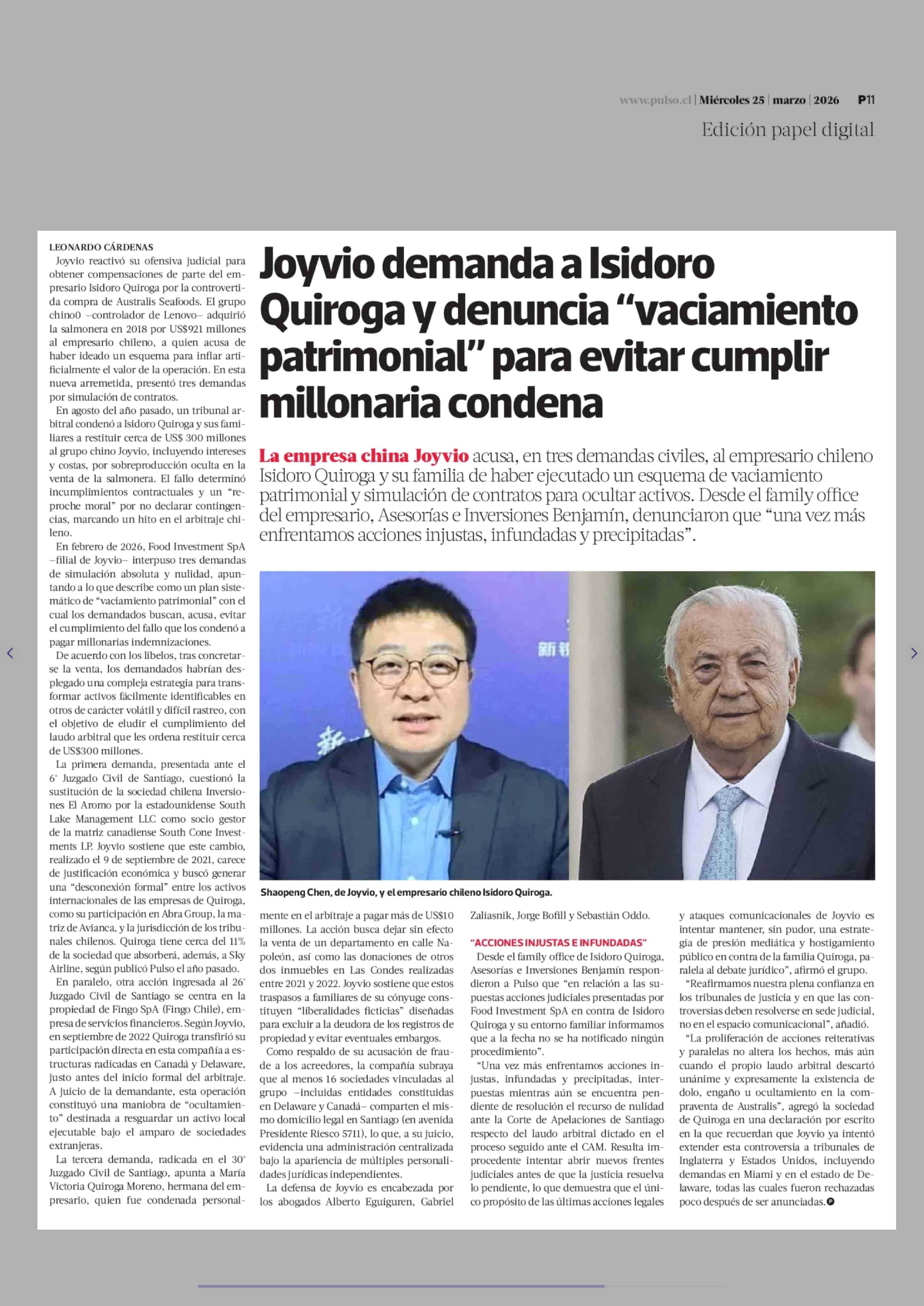 Título: Joyvio demanda a Isidoro Quiroga y denuncia "vaciamiento patrimonial" para evitar cumplir millonaria condena
