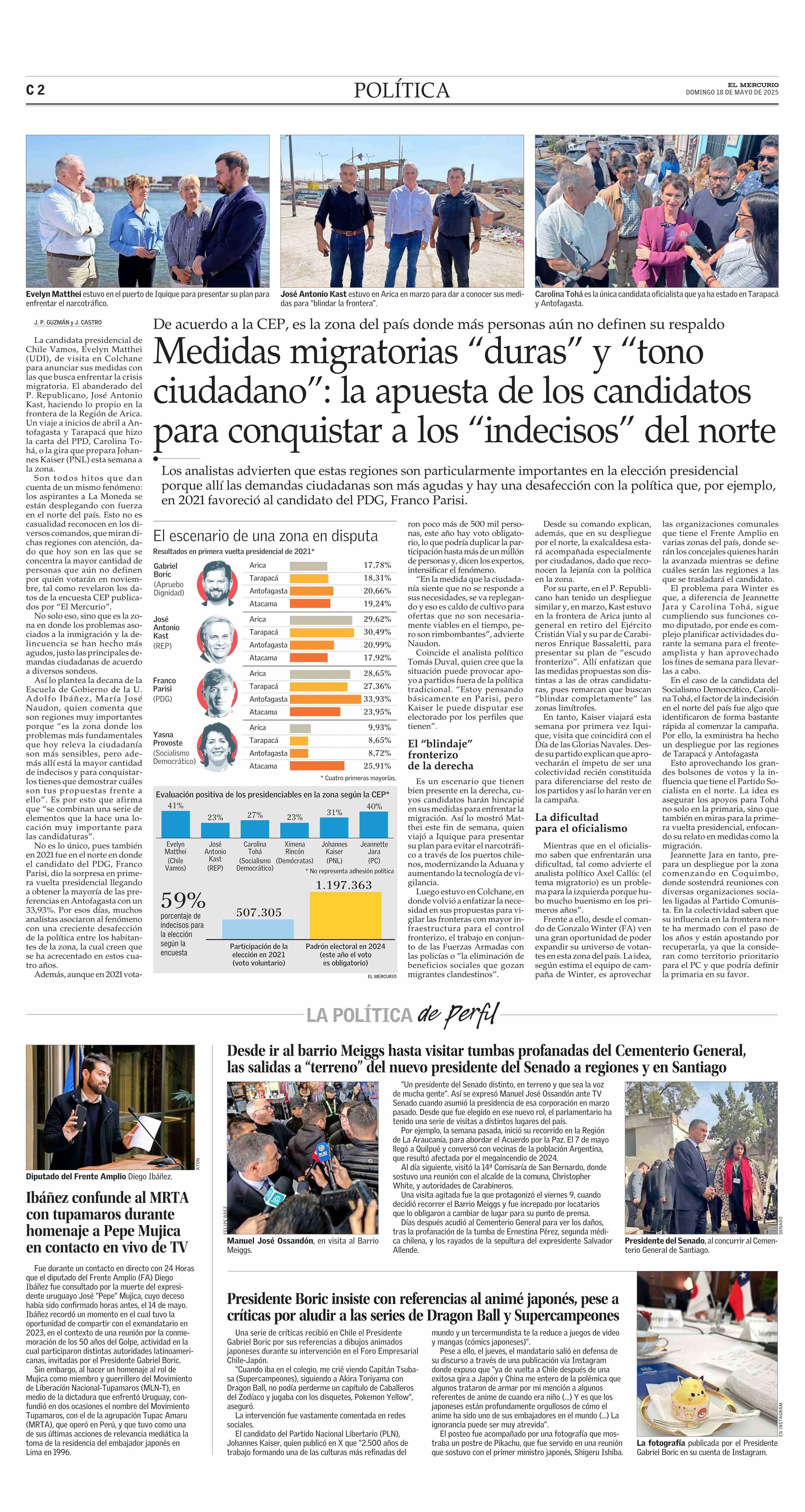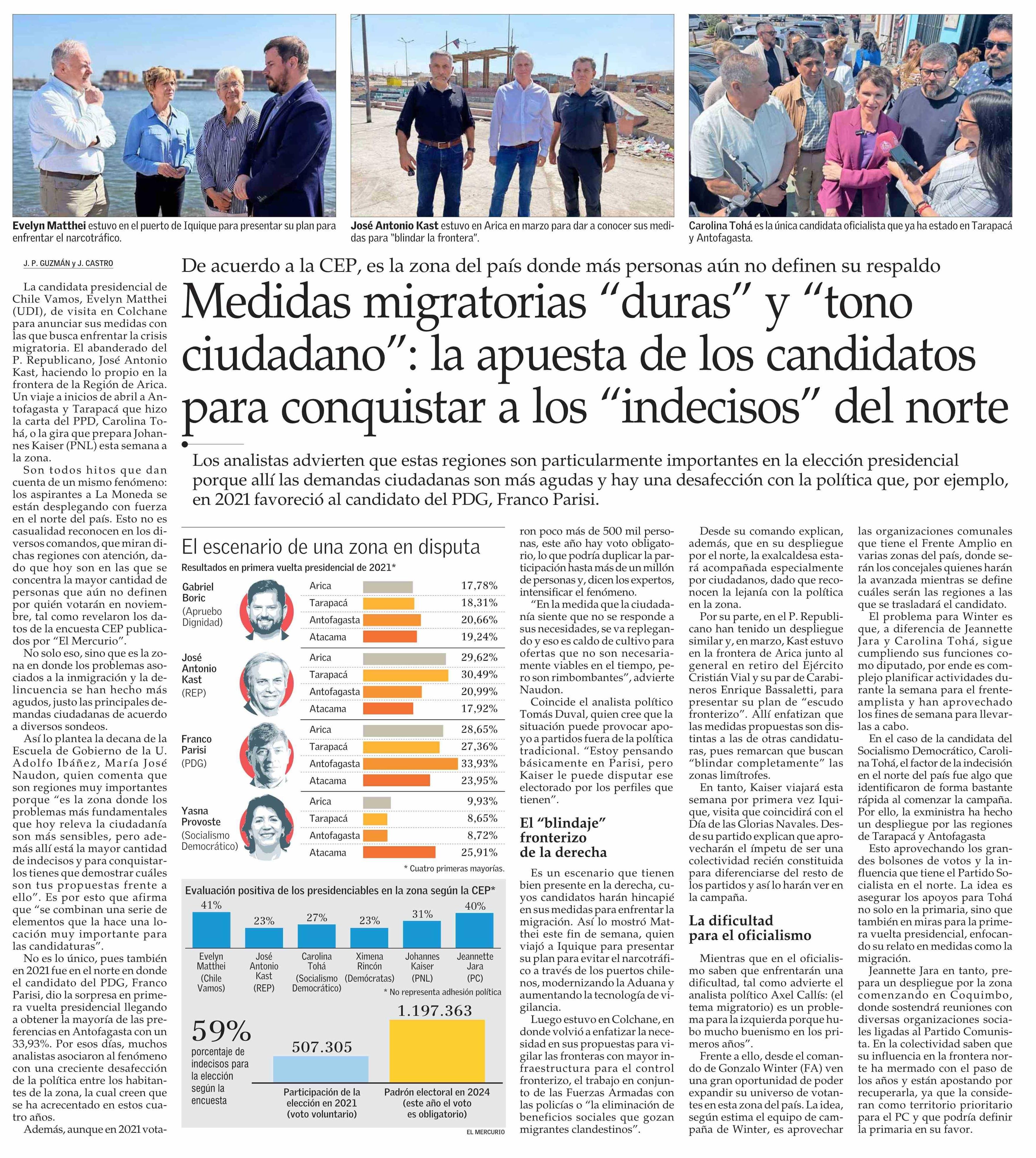 Medidas migratorias “duras” y “tono ciudadano”: la apuesta de los candidatos para conquistar a los “indecisos” del norte 18-05-2025 El Mercurio |