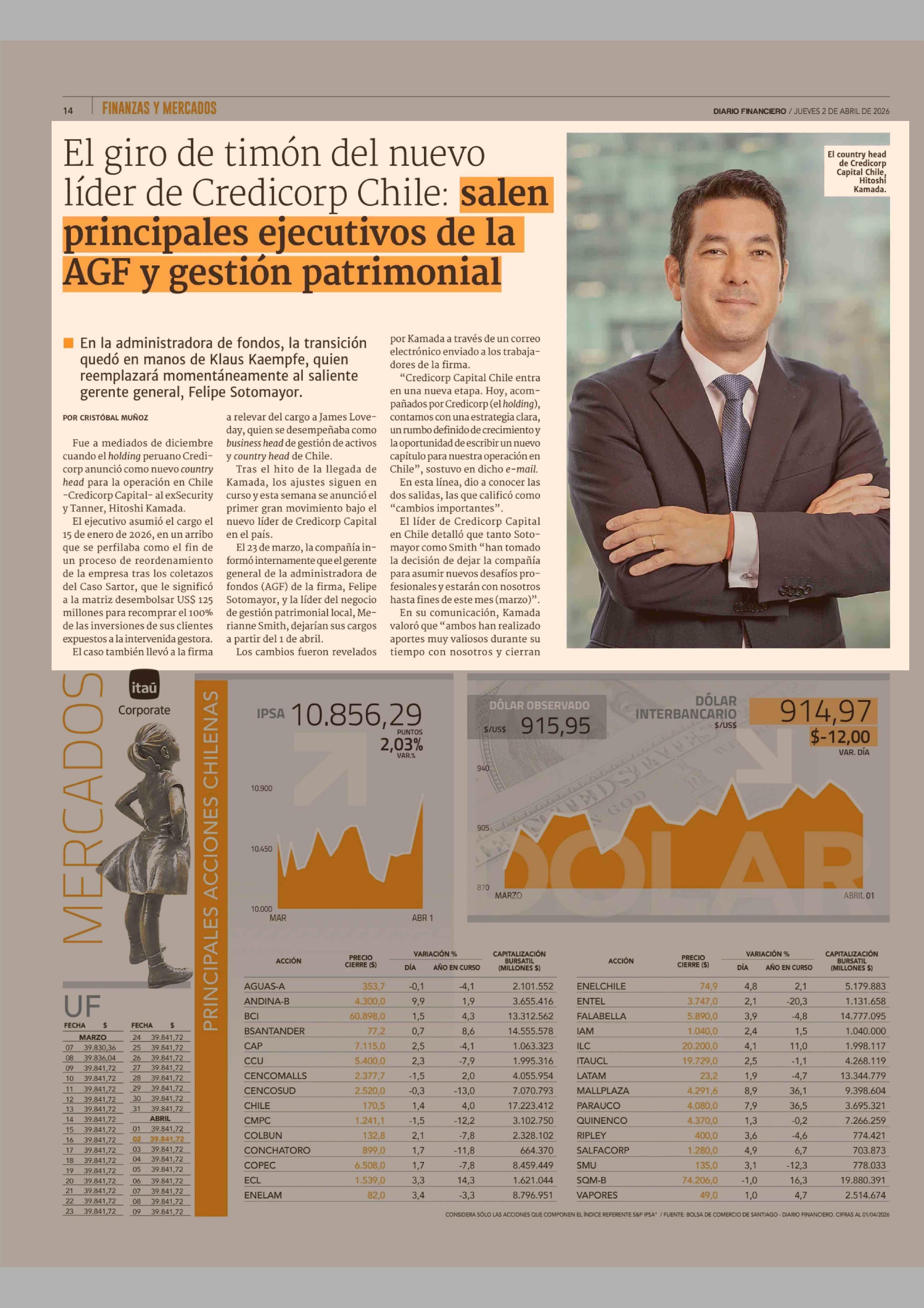 El giro de timón del nuevo líder de Credicorp Chile: salen principales ejecutivos de la AGF y gestión patrimonial 02-04-2026 Diario Financiero |